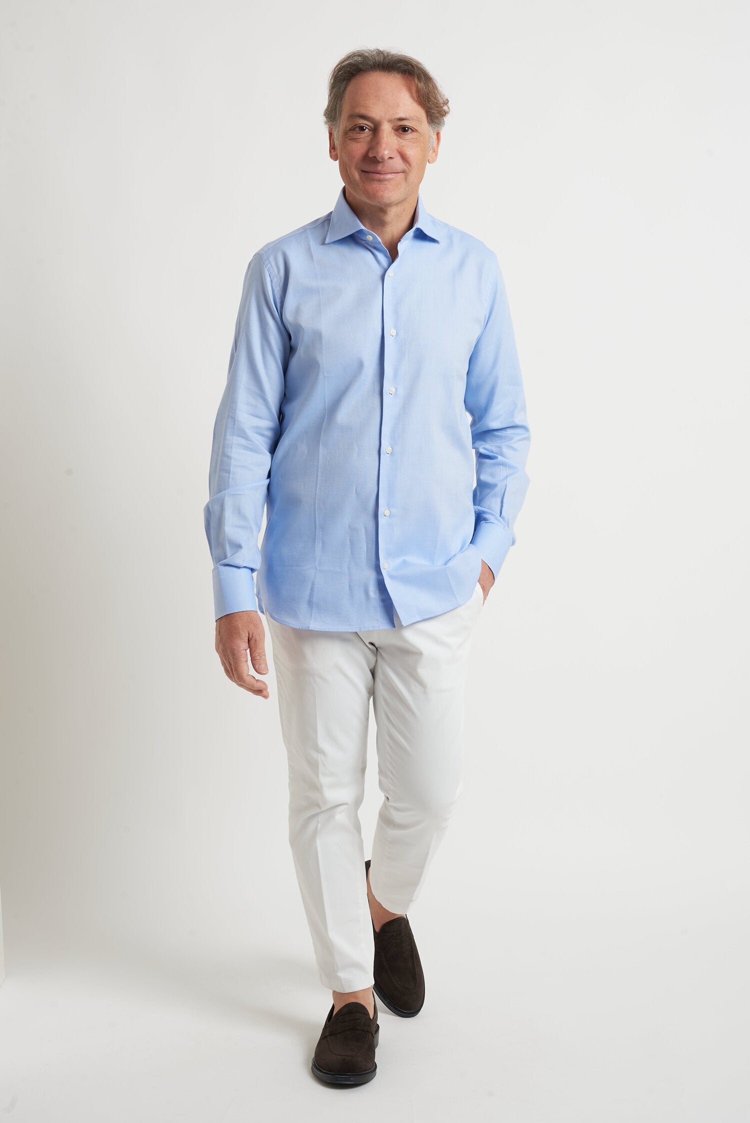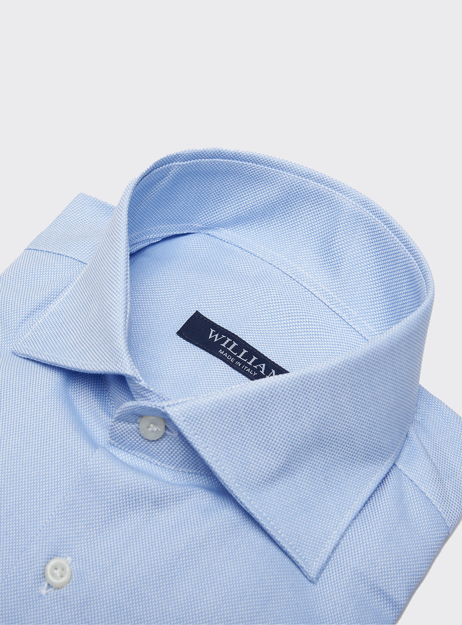 Camicia WILLIAM tinta unita realizzata in puro cotone di alta qualità con trama nido d'ape. Il collo è modello mezzo francese con pistagna di 3,5 cm di altezza, rigido e con stecche interne. È realizzata con 2 pinces dietro la schiena. Il polso è caratterizzato dall'avere 2 asole ed 1 bottone...lo puoi abbottonare normalmente oppure puoi scegliere di indossare igemelli. La vestibilità è regolare ma contemporanea. Composizione: 100% cotone.