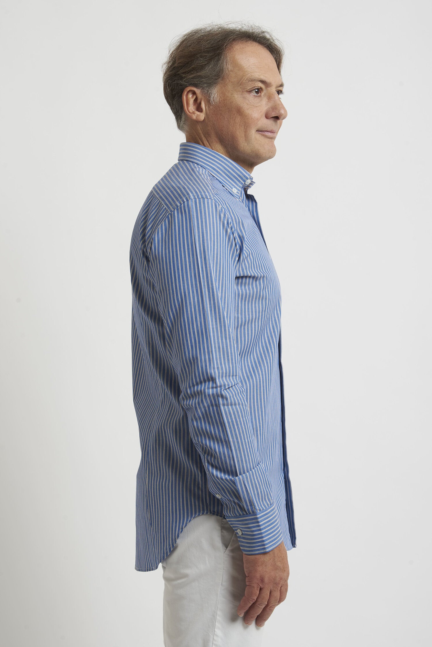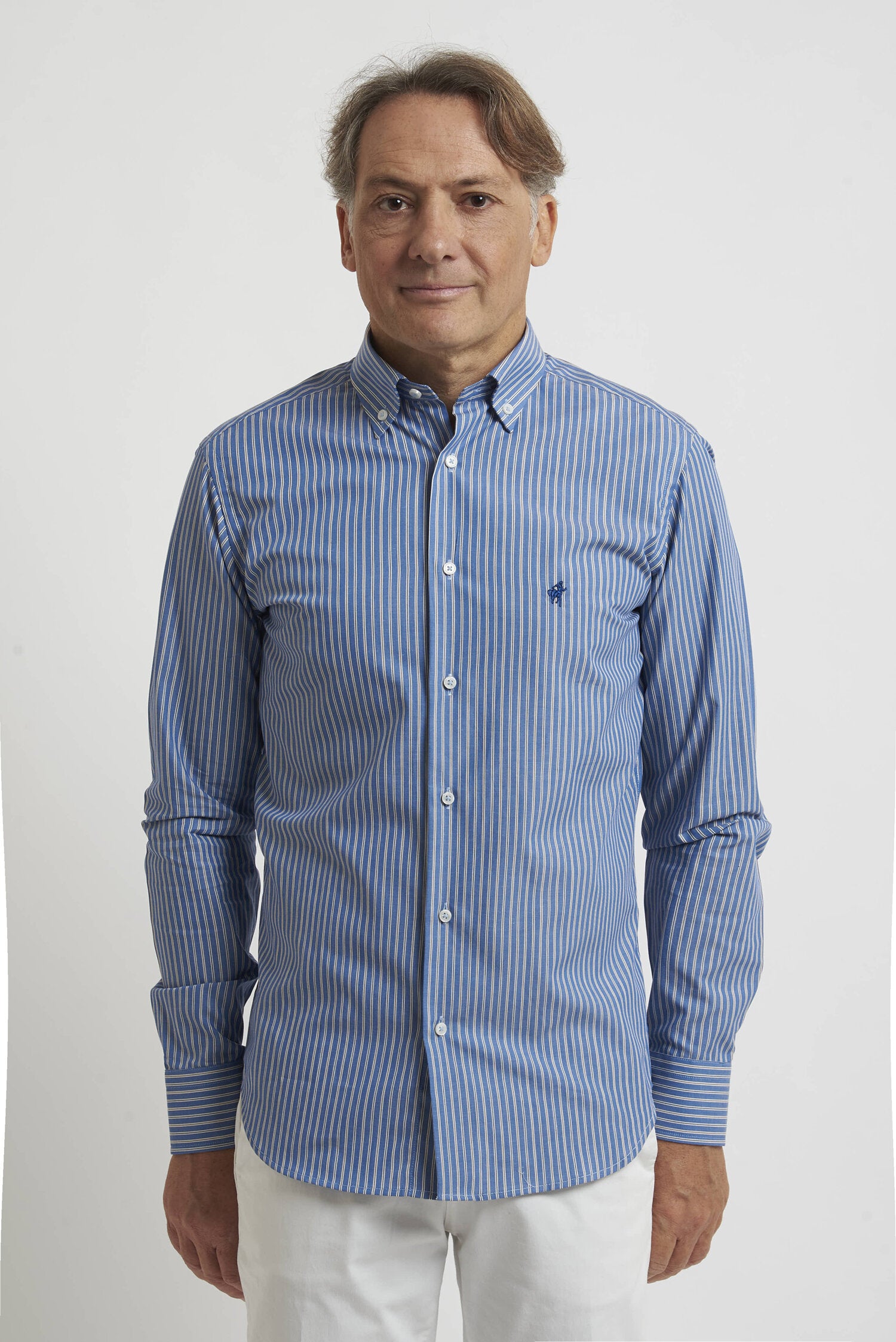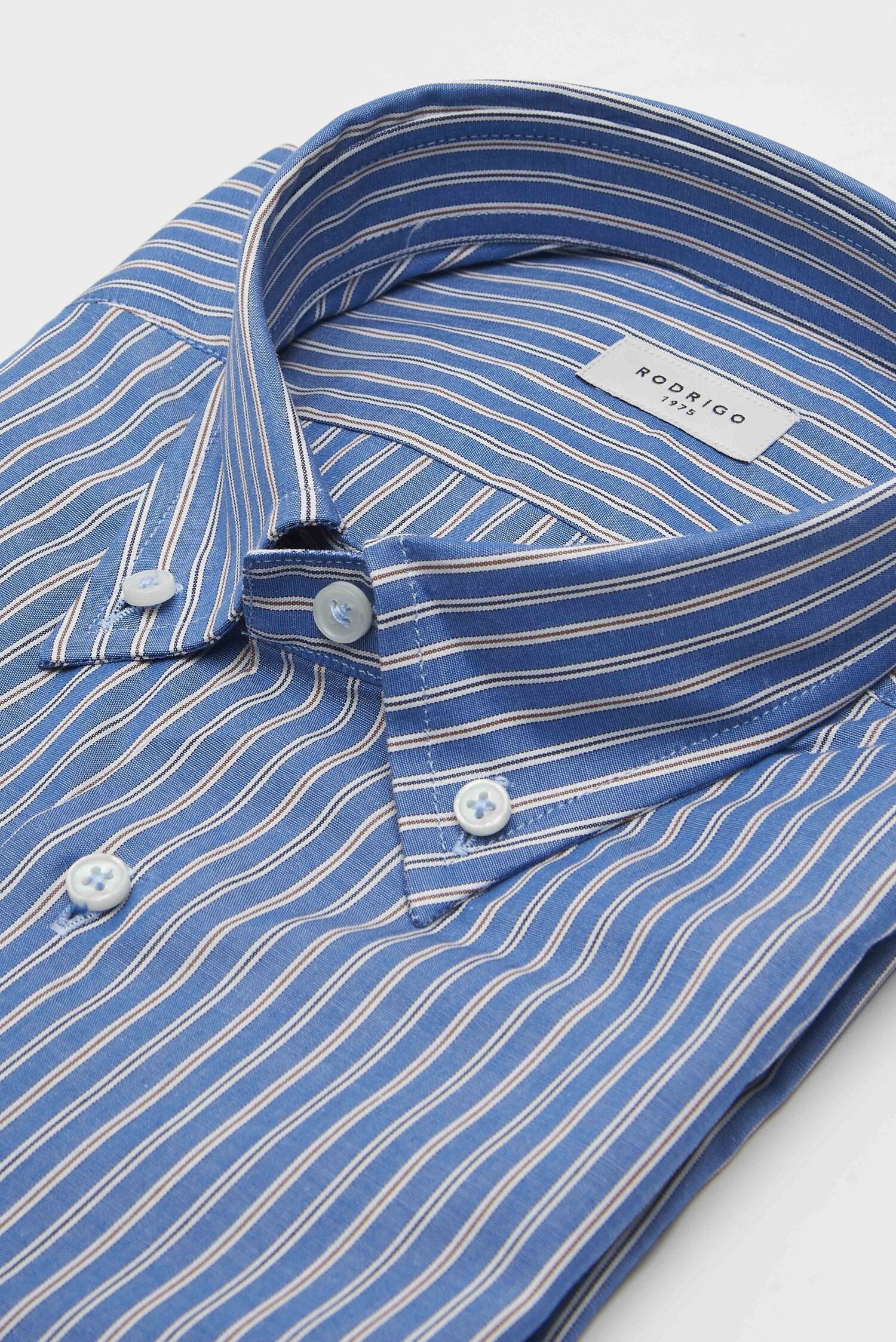 Camicia multiriga della rinomata azienda RODRIGO, realizzata in puro cotone compatto di alta qualità. Il collo è modello button down con pistagna di 3,5 cm di altezza. È realizzata con 2 pinces dietro la schiena. La vestibilità è regolare ma contemporanea. Composizione: 100% cotone.