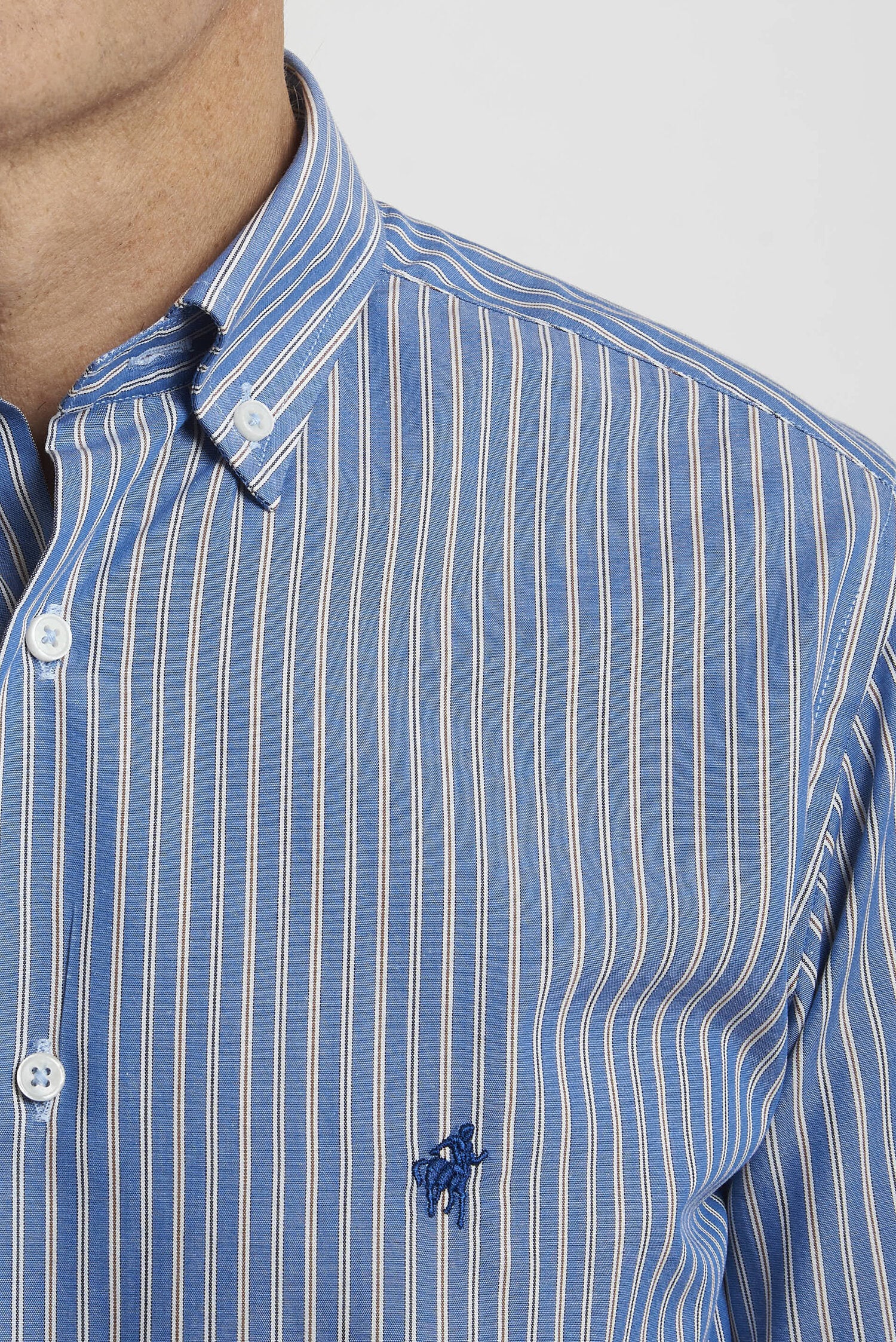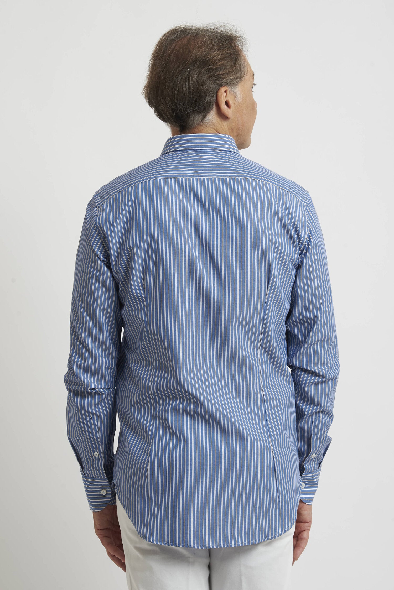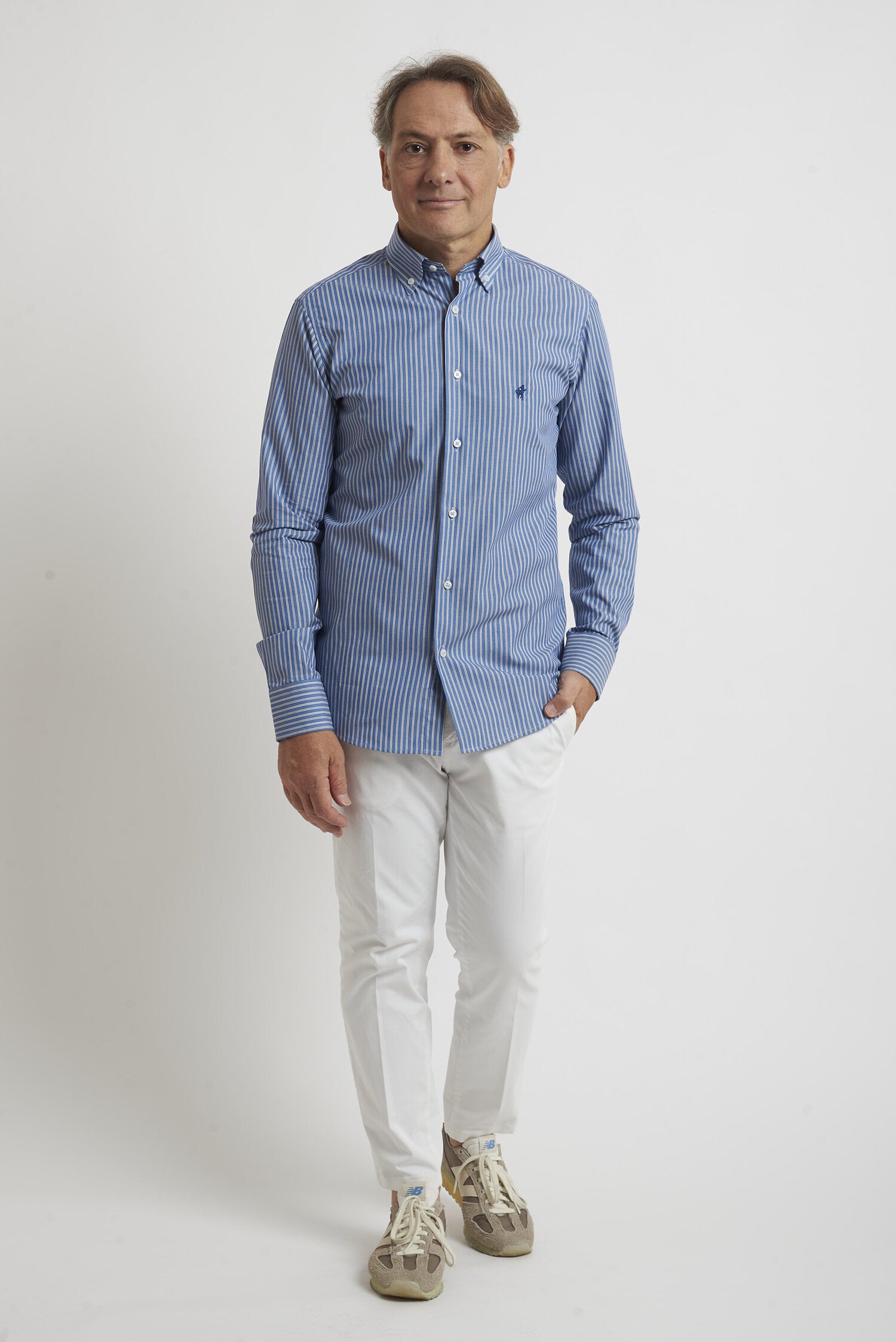 Camicia multiriga della rinomata azienda RODRIGO, realizzata in puro cotone compatto di alta qualità. Il collo è modello button down con pistagna di 3,5 cm di altezza. È realizzata con 2 pinces dietro la schiena. La vestibilità è regolare ma contemporanea. Composizione: 100% cotone.