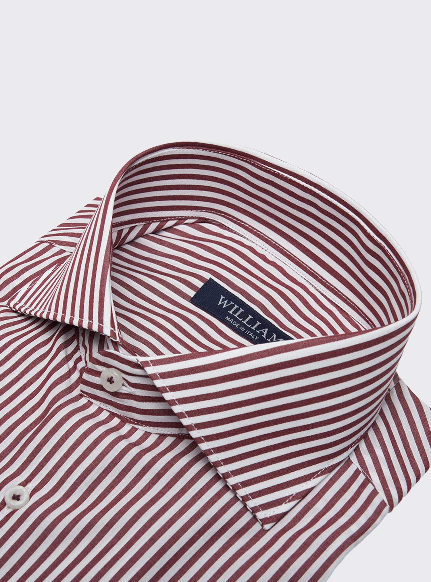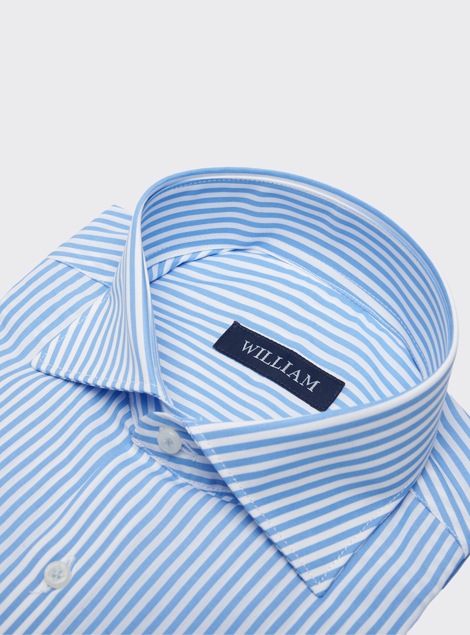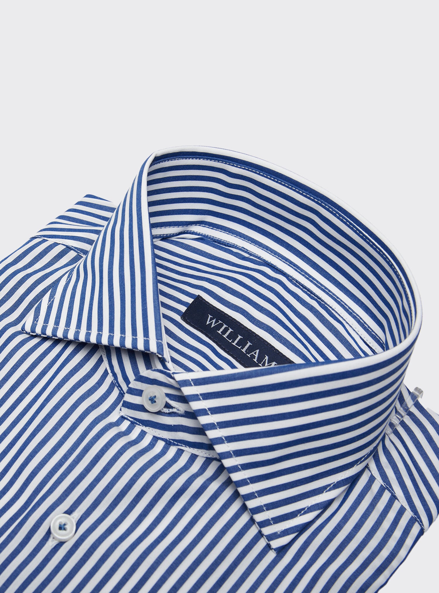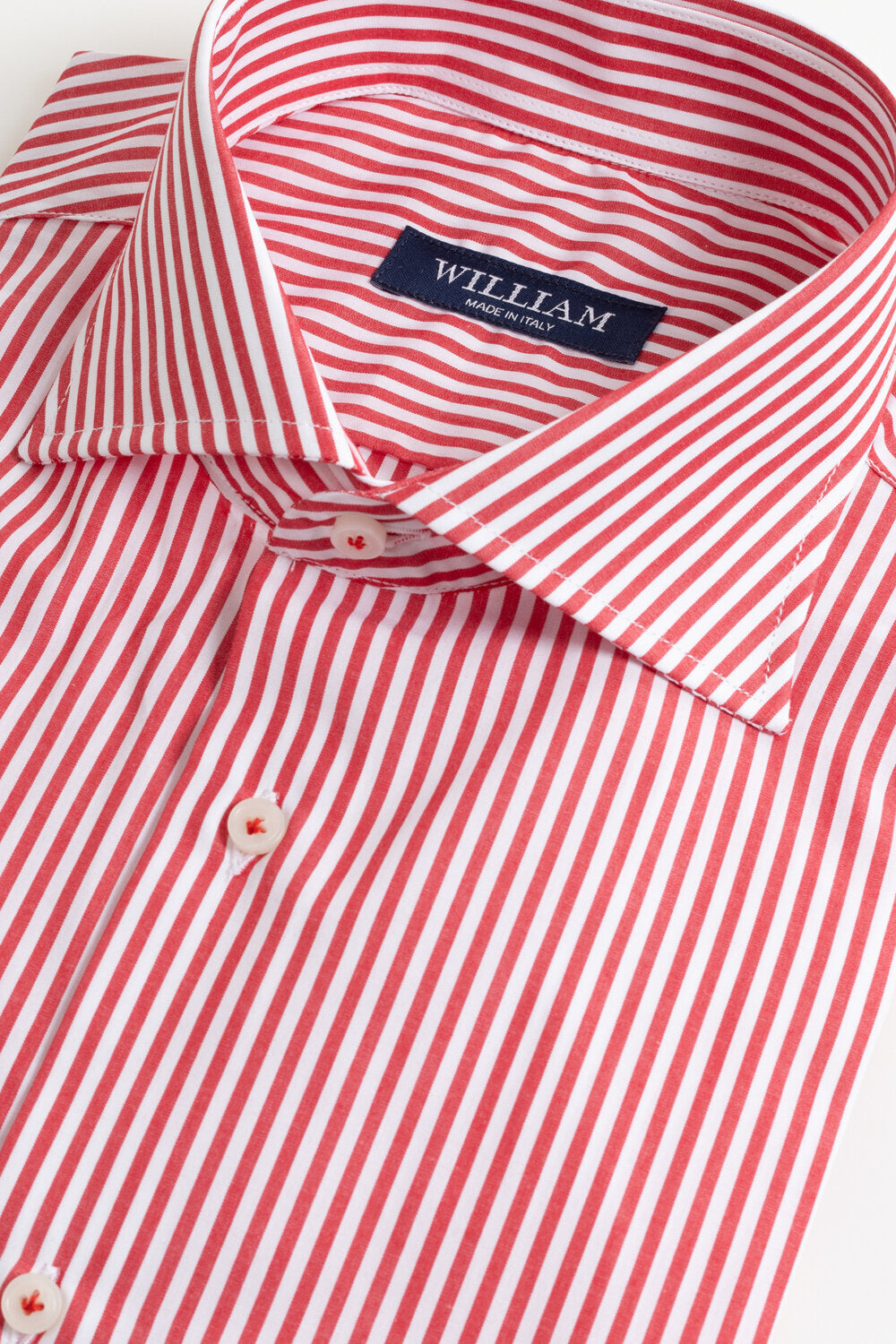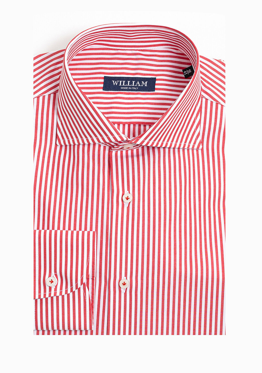 Camicia rigata WILLIAM, realizzata in puro cotone di alta qualità liscio e compatto. Il collo è modello mezzo francese con pistagna di 3,5 cm di altezza, rigido e con stecche interne. È realizzata con 2 pinces dietro la schiena. Il polso è caratterizzato dall'avere 2 asole ed 1 bottone...lo puoi abbottonare normalmente oppure puoi scegliere di indossare i gemelli. La vestibilità è regolare ma contemporanea. Composizione: 100% cotone.