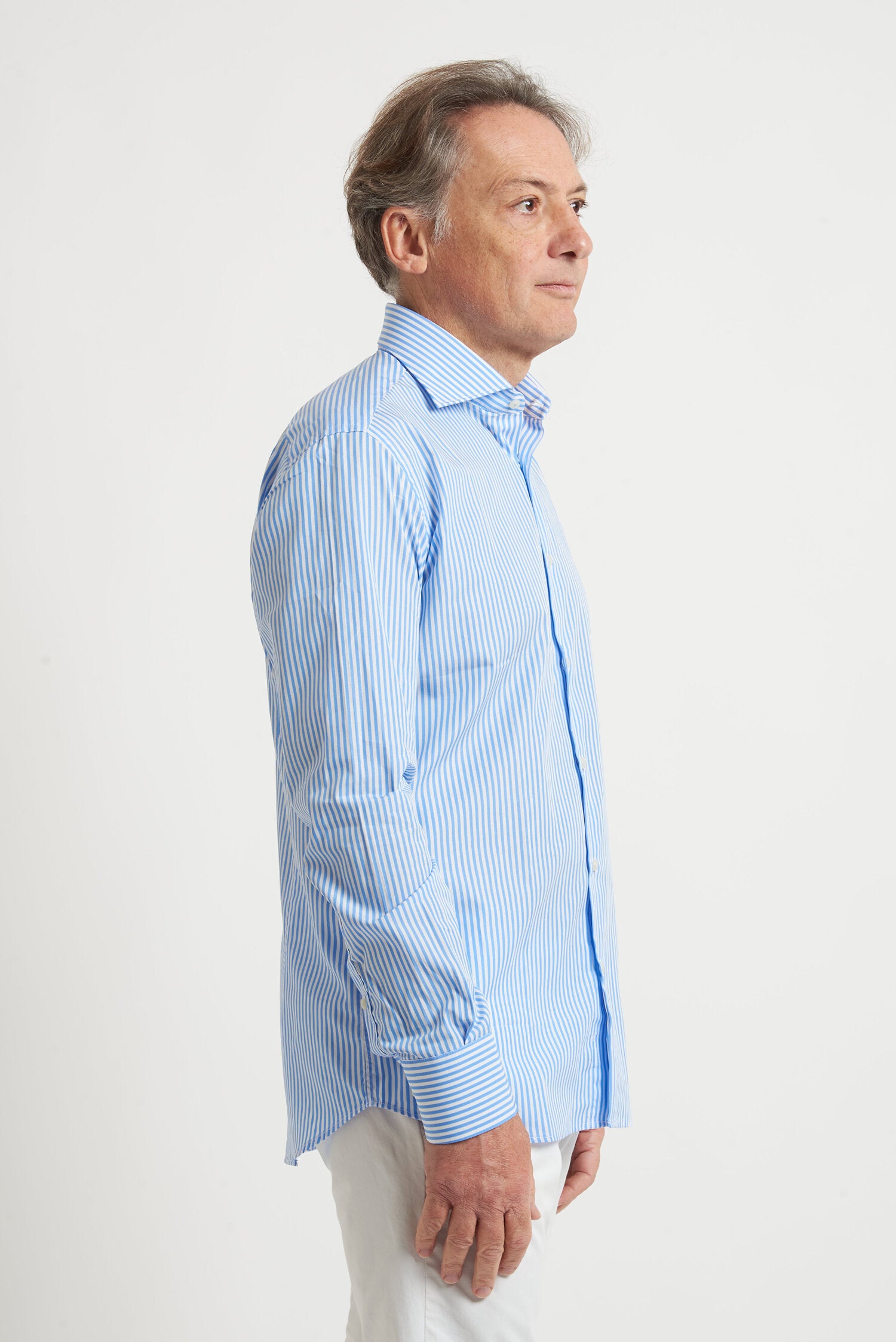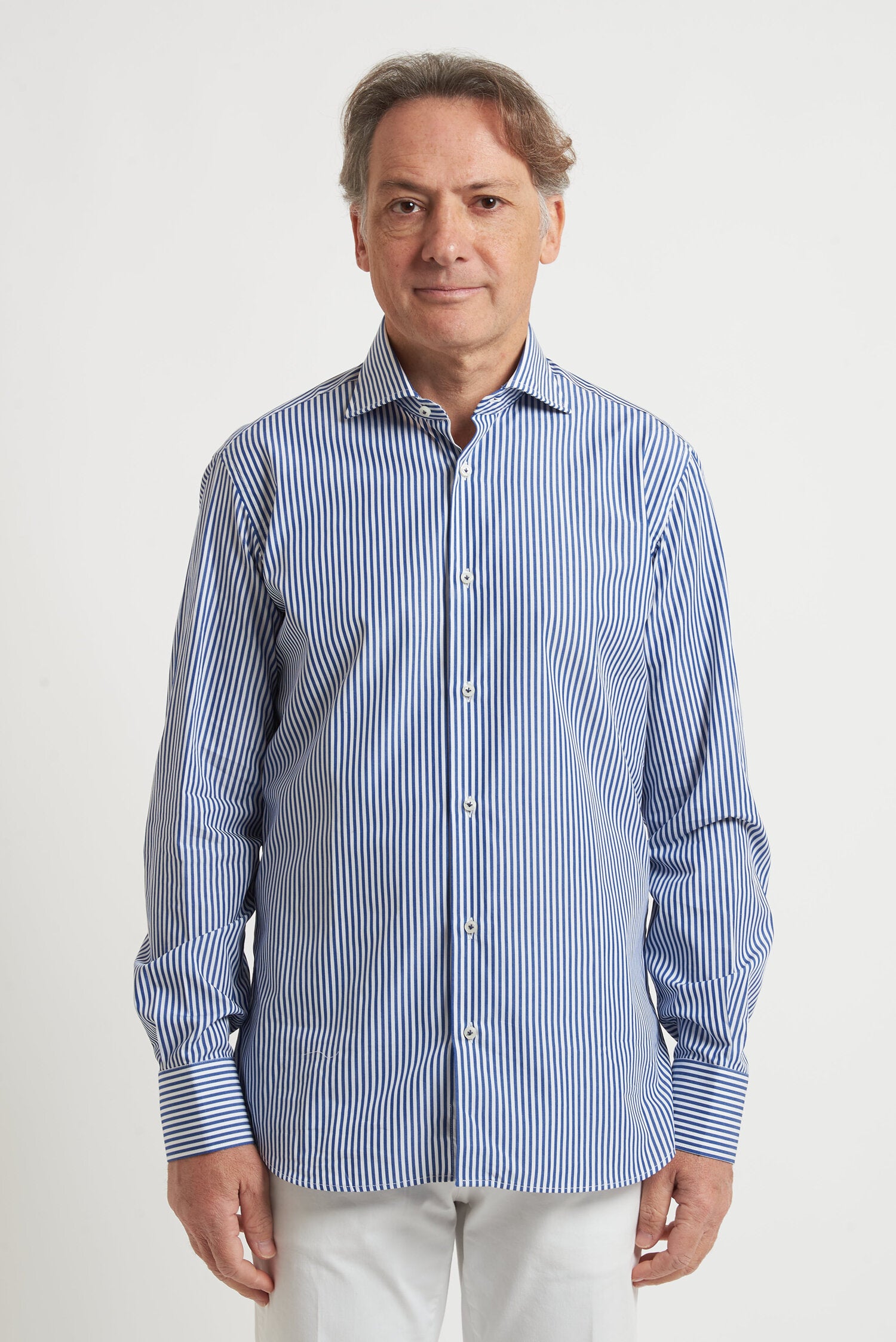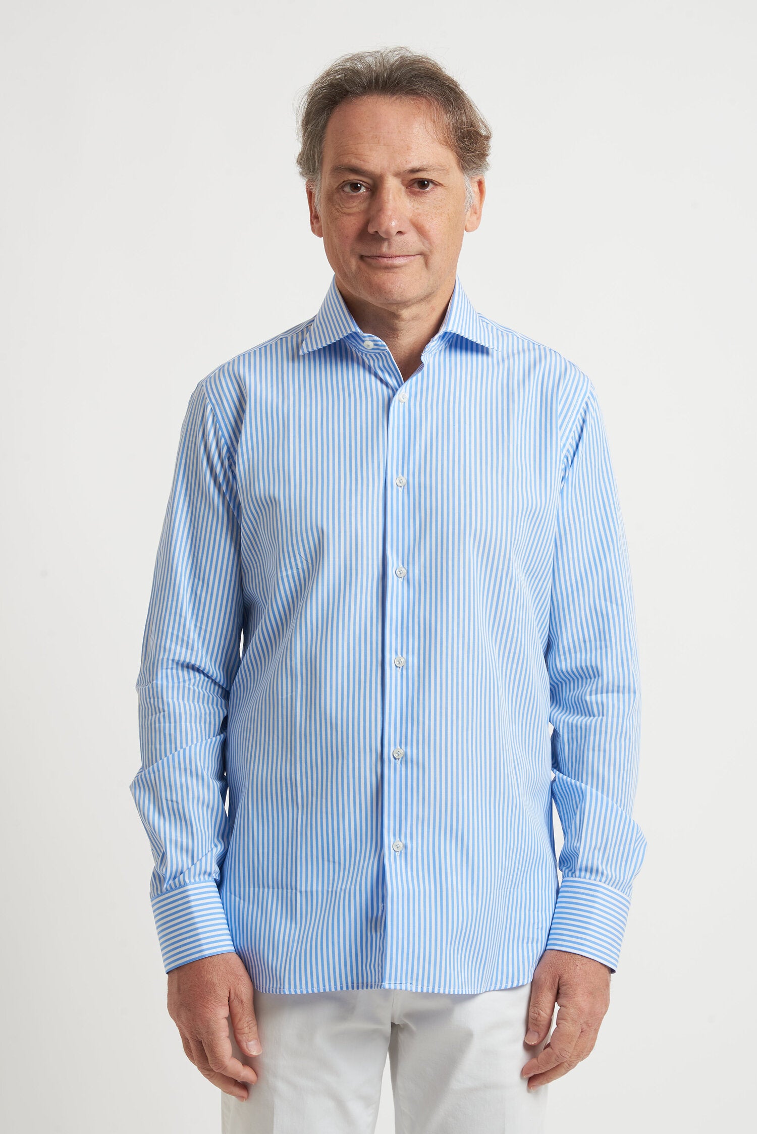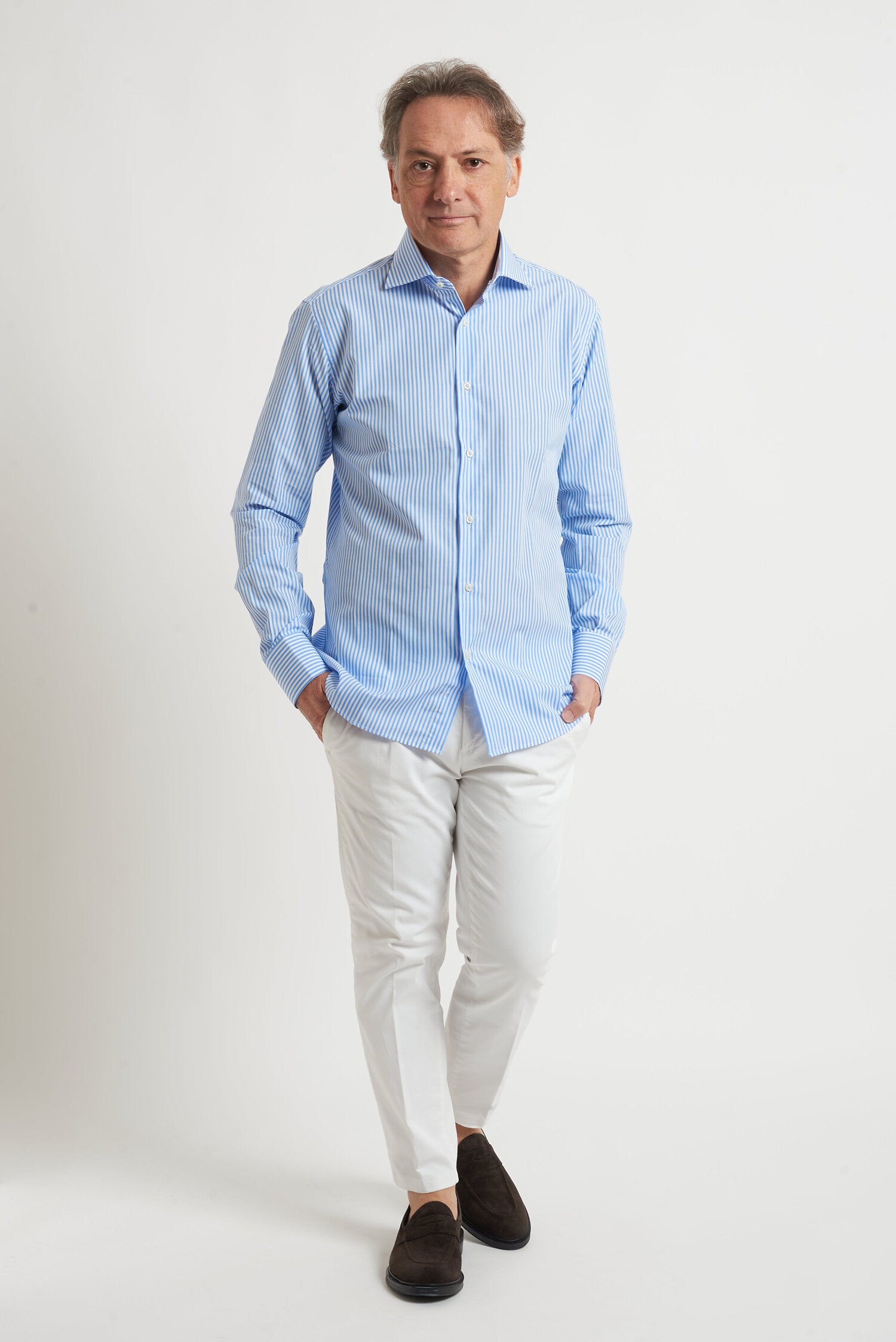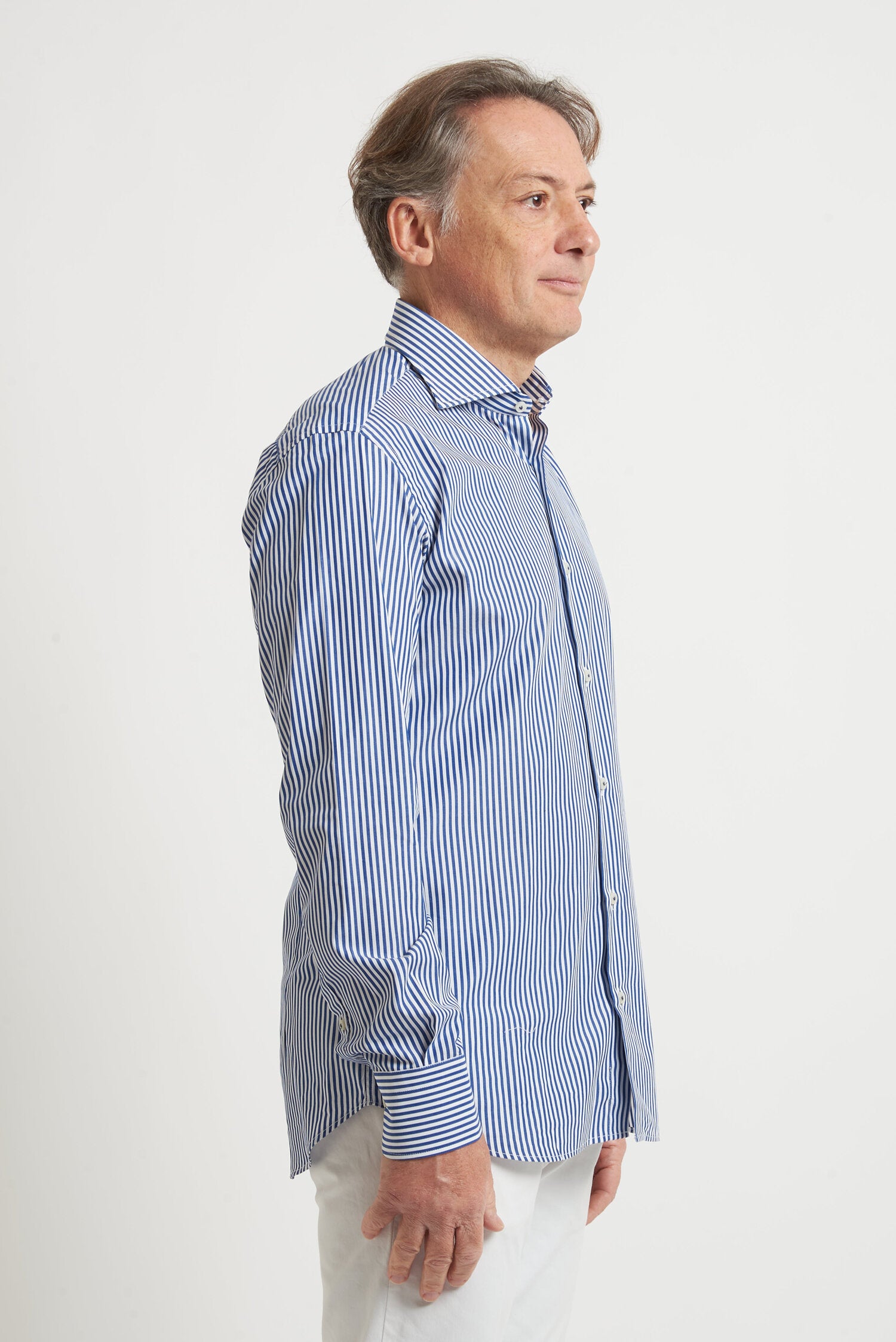 Camicia rigata WILLIAM, realizzata in puro cotone di alta qualità liscio e compatto. Il collo è modello mezzo francese con pistagna di 3,5 cm di altezza, rigido e con stecche interne. È realizzata con 2 pinces dietro la schiena. Il polso è caratterizzato dall'avere 2 asole ed 1 bottone...lo puoi abbottonare normalmente oppure puoi scegliere di indossare i gemelli. La vestibilità è regolare ma contemporanea. Composizione: 100% cotone.