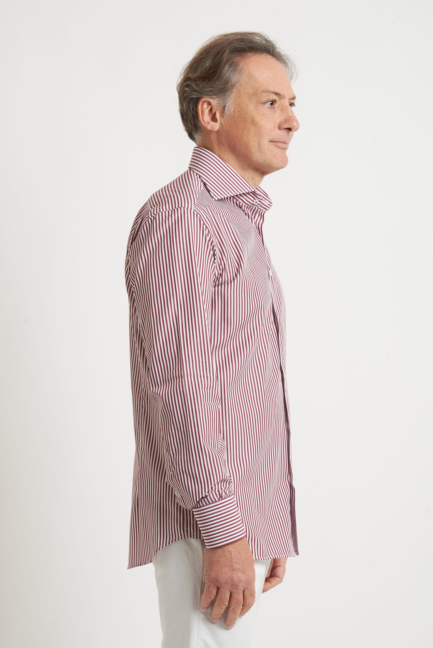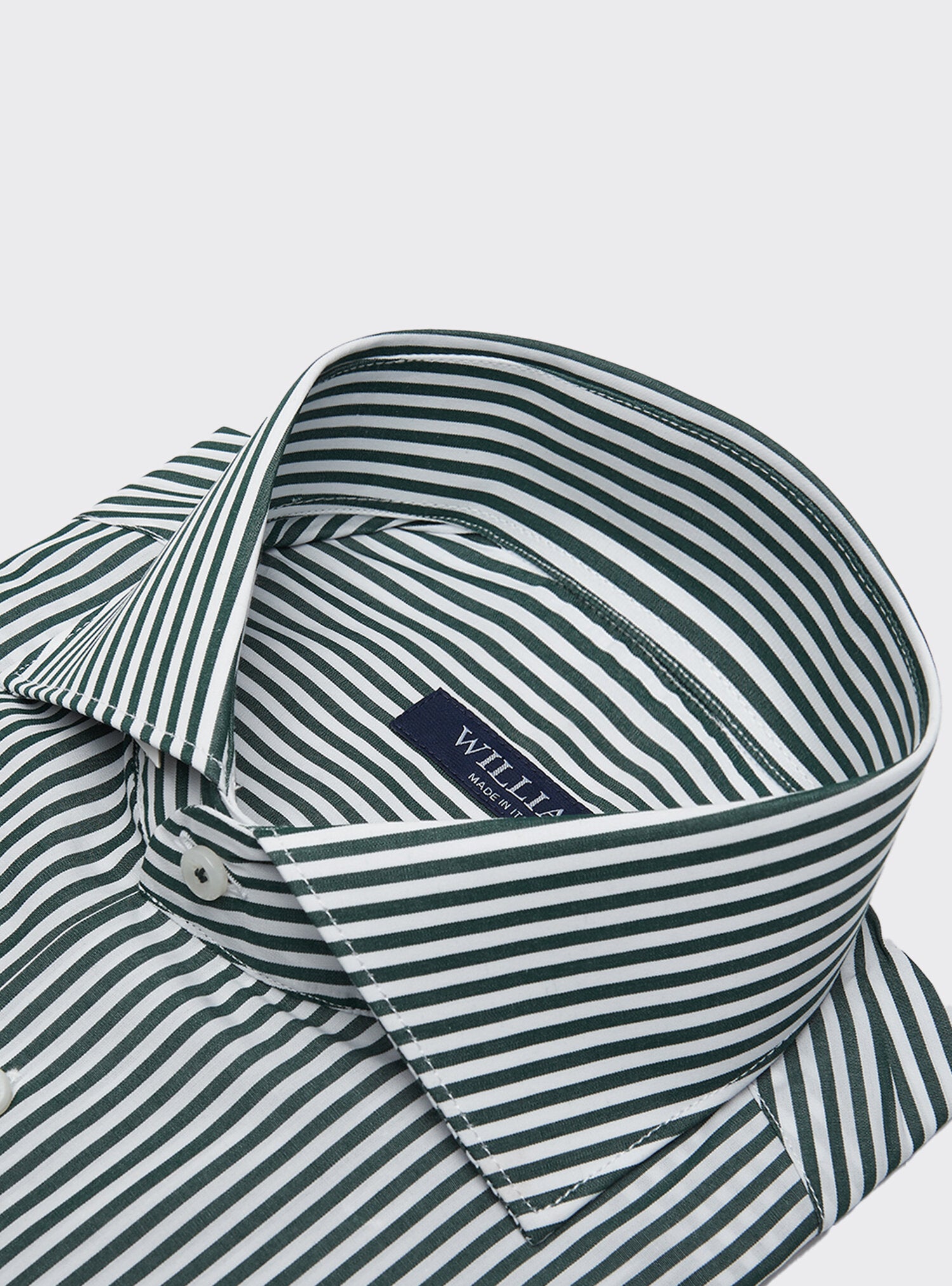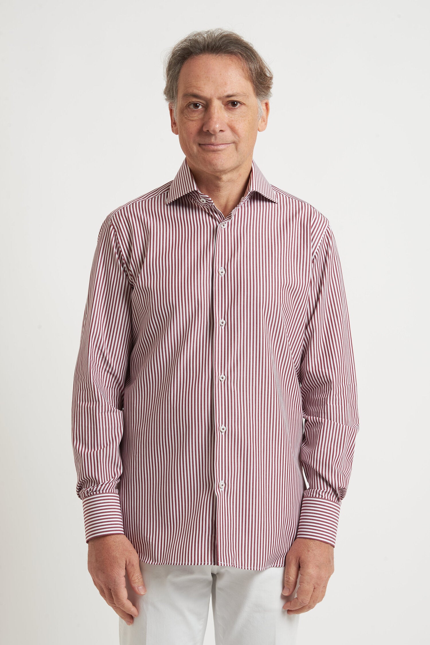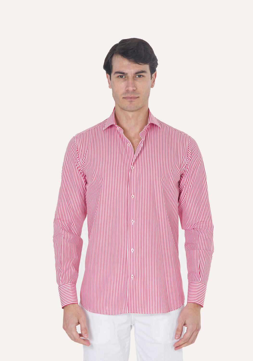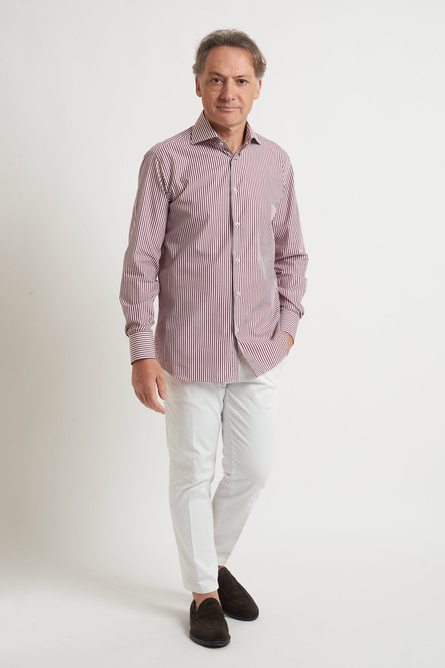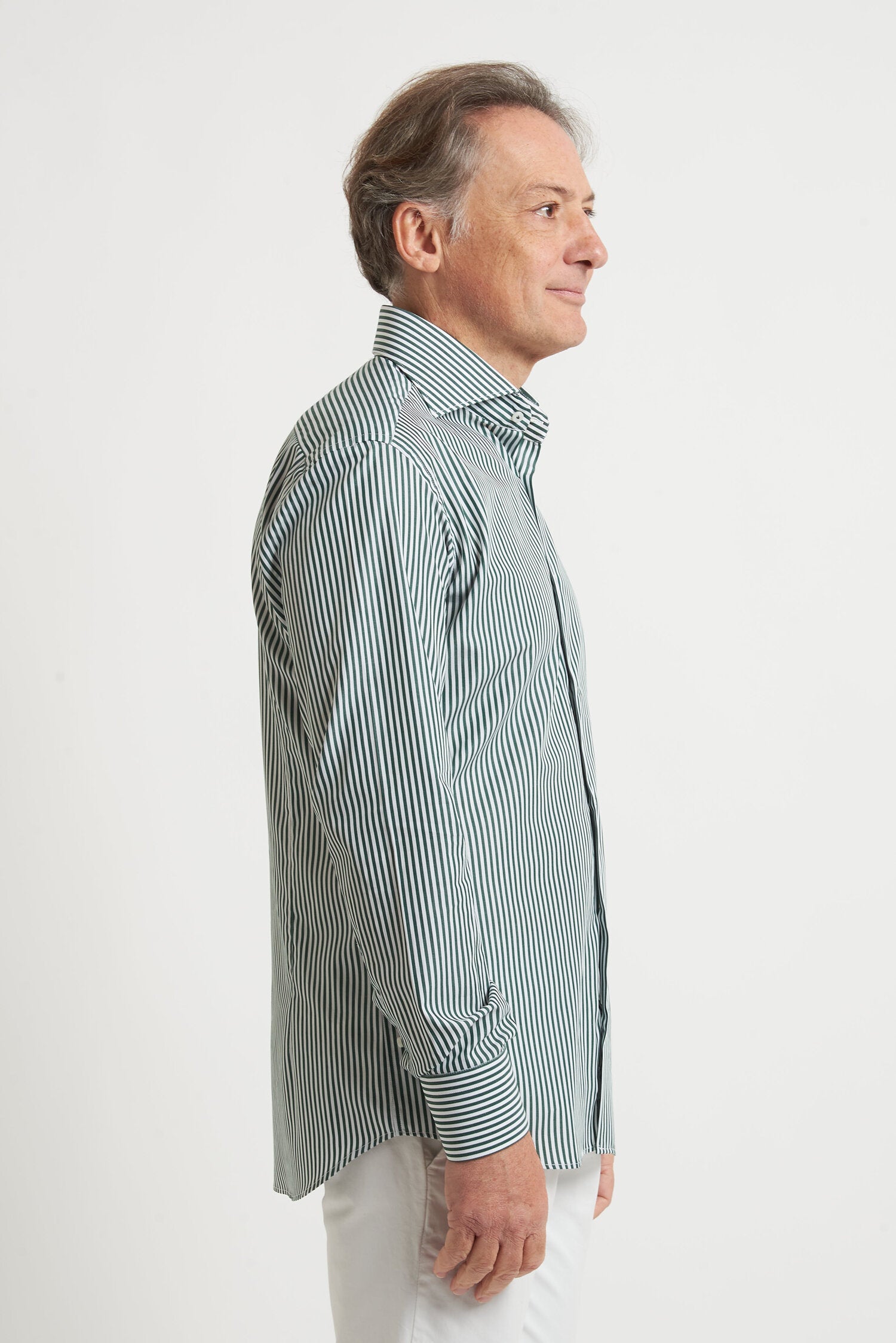 Camicia rigata WILLIAM, realizzata in puro cotone di alta qualità liscio e compatto. Il collo è modello mezzo francese con pistagna di 3,5 cm di altezza, rigido e con stecche interne. È realizzata con 2 pinces dietro la schiena. Il polso è caratterizzato dall'avere 2 asole ed 1 bottone...lo puoi abbottonare normalmente oppure puoi scegliere di indossare i gemelli. La vestibilità è regolare ma contemporanea. Composizione: 100% cotone.