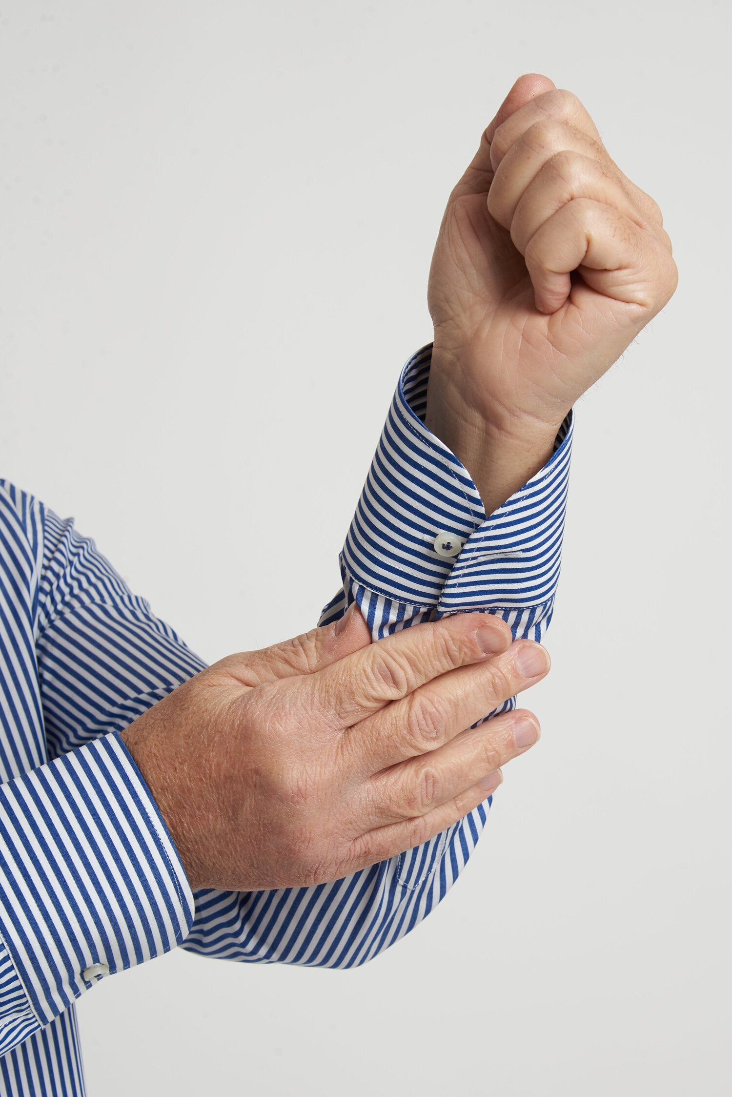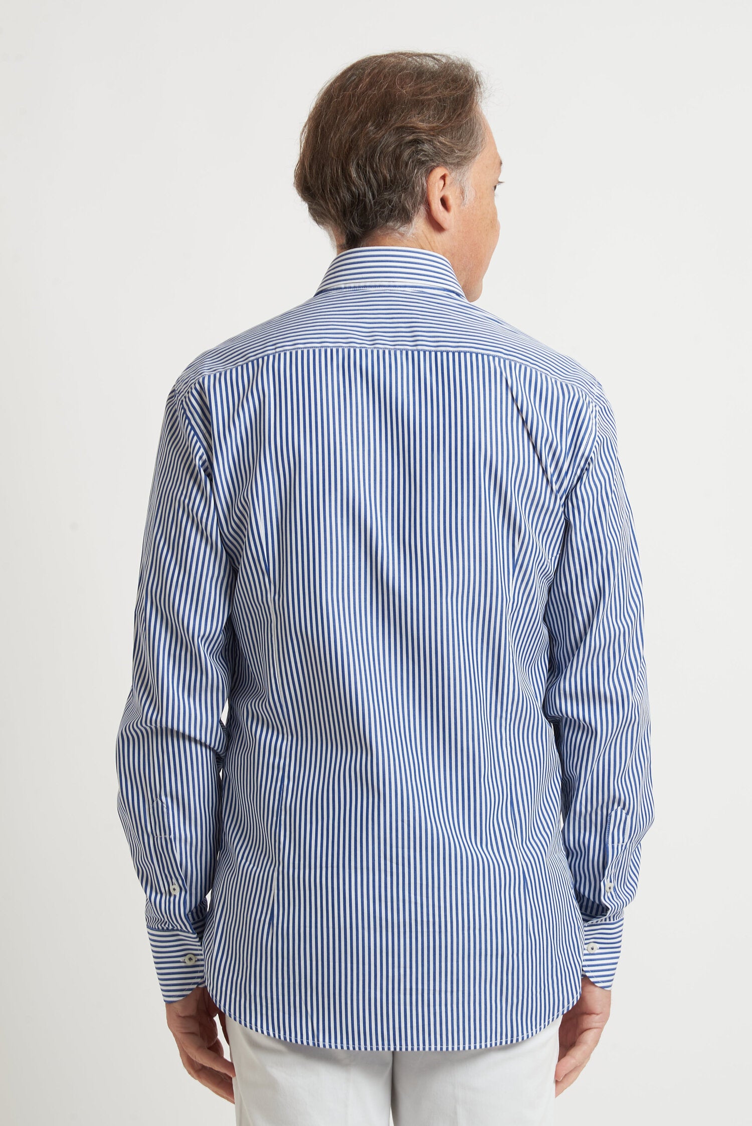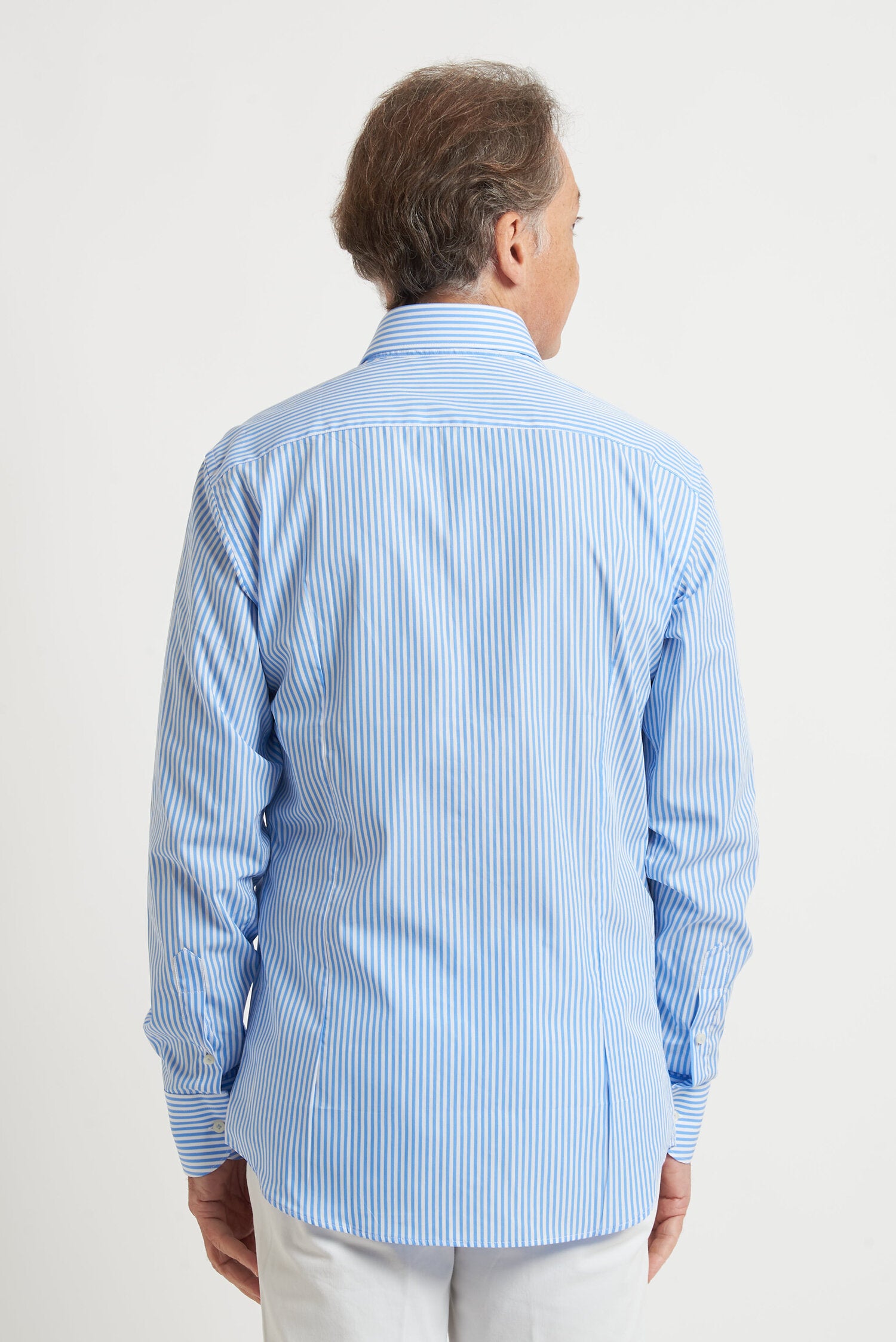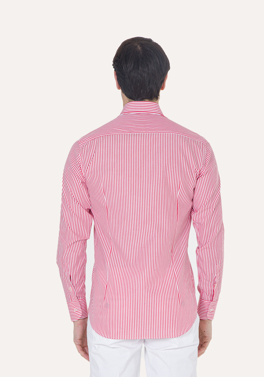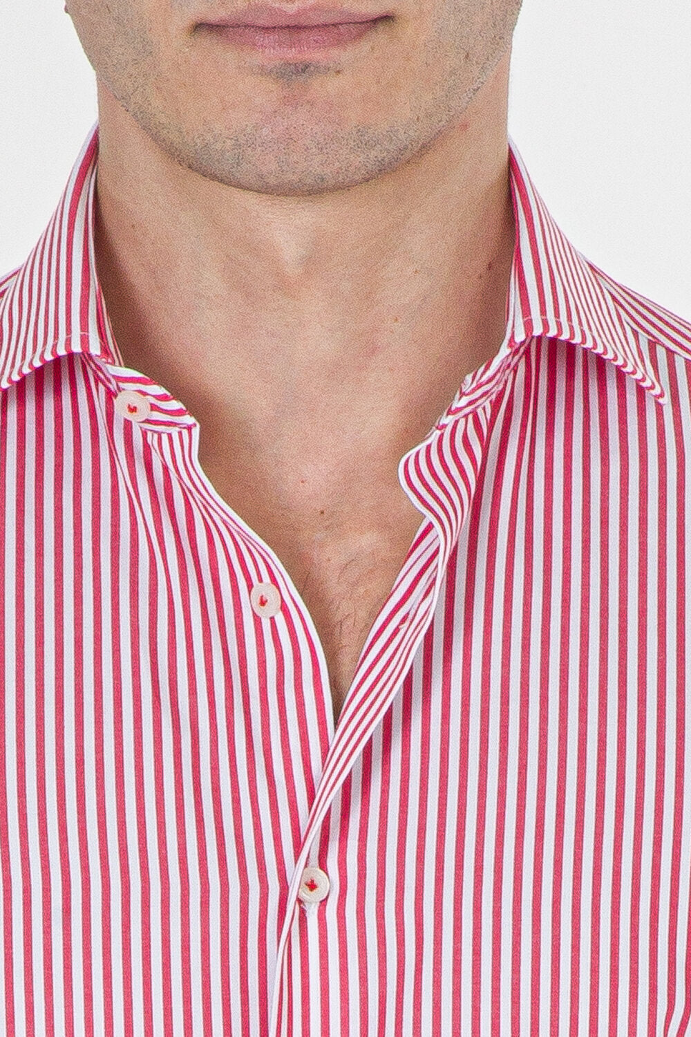 Camicia rigata WILLIAM, realizzata in puro cotone di alta qualità liscio e compatto. Il collo è modello mezzo francese con pistagna di 3,5 cm di altezza, rigido e con stecche interne. È realizzata con 2 pinces dietro la schiena. Il polso è caratterizzato dall'avere 2 asole ed 1 bottone...lo puoi abbottonare normalmente oppure puoi scegliere di indossare i gemelli. La vestibilità è regolare ma contemporanea. Composizione: 100% cotone.