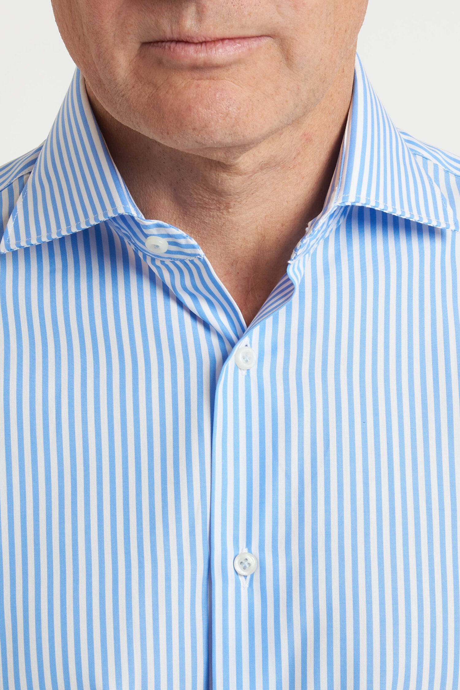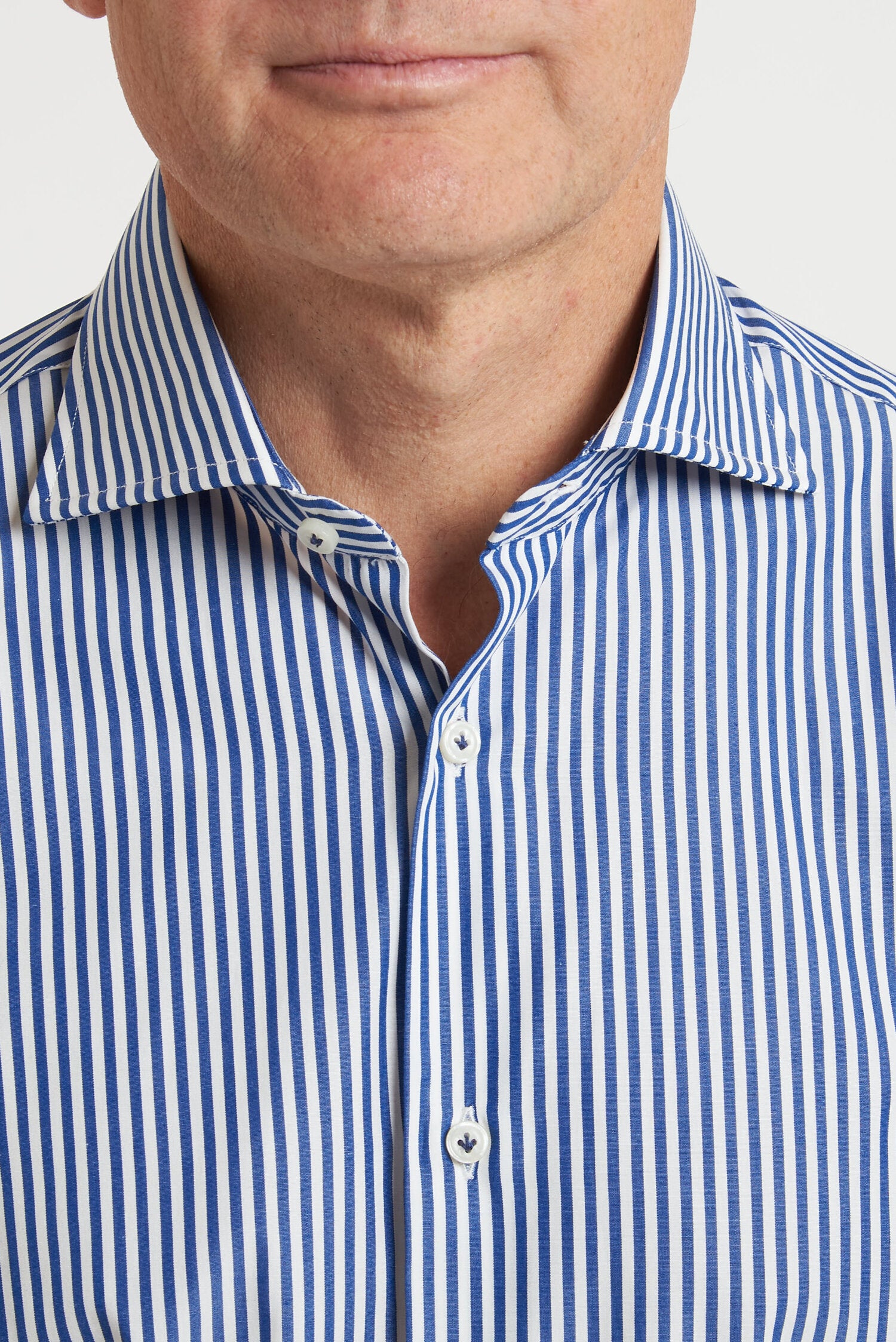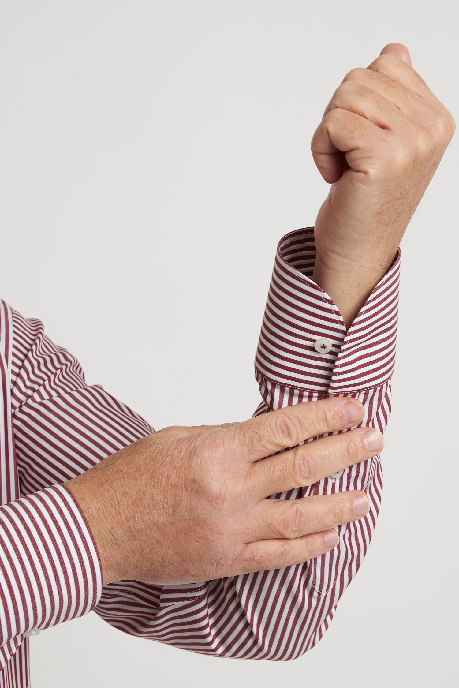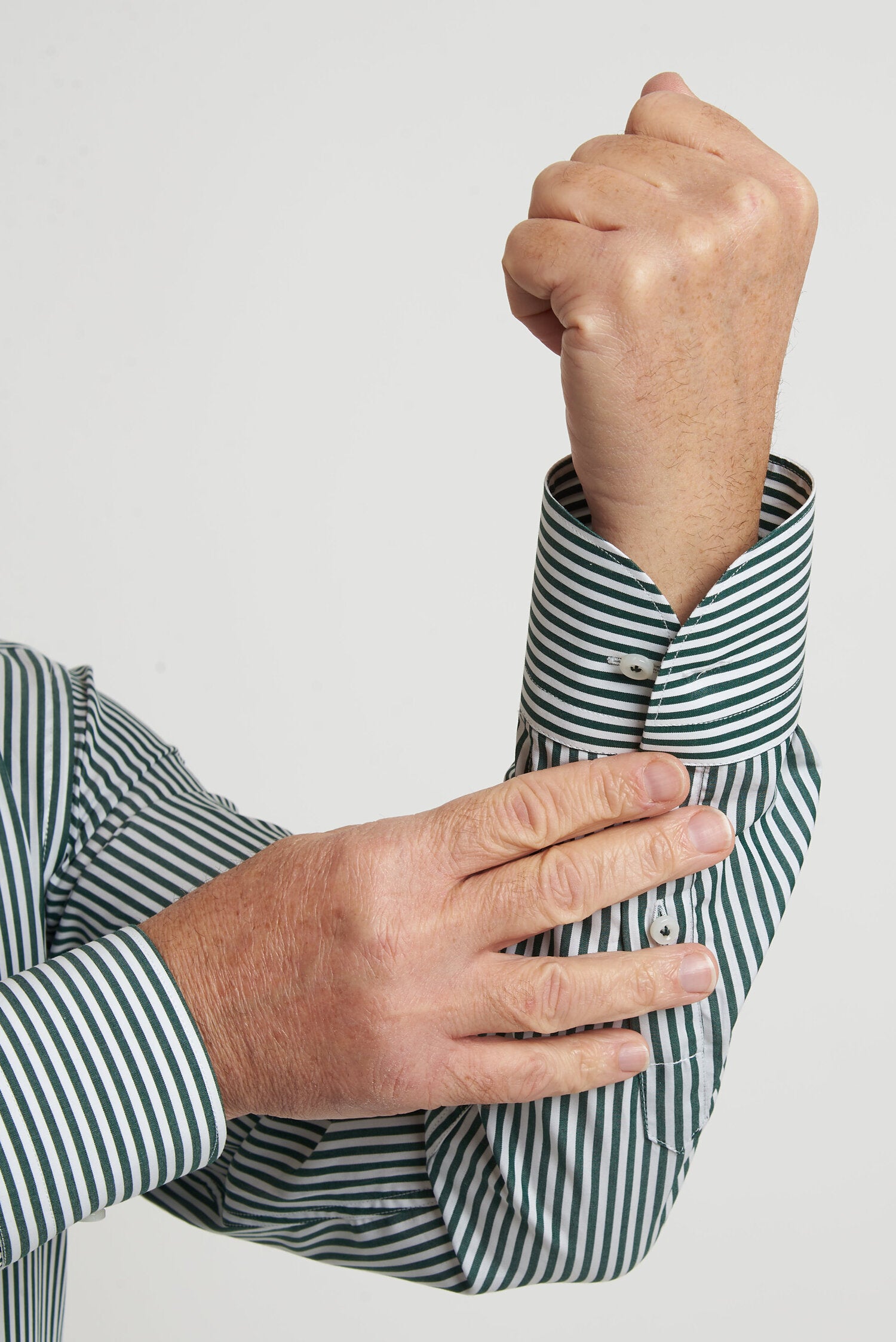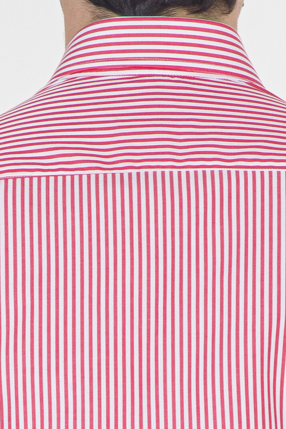 Camicia rigata WILLIAM, realizzata in puro cotone di alta qualità liscio e compatto. Il collo è modello mezzo francese con pistagna di 3,5 cm di altezza, rigido e con stecche interne. È realizzata con 2 pinces dietro la schiena. Il polso è caratterizzato dall'avere 2 asole ed 1 bottone...lo puoi abbottonare normalmente oppure puoi scegliere di indossare i gemelli. La vestibilità è regolare ma contemporanea. Composizione: 100% cotone.