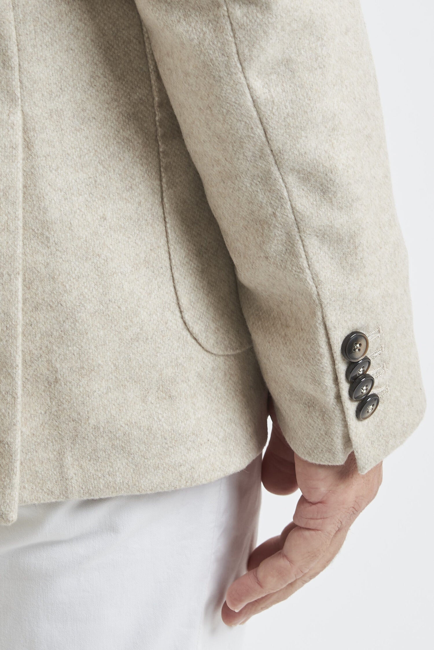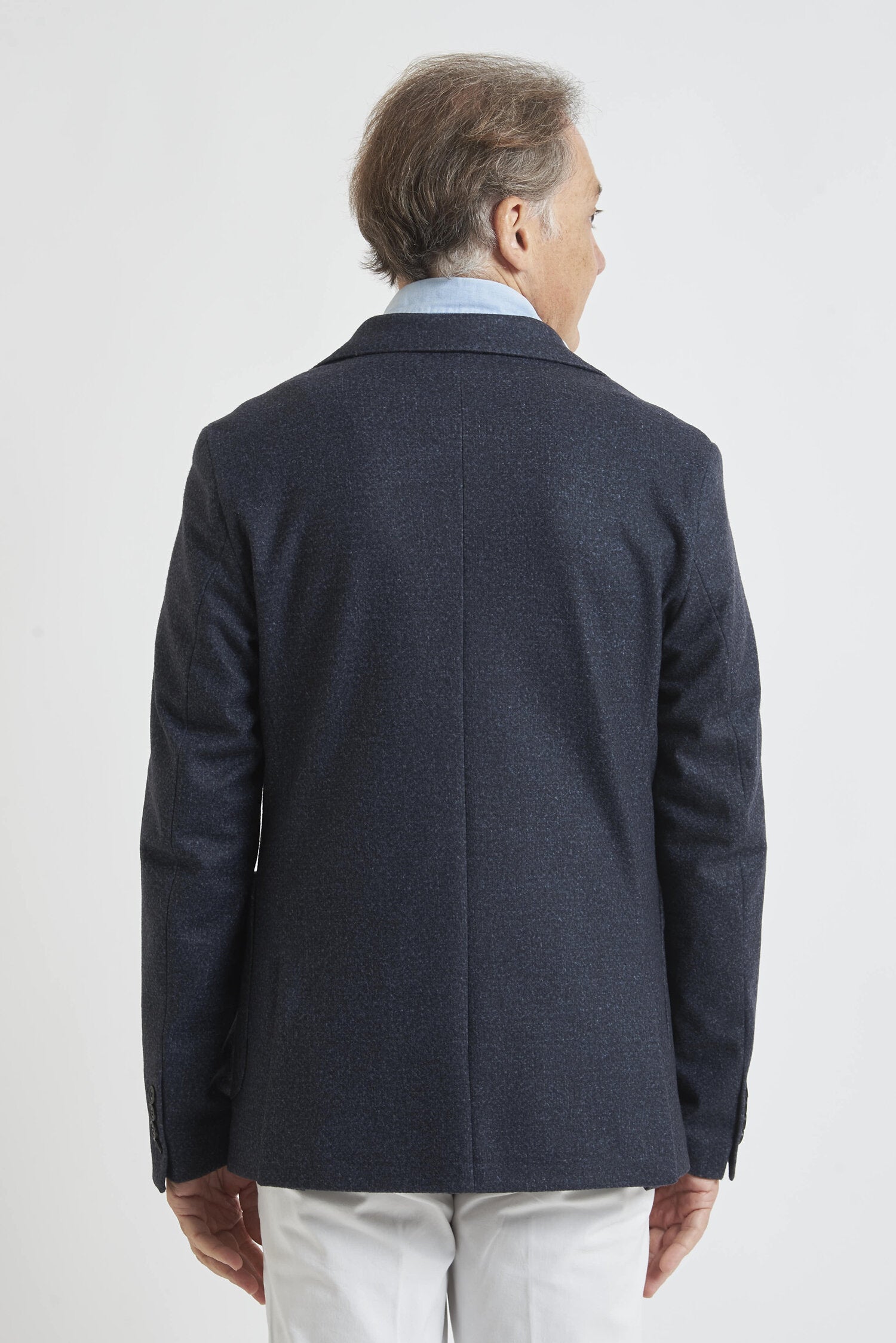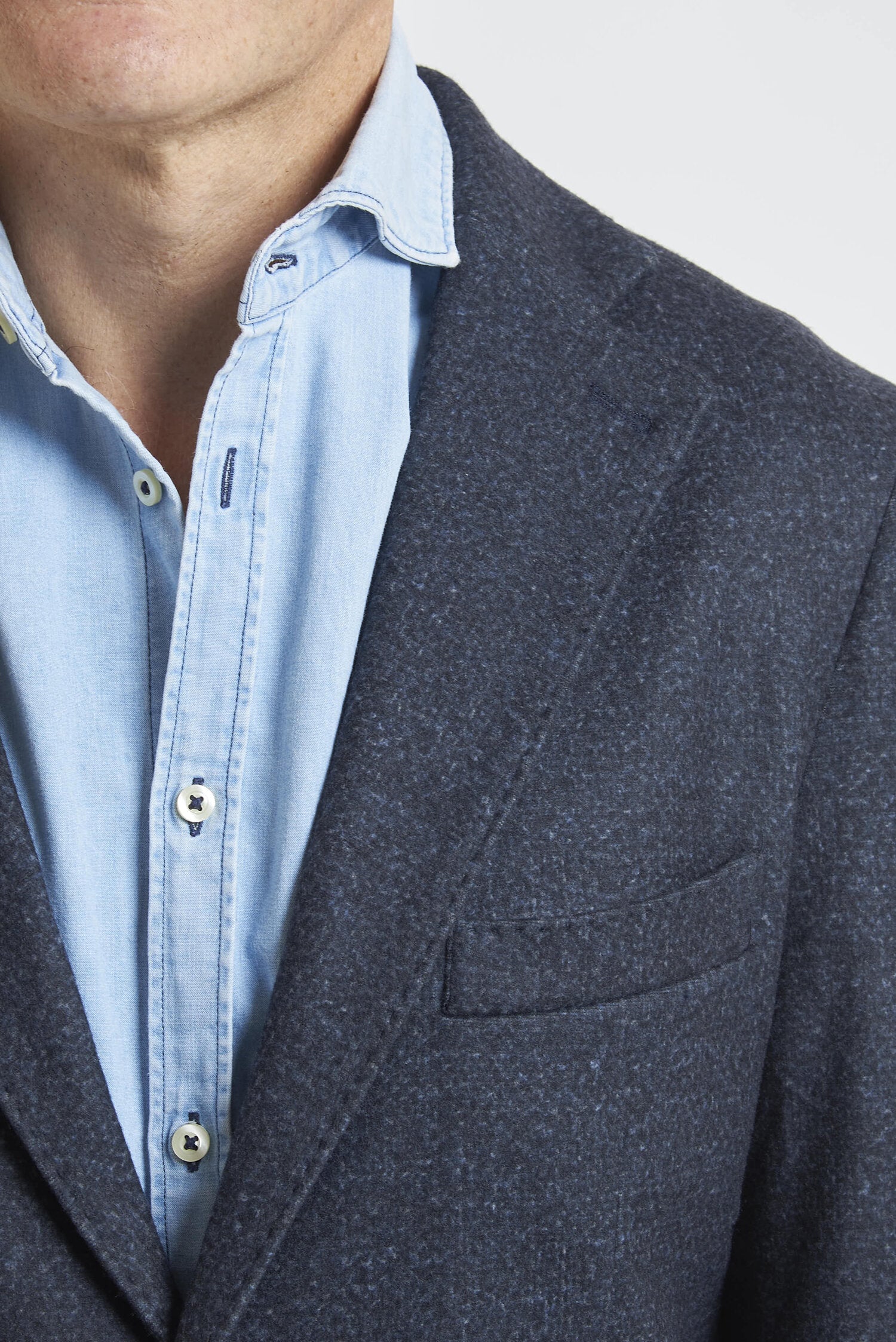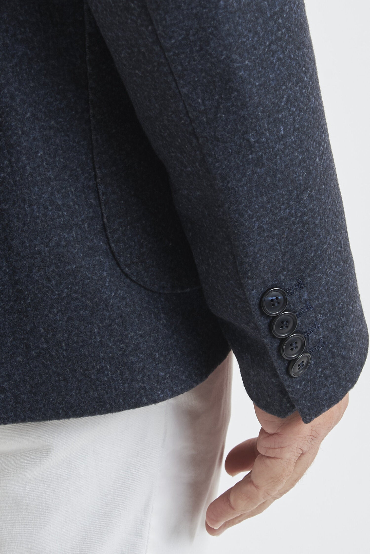 Giacca WILLIAM tinta unita realizzata in un raffinato tessuto oxford. La giacca è confezionata in modo sartoriale, di gusto napoletano. È caratterizzata dall'avere la spallina svuotata, il rever liscio, classico 8 cm e impunturato, tasca a barchetta sul petto e tasche laterali applicate a toppa, anch'esse impunturate. Dietro chiude sul fondo con il doppio spacco. La vestibilità è regolare. Composizione: 85% poliestere - 10% viscosa - 5% lana