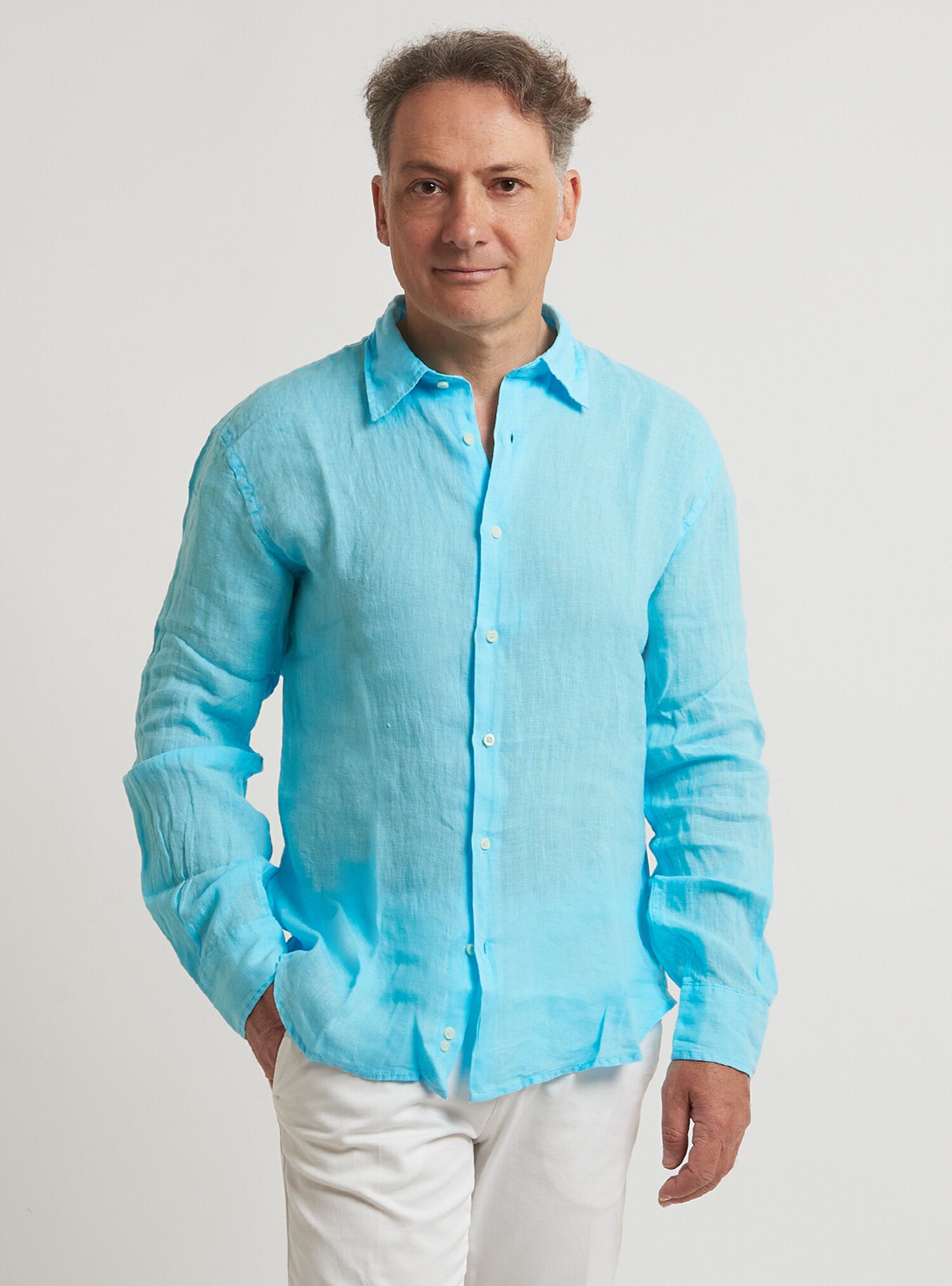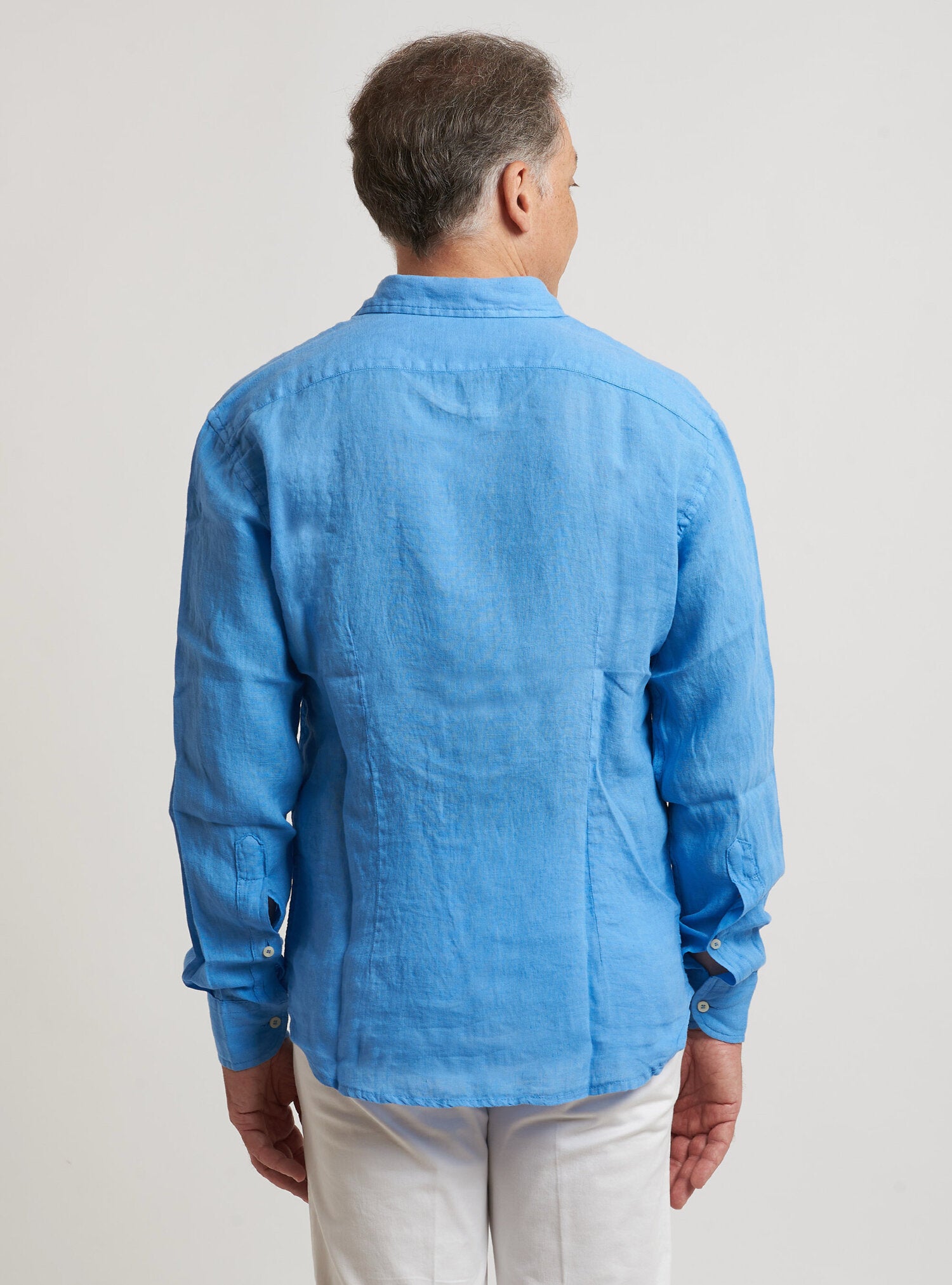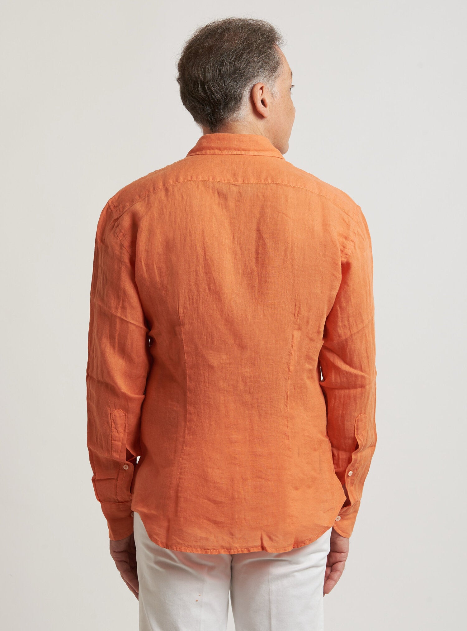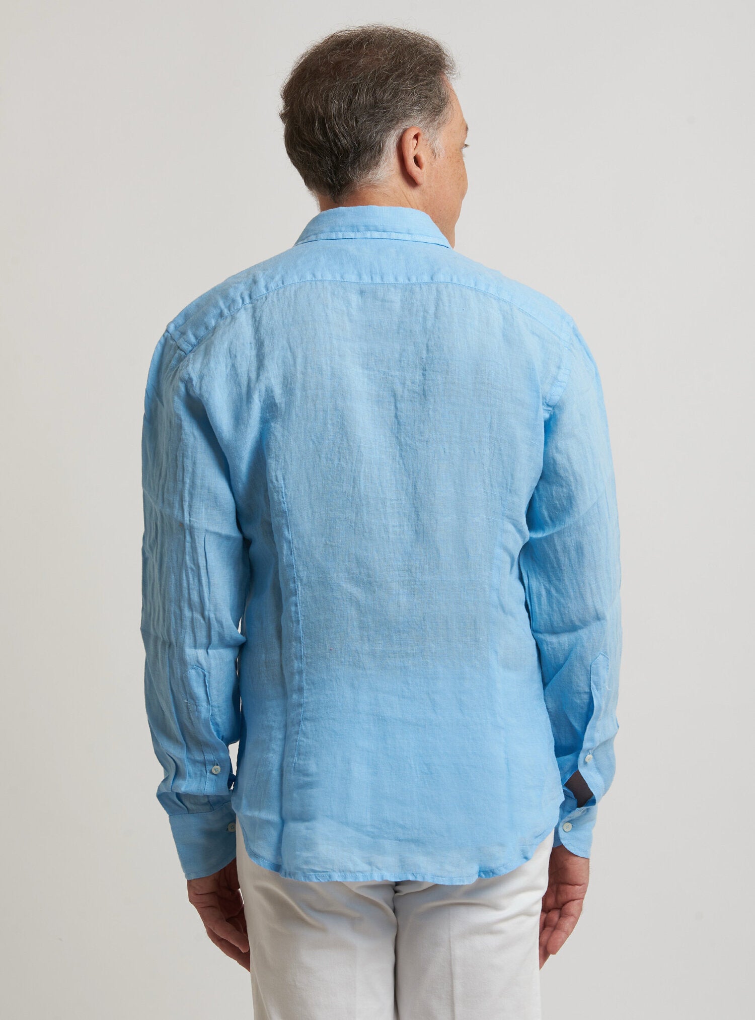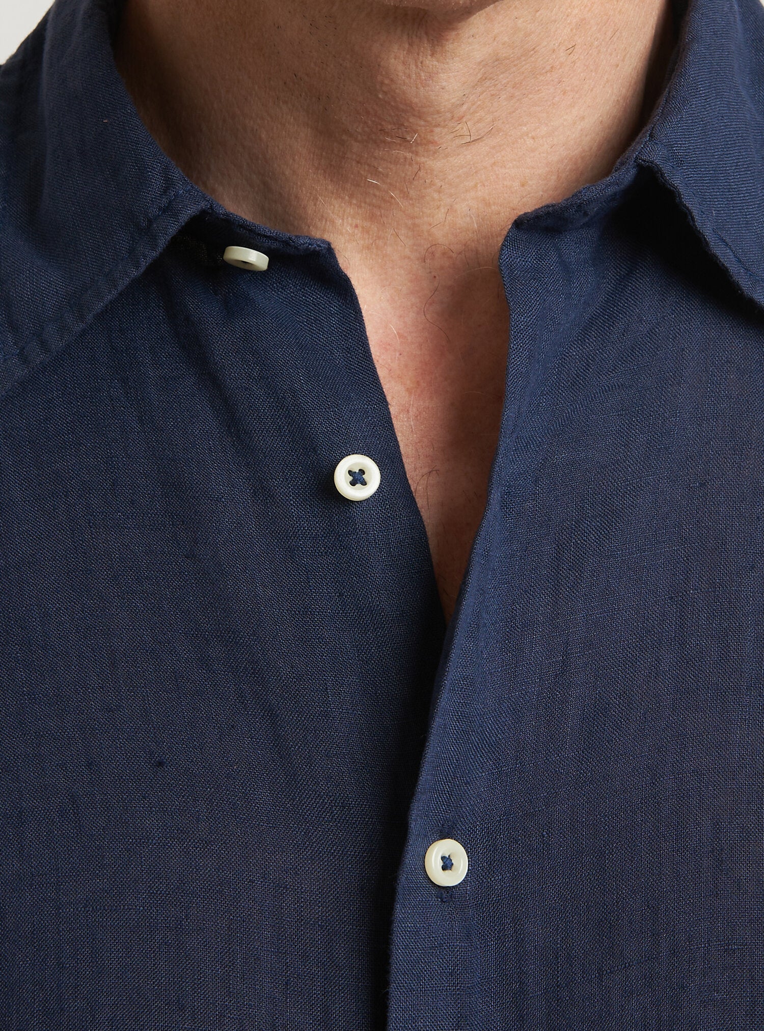 Camicia WILLIAM realizzata in puro lino lavato di alta qualità. Il collo è modello francese totalmente destrutturato e morbido. È realizzata con 2 pinces dietro la schiena. La vestibilità è semi slim. Composizione 100% lino.