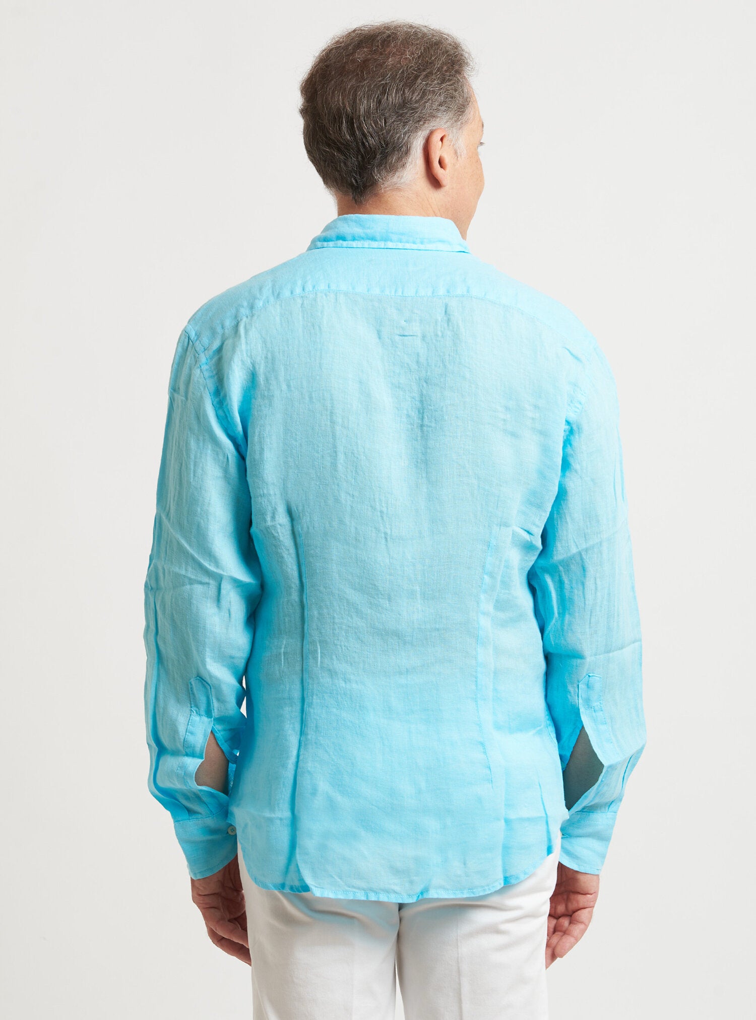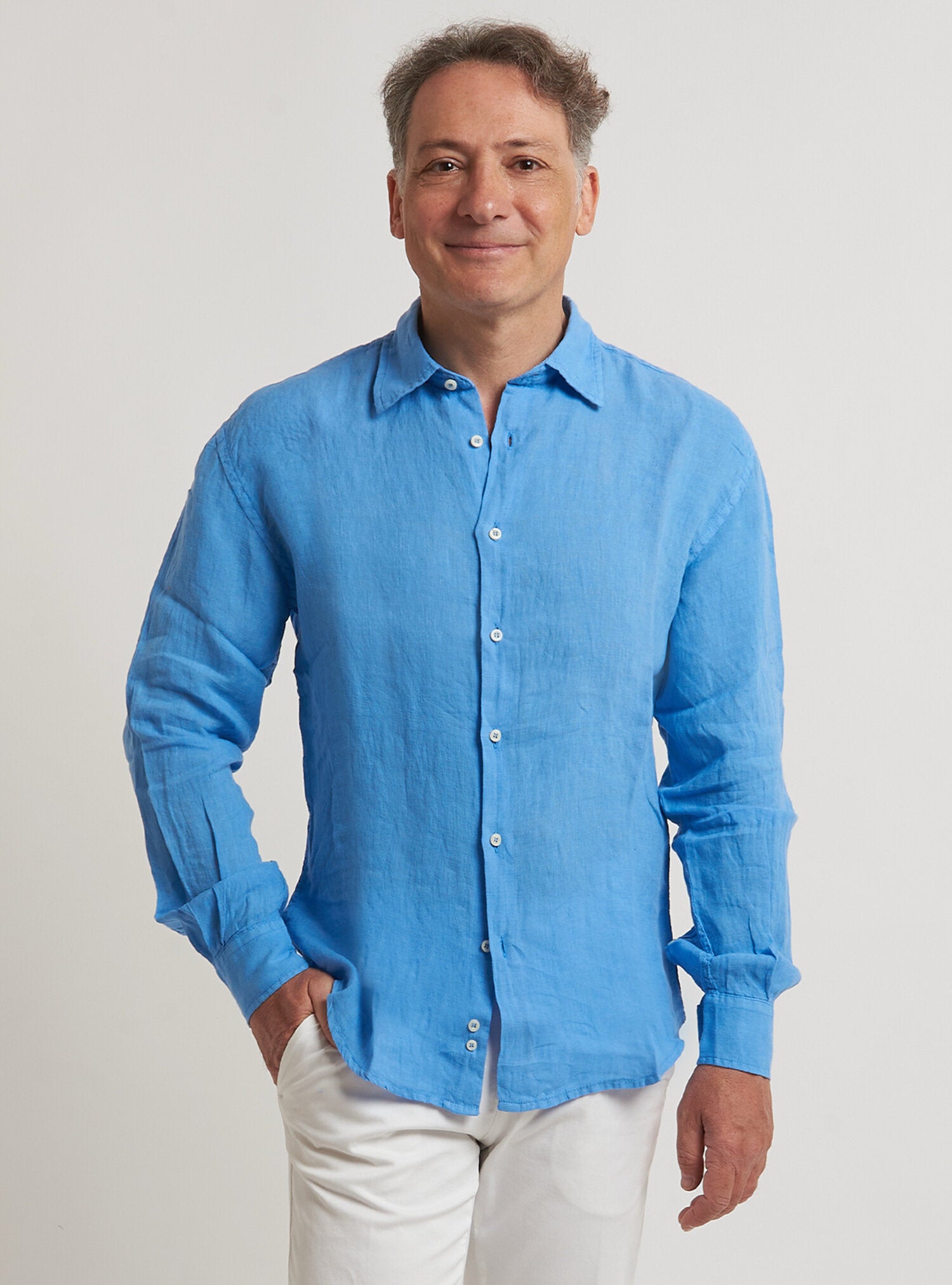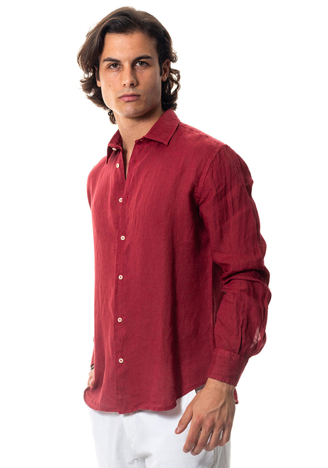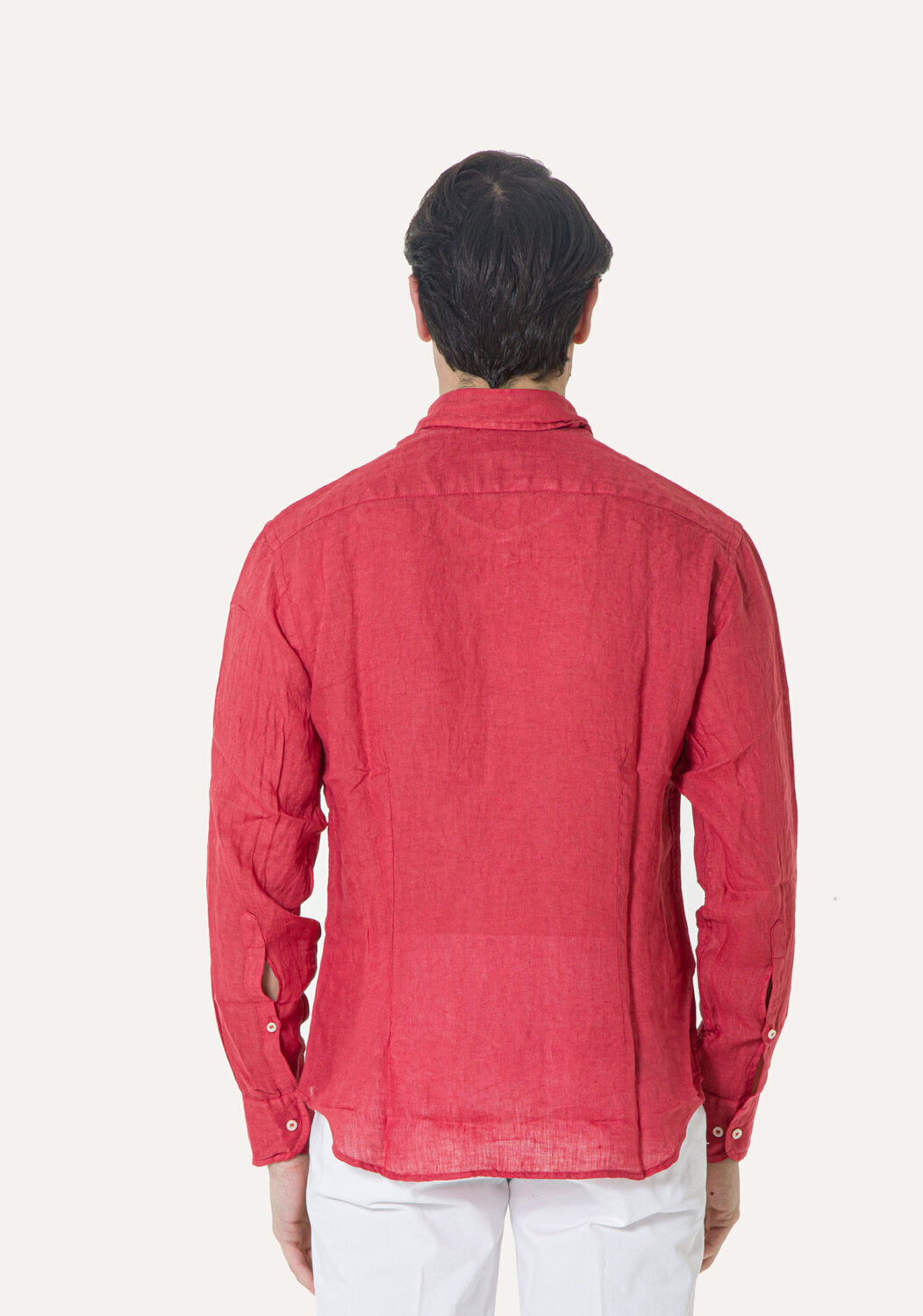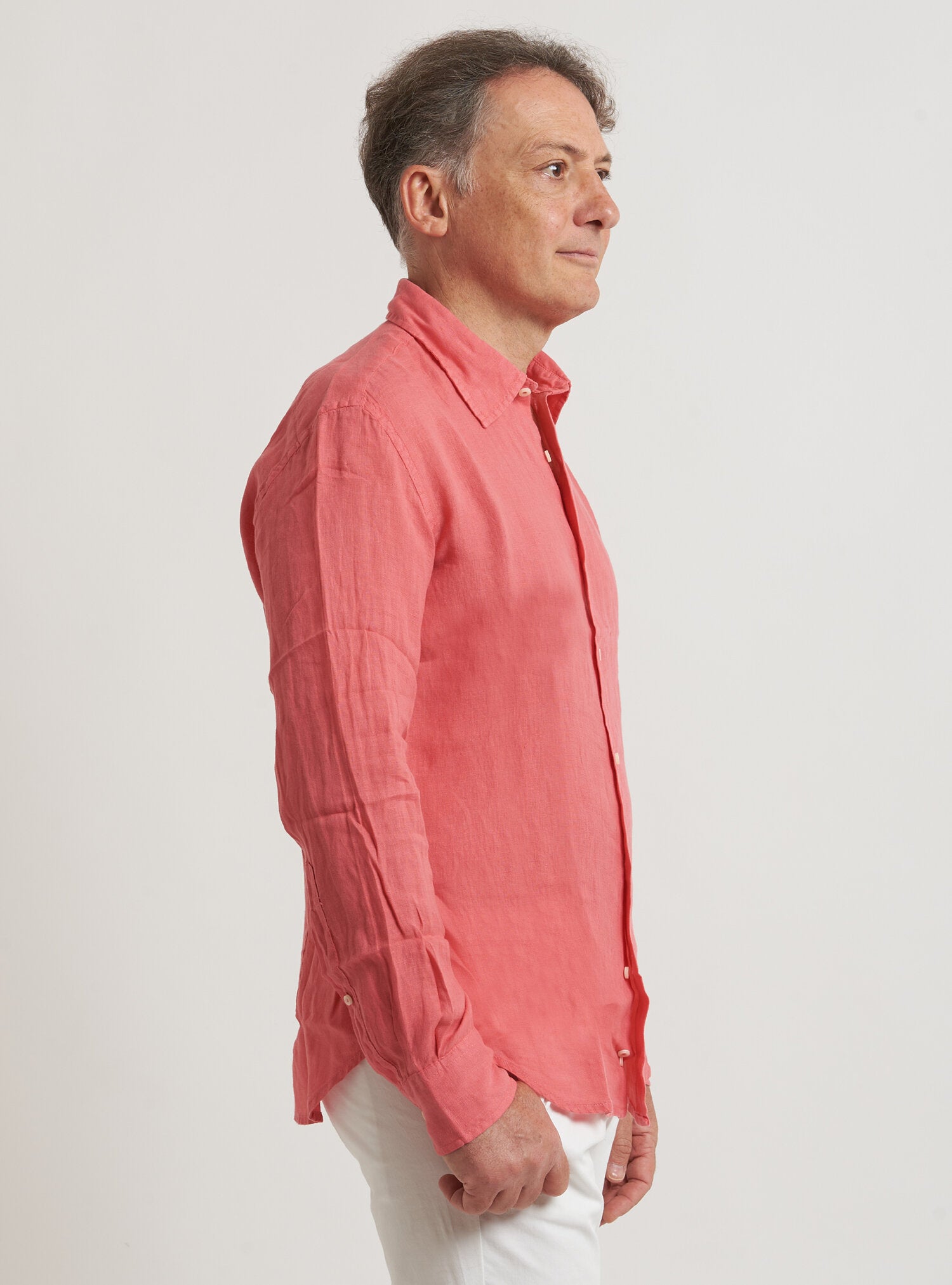 Camicia WILLIAM realizzata in puro lino lavato di alta qualità. Il collo è modello francese totalmente destrutturato e morbido. È realizzata con 2 pinces dietro la schiena. La vestibilità è semi slim. Composizione 100% lino.
