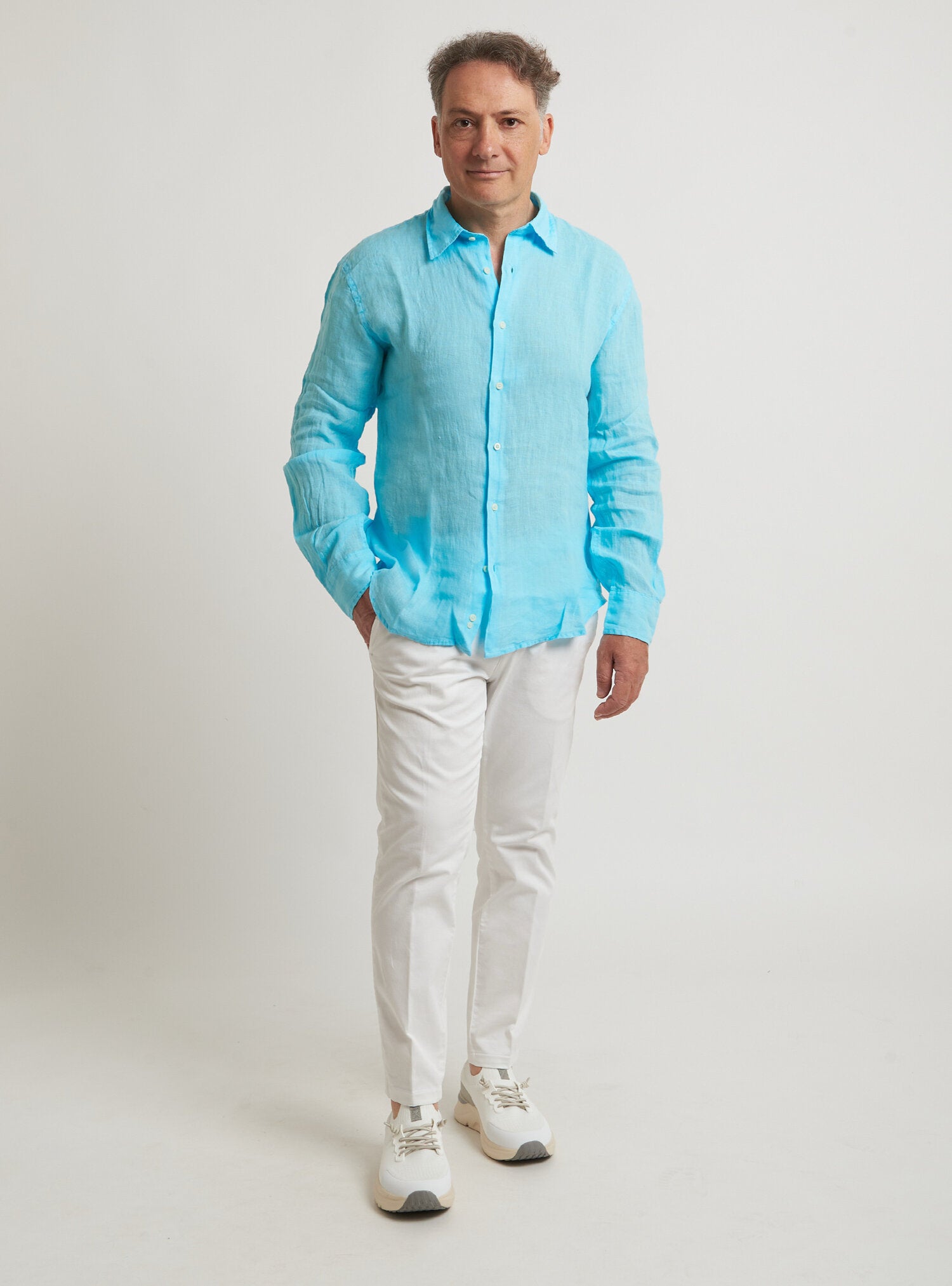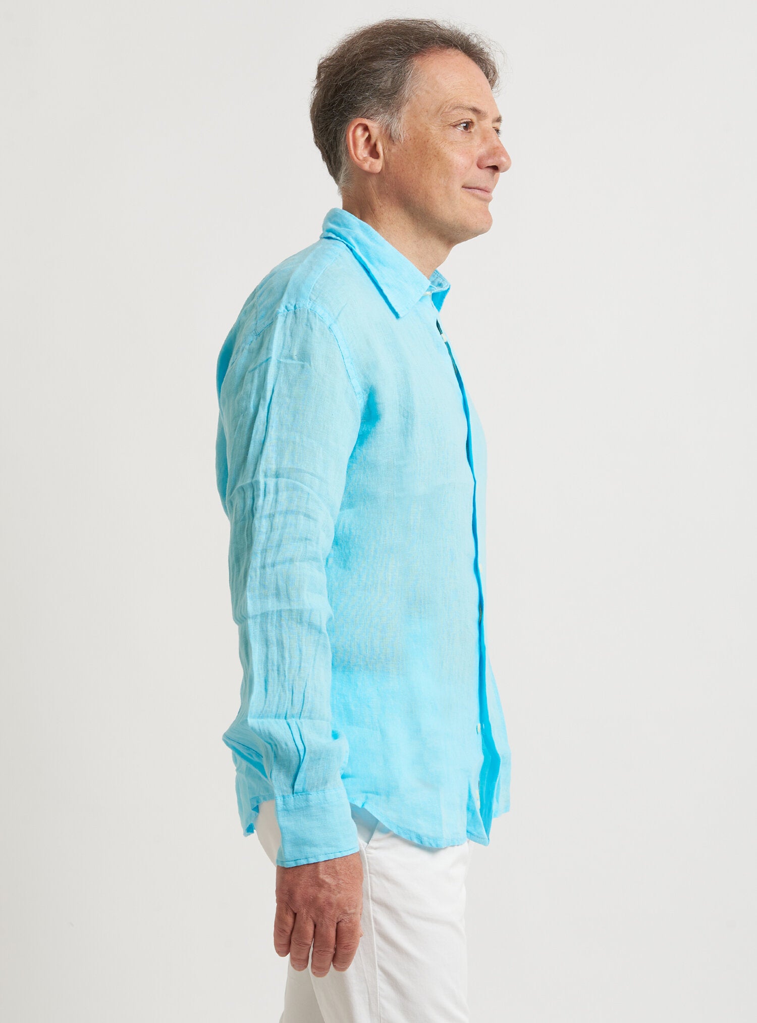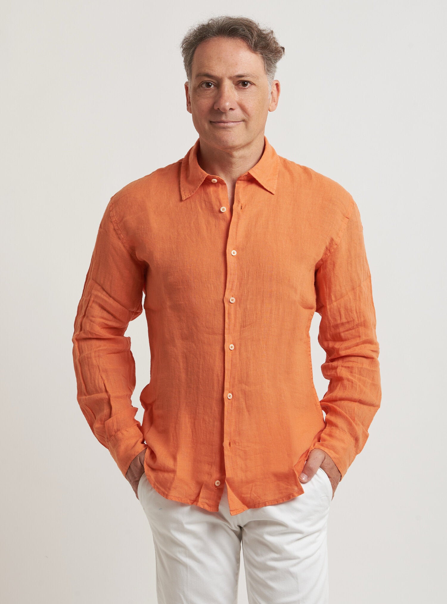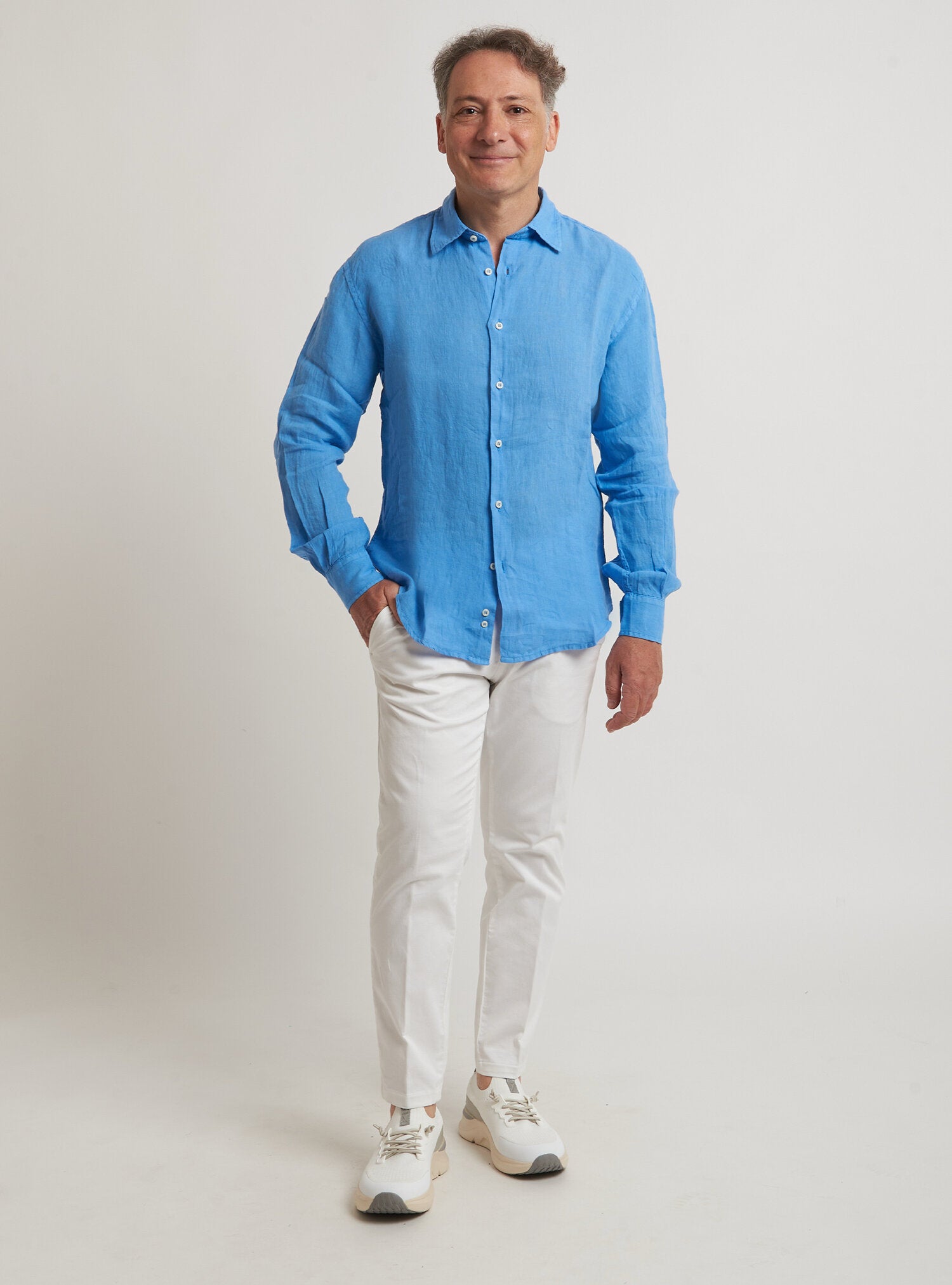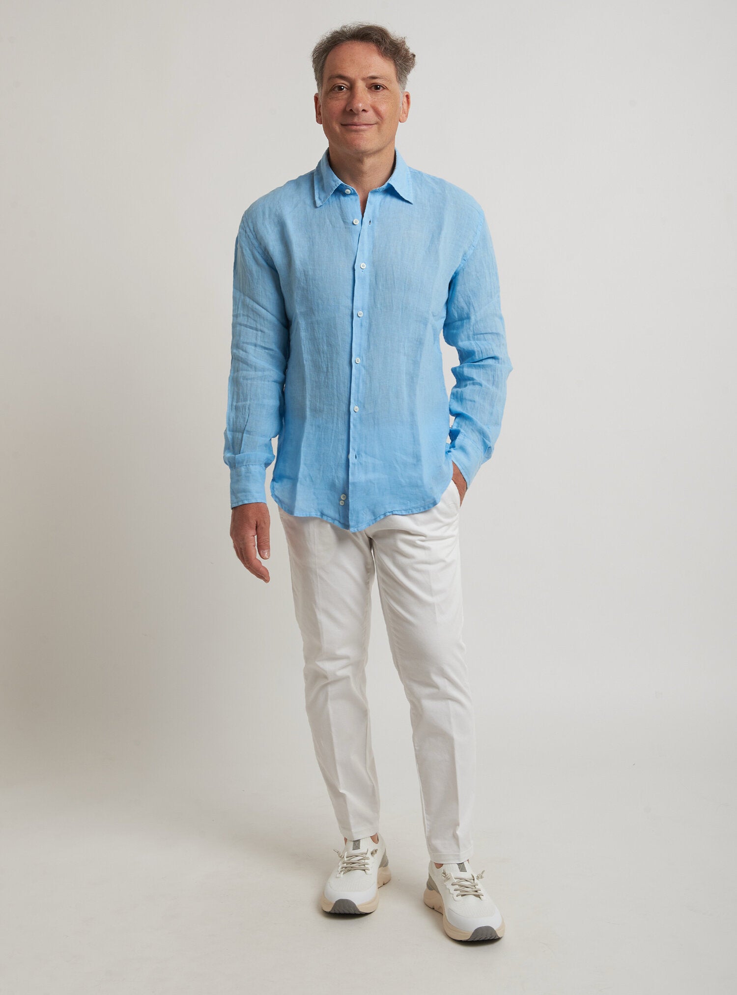 Camicia WILLIAM realizzata in puro lino lavato di alta qualità. Il collo è modello francese totalmente destrutturato e morbido. È realizzata con 2 pinces dietro la schiena. La vestibilità è semi slim. Composizione 100% lino.