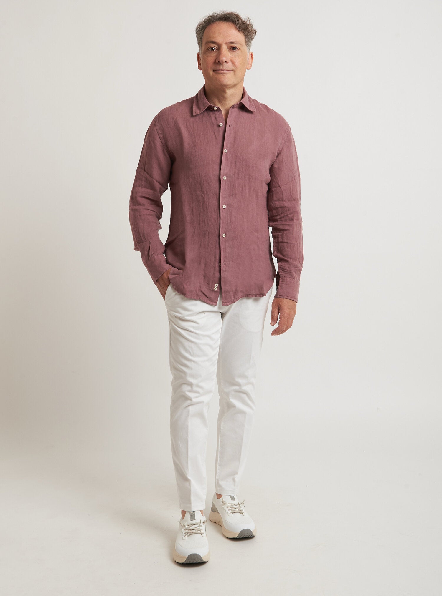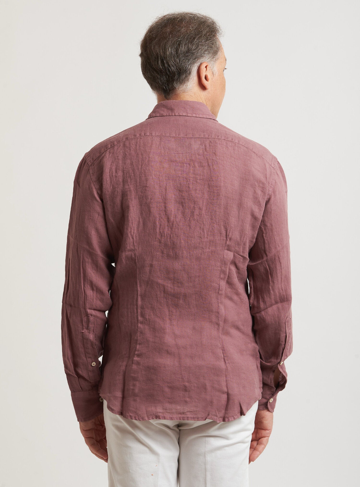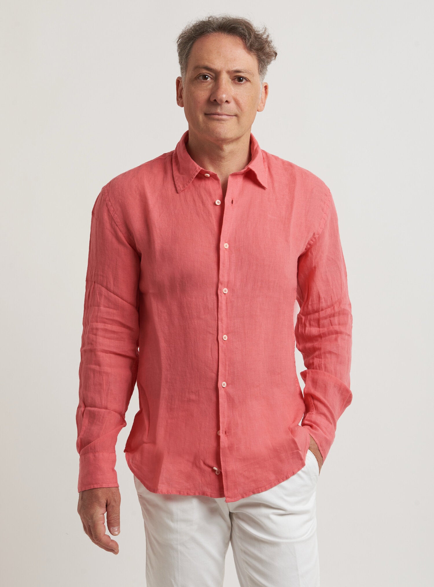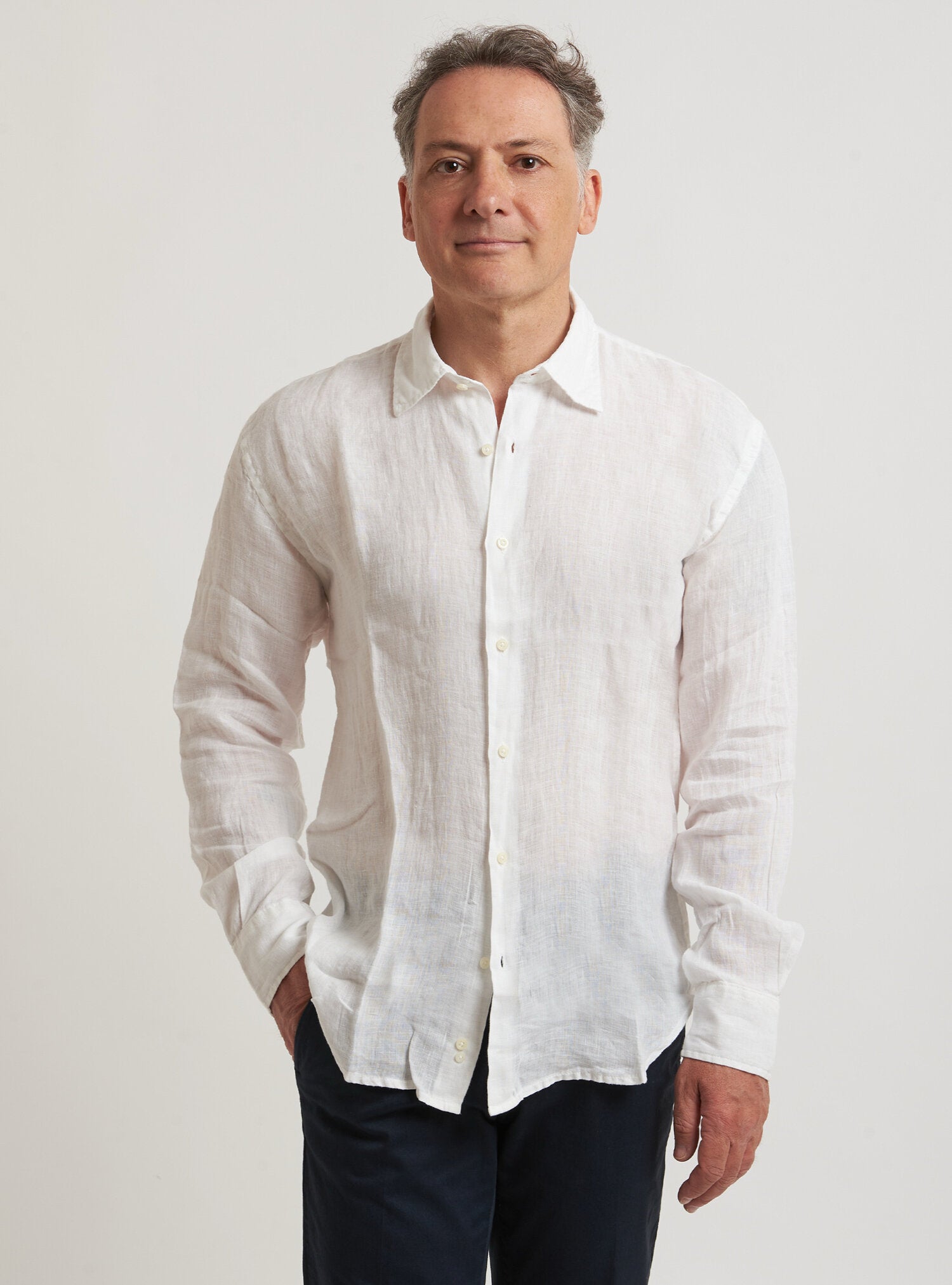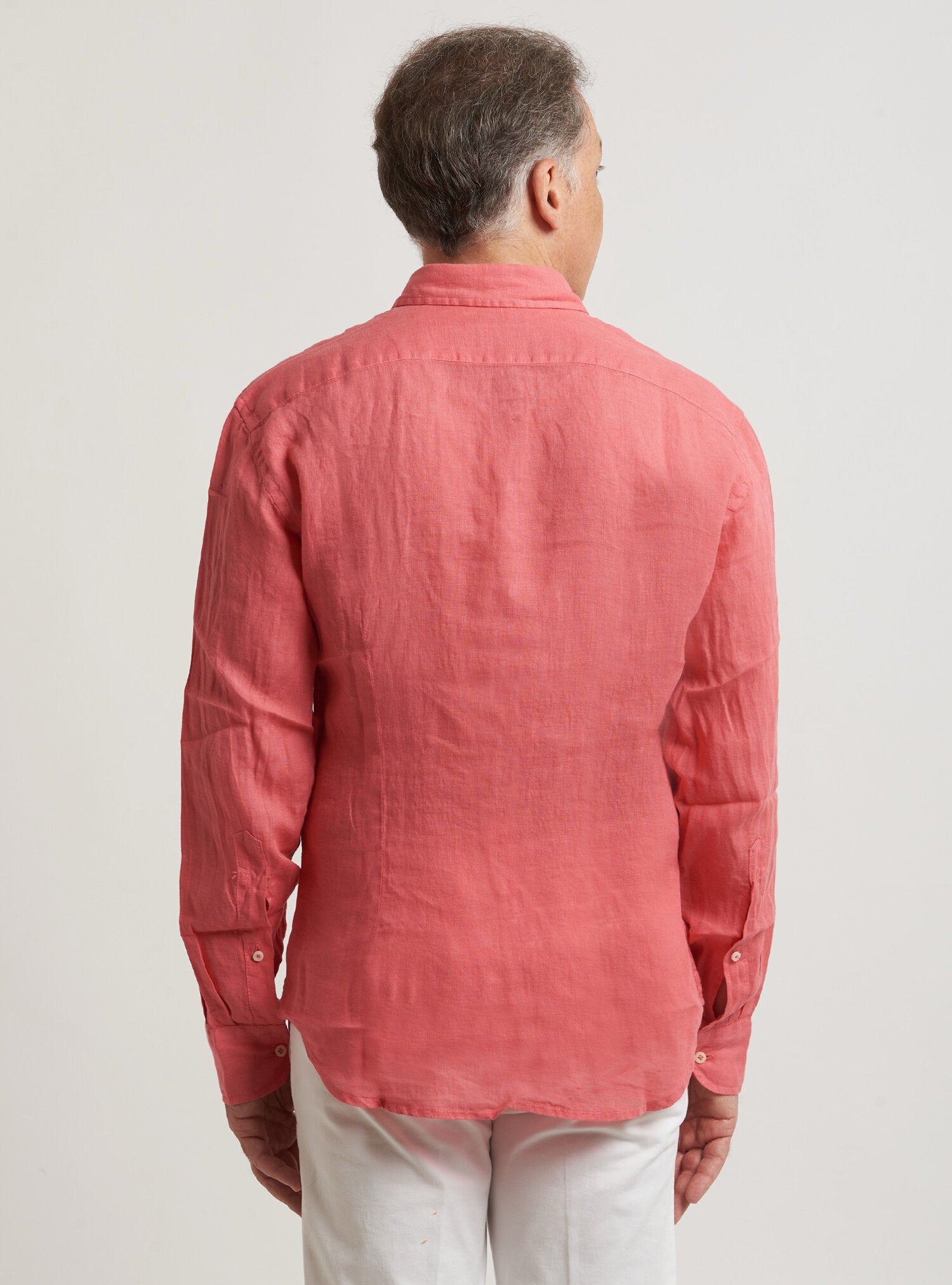 Camicia WILLIAM realizzata in puro lino lavato di alta qualità. Il collo è modello francese totalmente destrutturato e morbido. È realizzata con 2 pinces dietro la schiena. La vestibilità è semi slim. Composizione 100% lino.