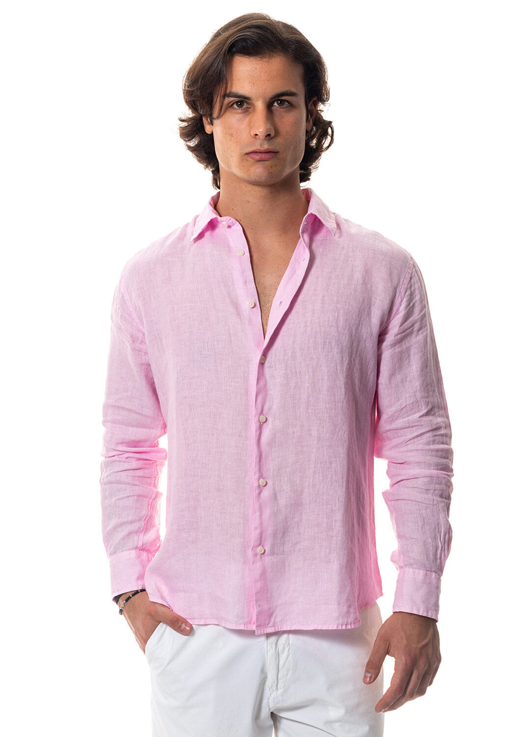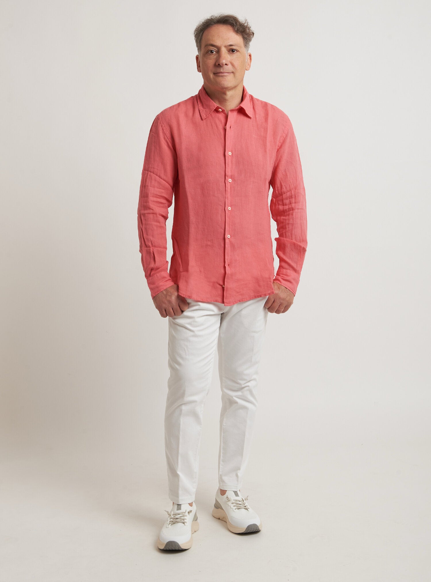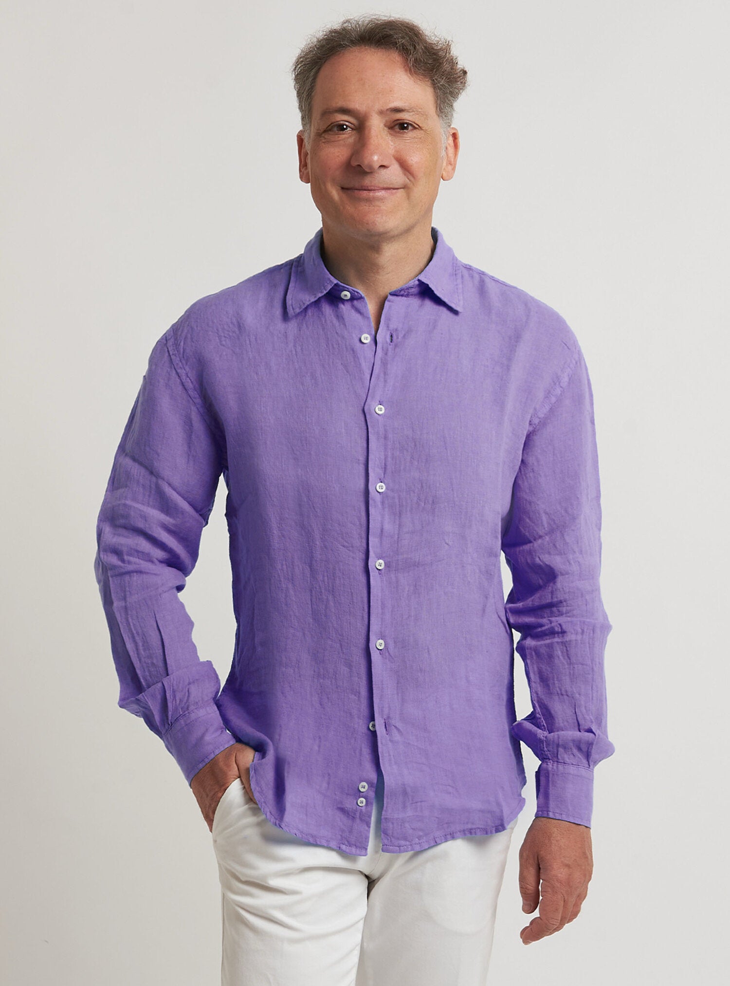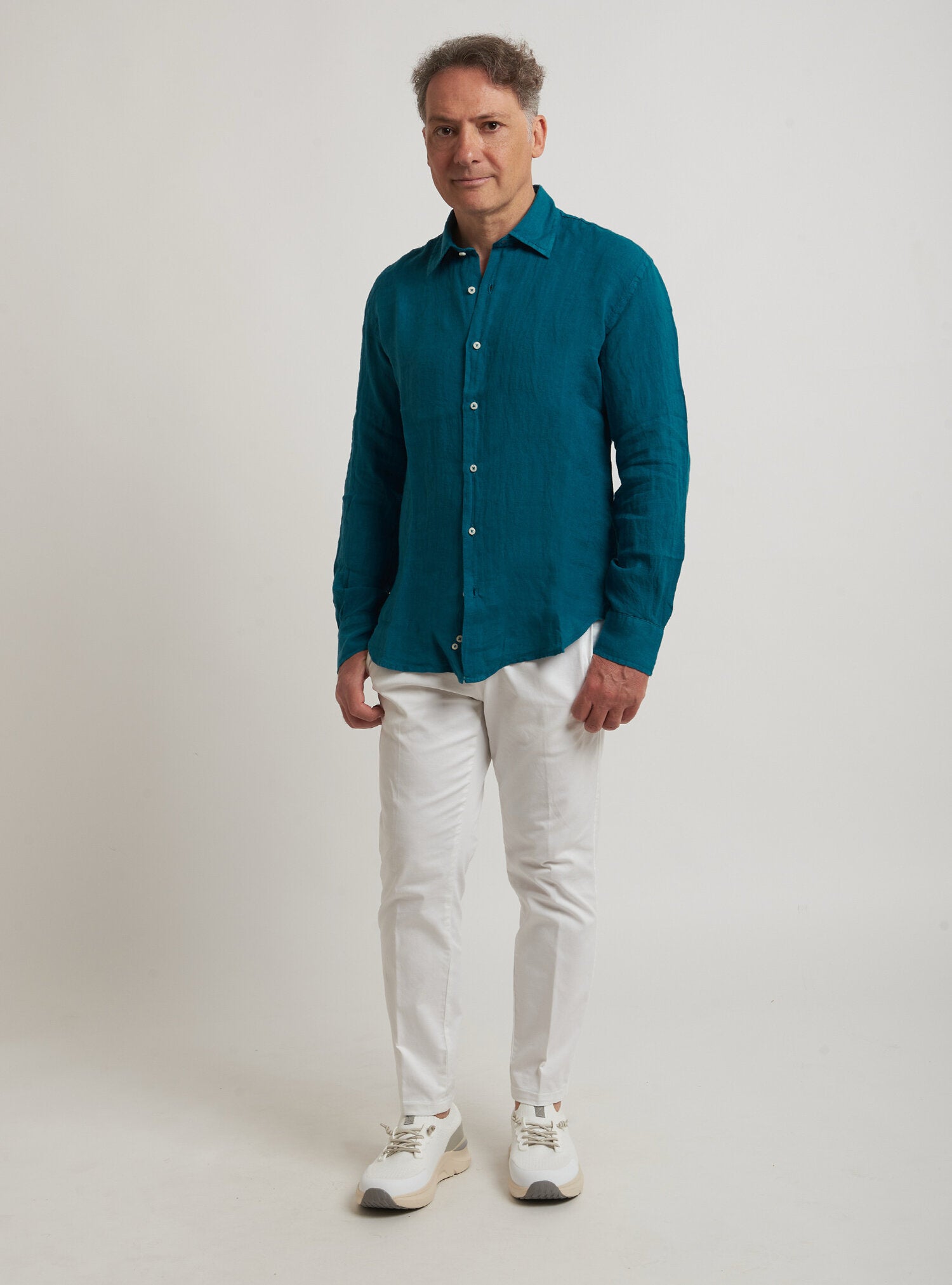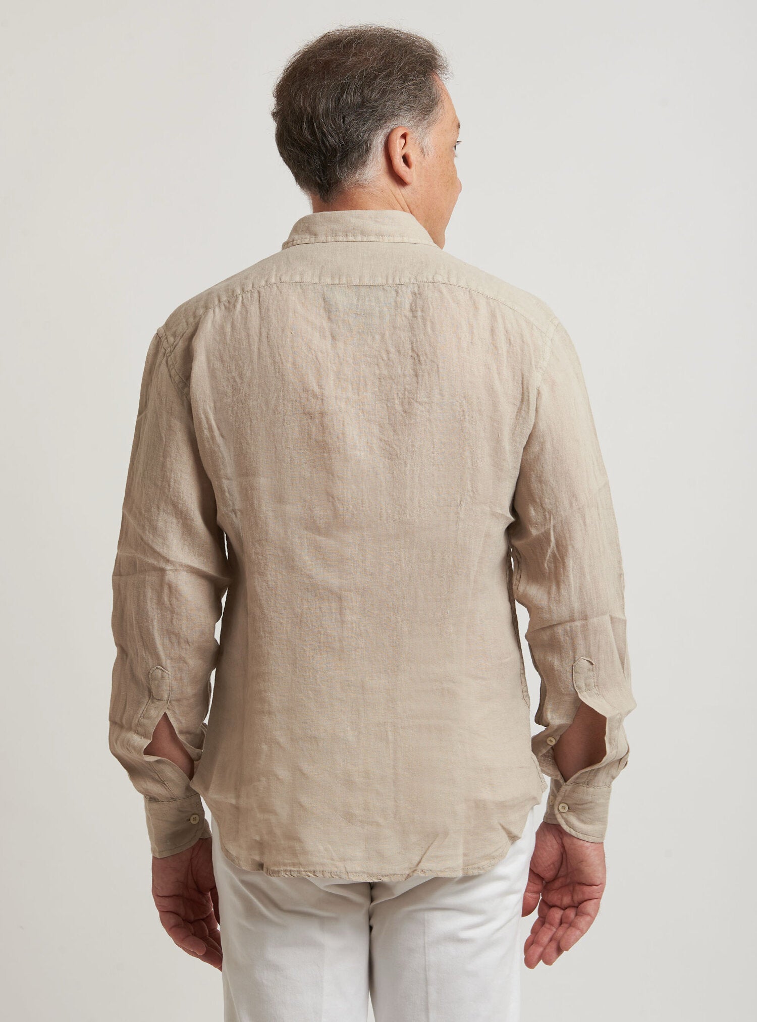Camicia WILLIAM realizzata in puro lino lavato di alta qualità. Il collo è modello francese totalmente destrutturato e morbido. È realizzata con 2 pinces dietro la schiena. La vestibilità è semi slim. Composizione 100% lino.