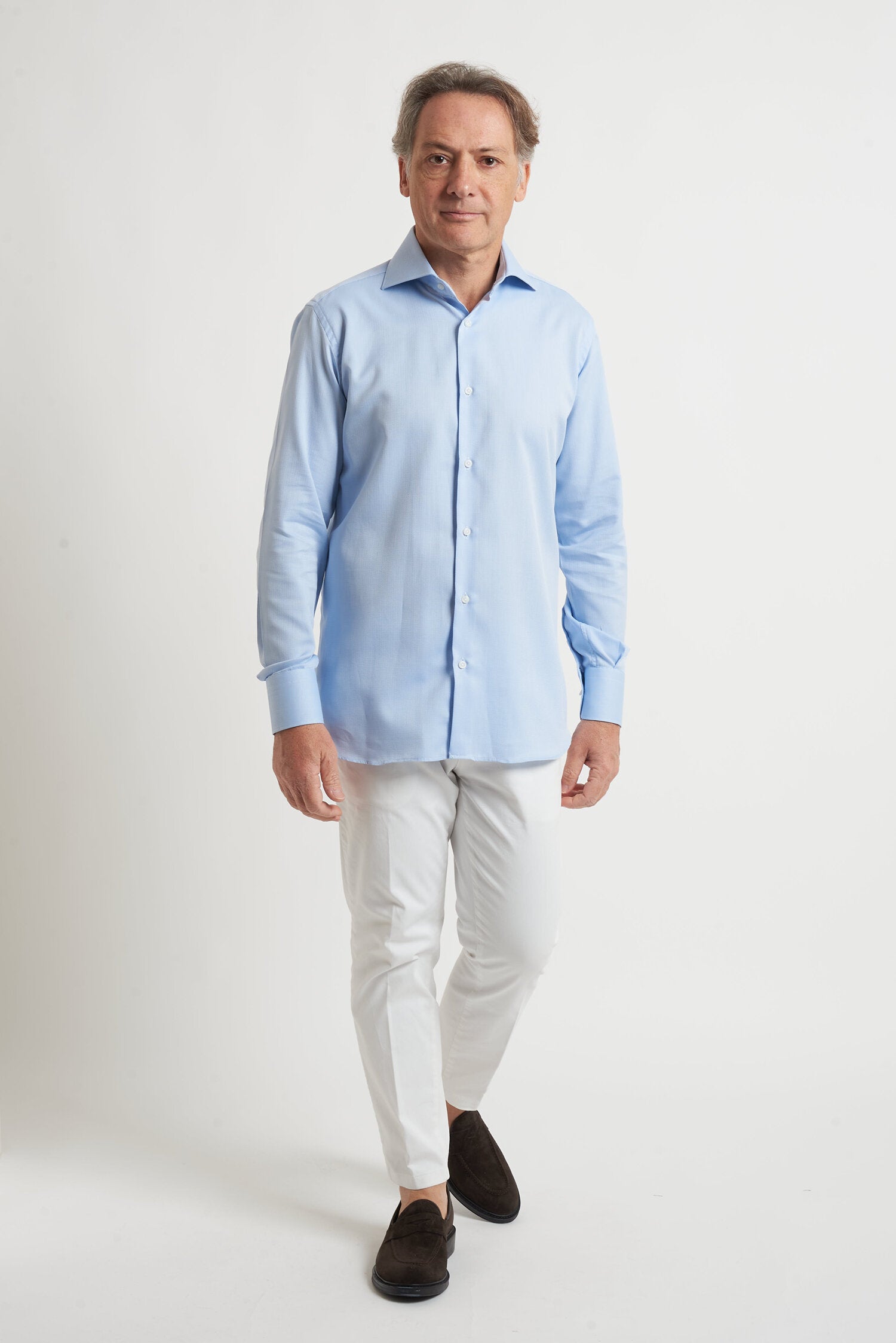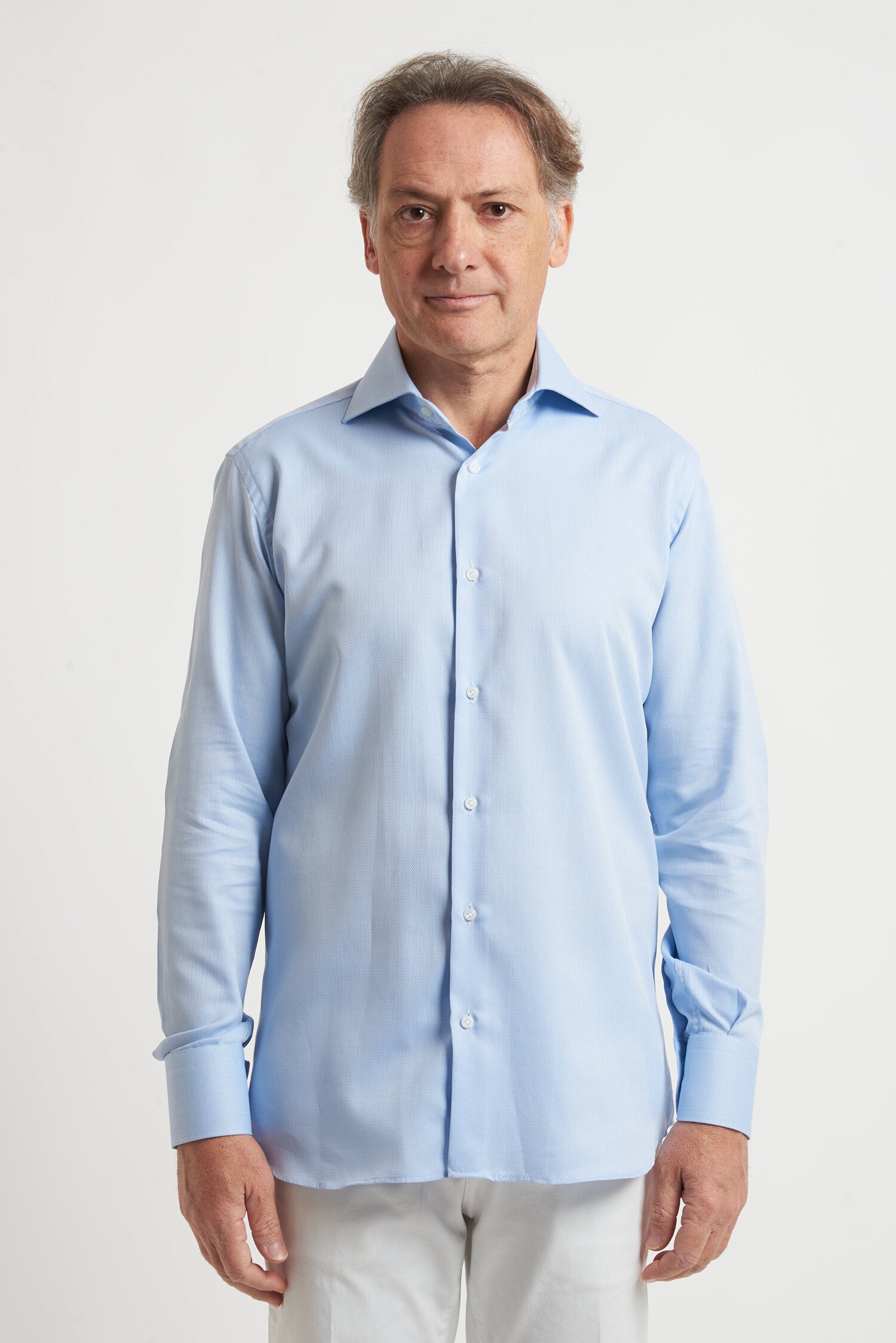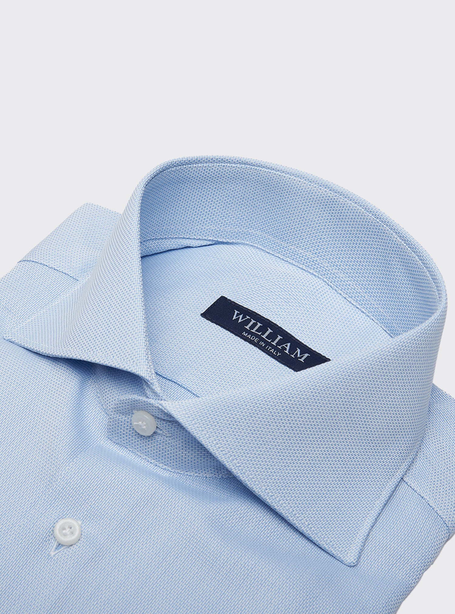 Camicia WILLIAM tinta unita realizzata in puro cotone di alta qualità con trama armaturata. Il collo è modello francese con pistagna di 4 cm di altezza, rigido e con stecche interne. È realizzata con 2 pinces dietro la schiena. Il polso è caratterizzato dall'avere 2 asole ed 1 bottone...lo puoi abbottonare normalmente oppure puoi scegliere di indossare igemelli. La vestibilità è regolare ma contemporanea. Composizione: 100% cotone.