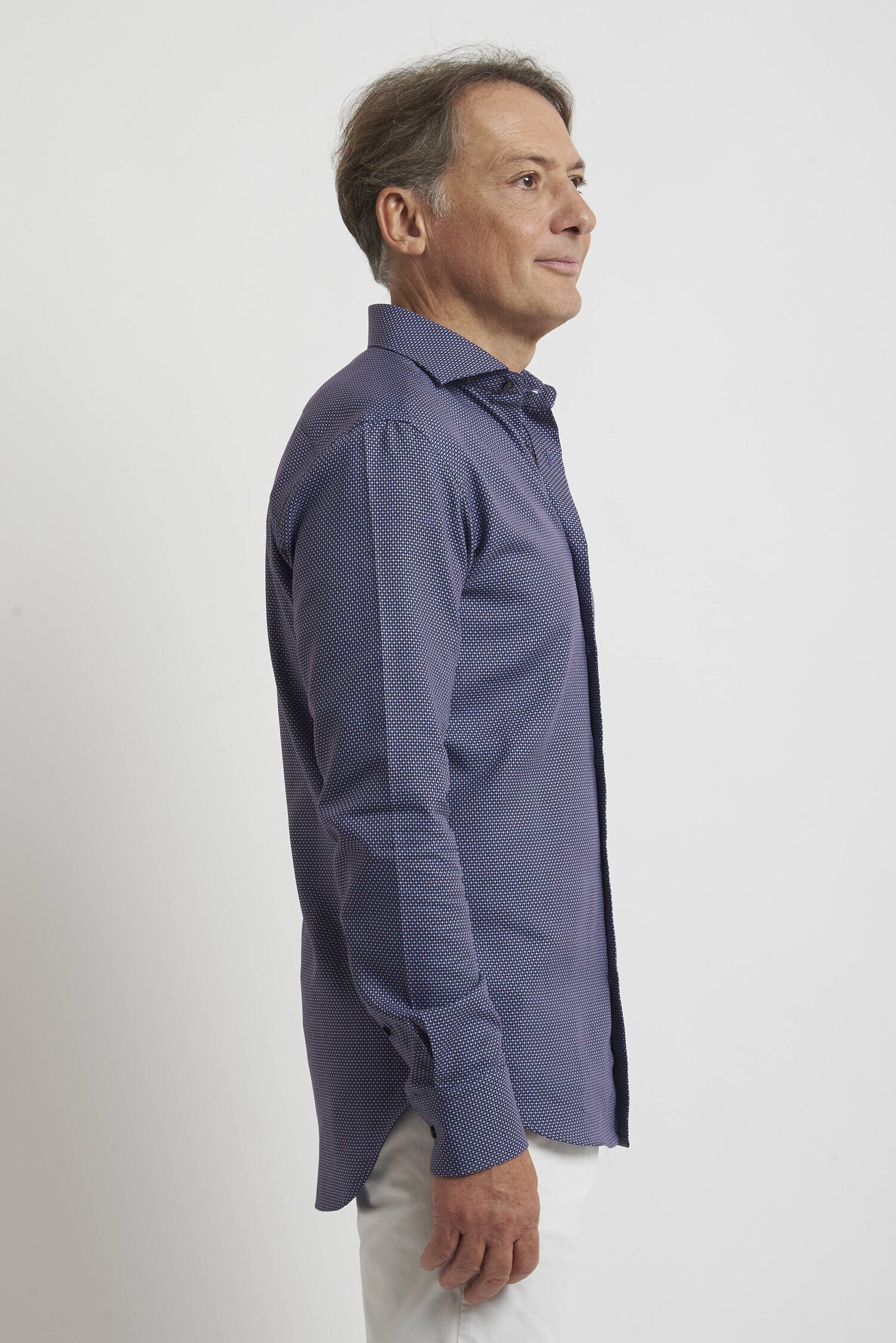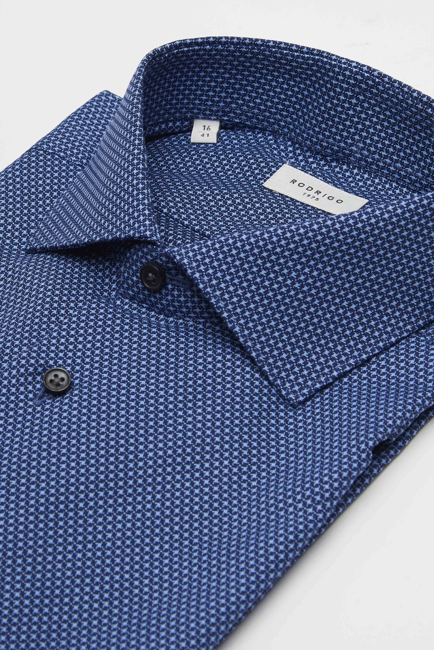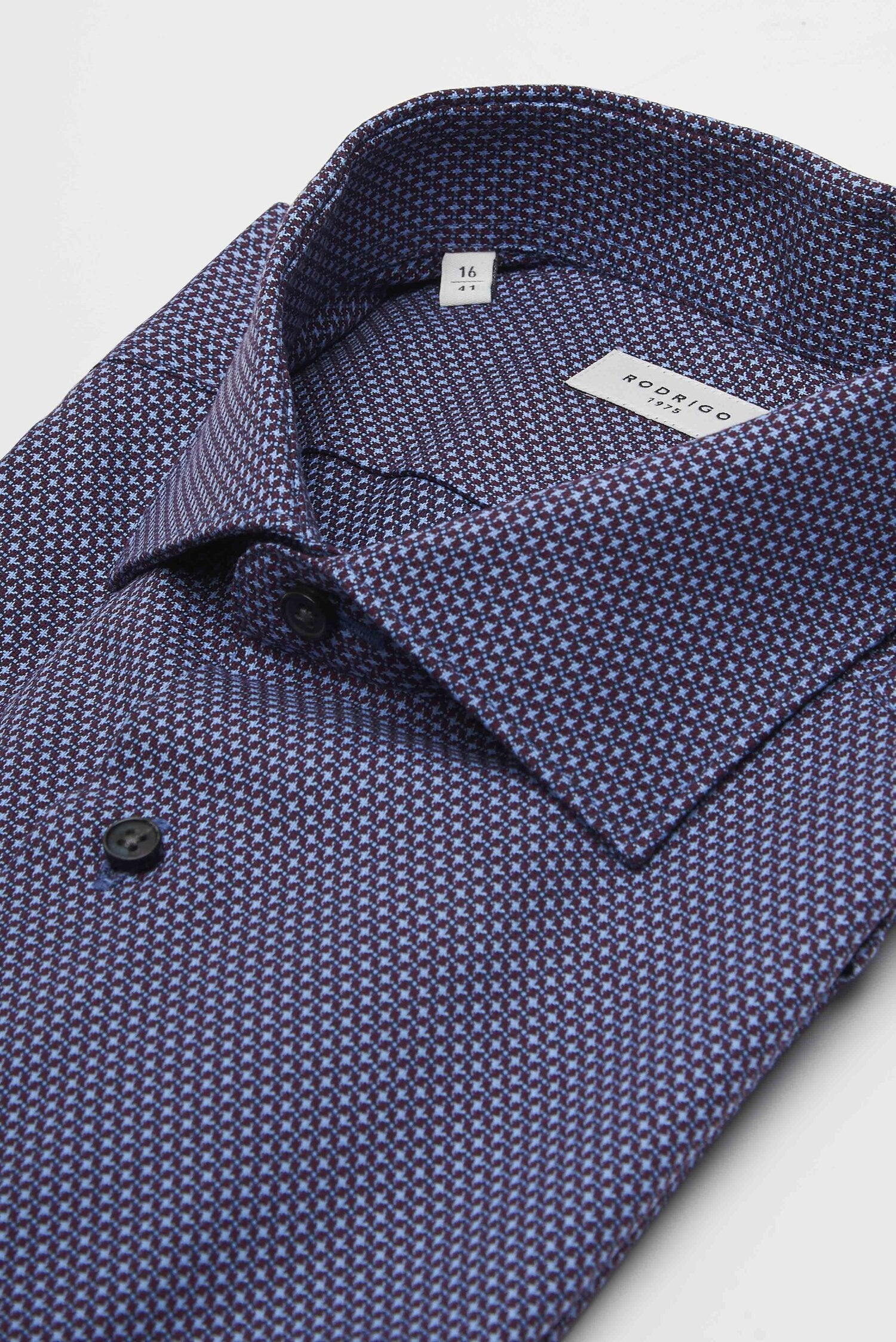 Camicia microfantasiadella rinomata azienda RODRIGO, realizzata in puro cotone armaturato di alta qualità. Il collo è modello francese con pistagna di 3,5 cm di altezza, rigido e con stecche interne. È realizzata con 2 pinces dietro la schiena. La vestibilità è regolare ma contemporanea. Composizione: 100% cotone.