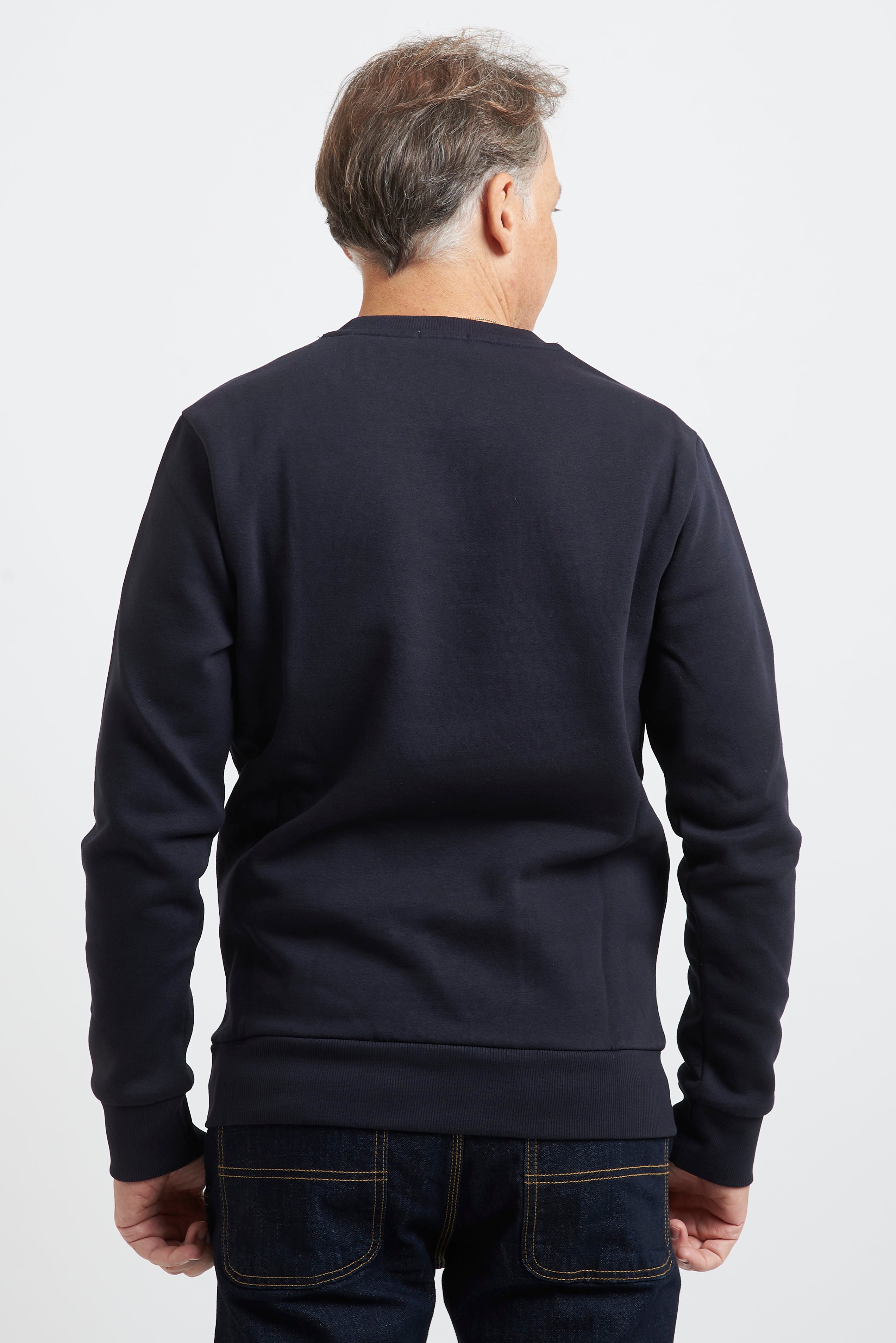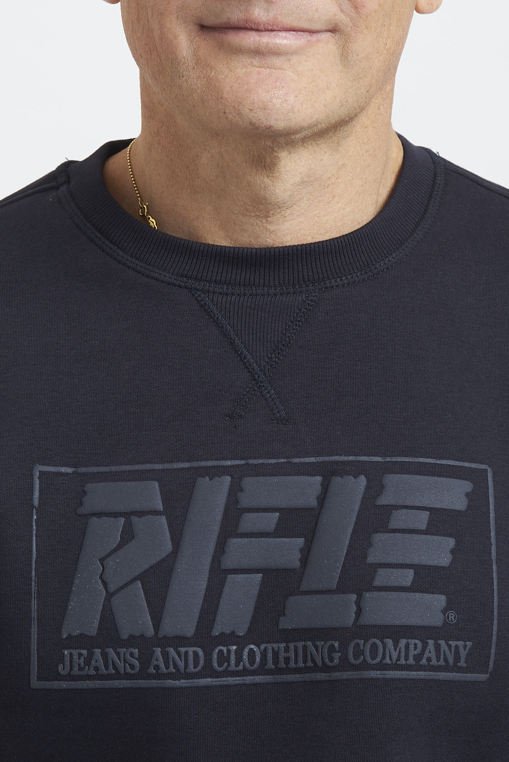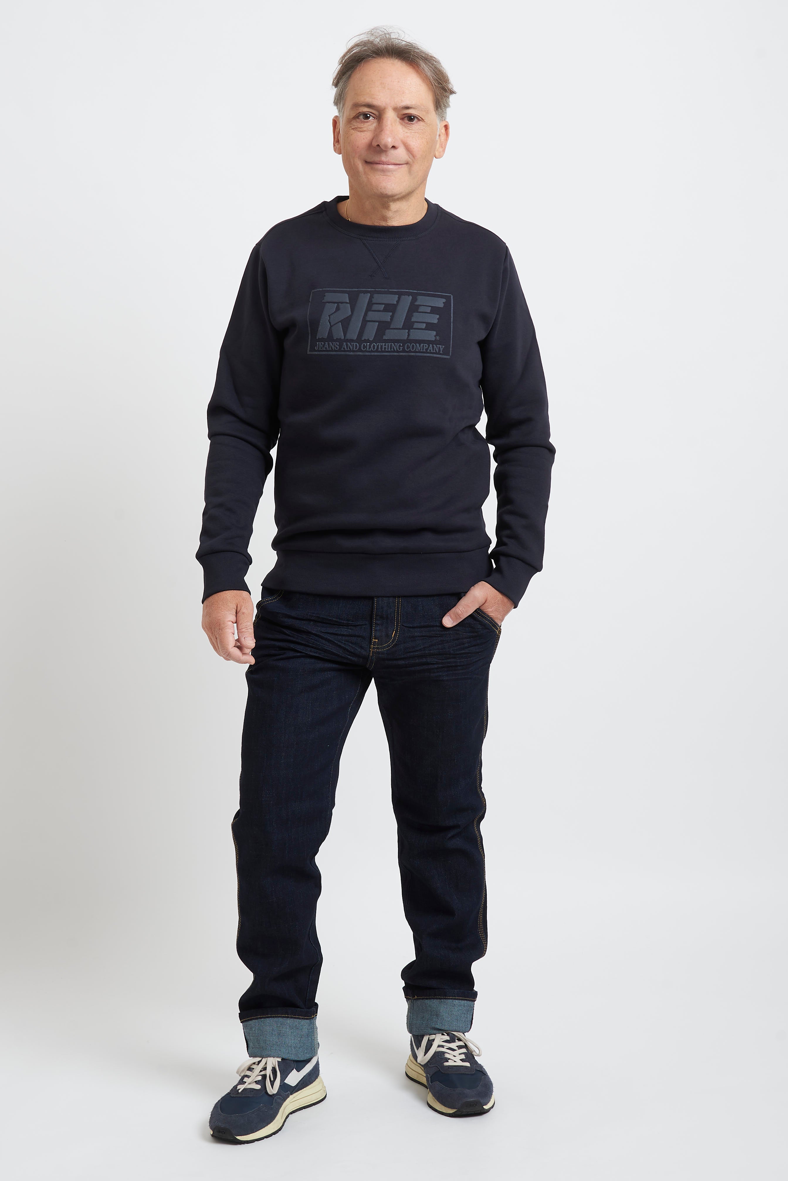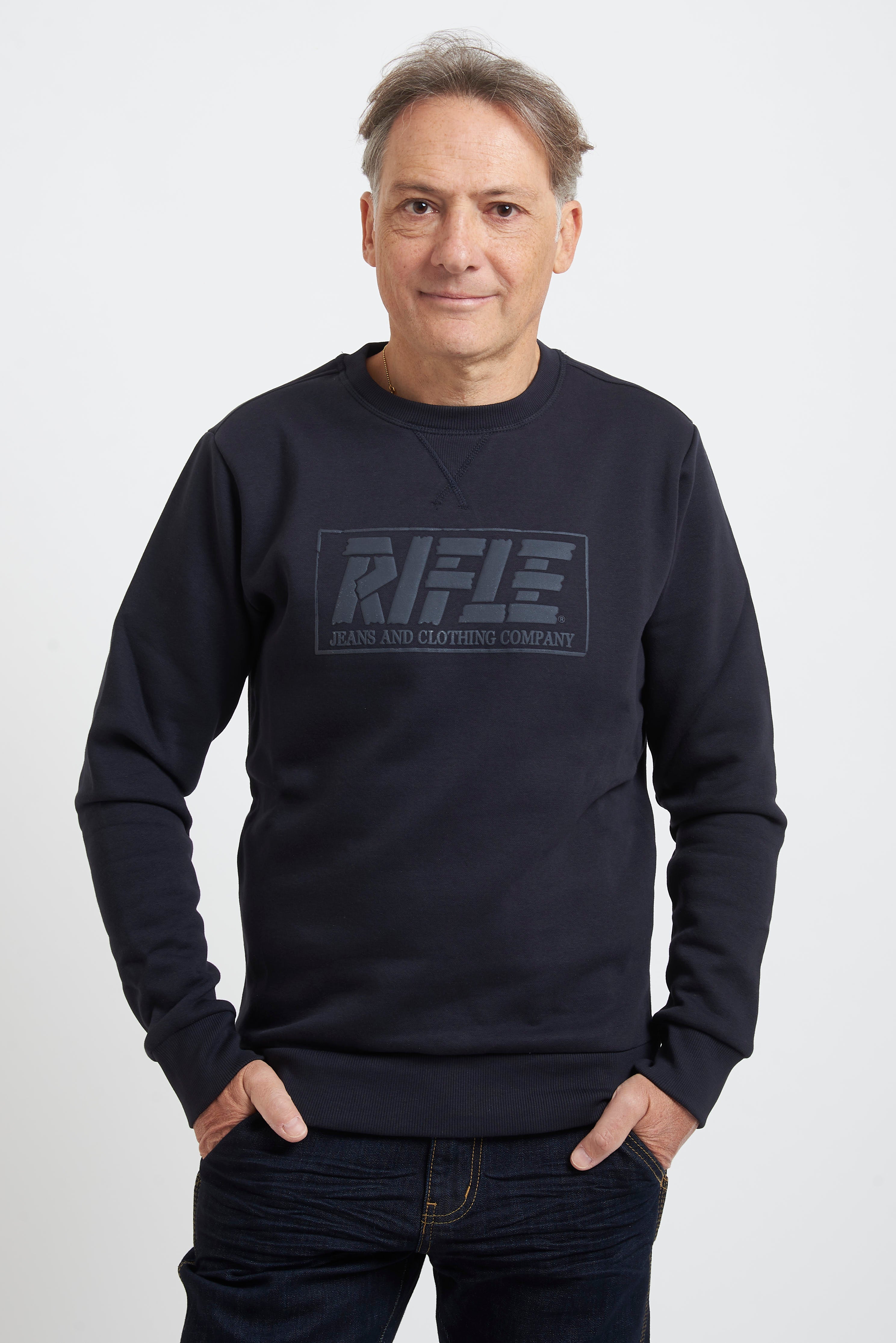 Felpa girocollo Rifle, realizzata in soffice e caldo cotone di peso invernale. L'interno è rifinito di tessuto felpato. Il collo, i polsi e la balza sono lavorati a costina. Sotto al collo è presente una caratteristica lavorazione a V anch'essa lavorata a costina. Inoltre il capo è arricchito dalla presenza del grande logo in colore tono su tono. La vestibilità è regolare. Composizione: 65% cotone - 35% poliestere.