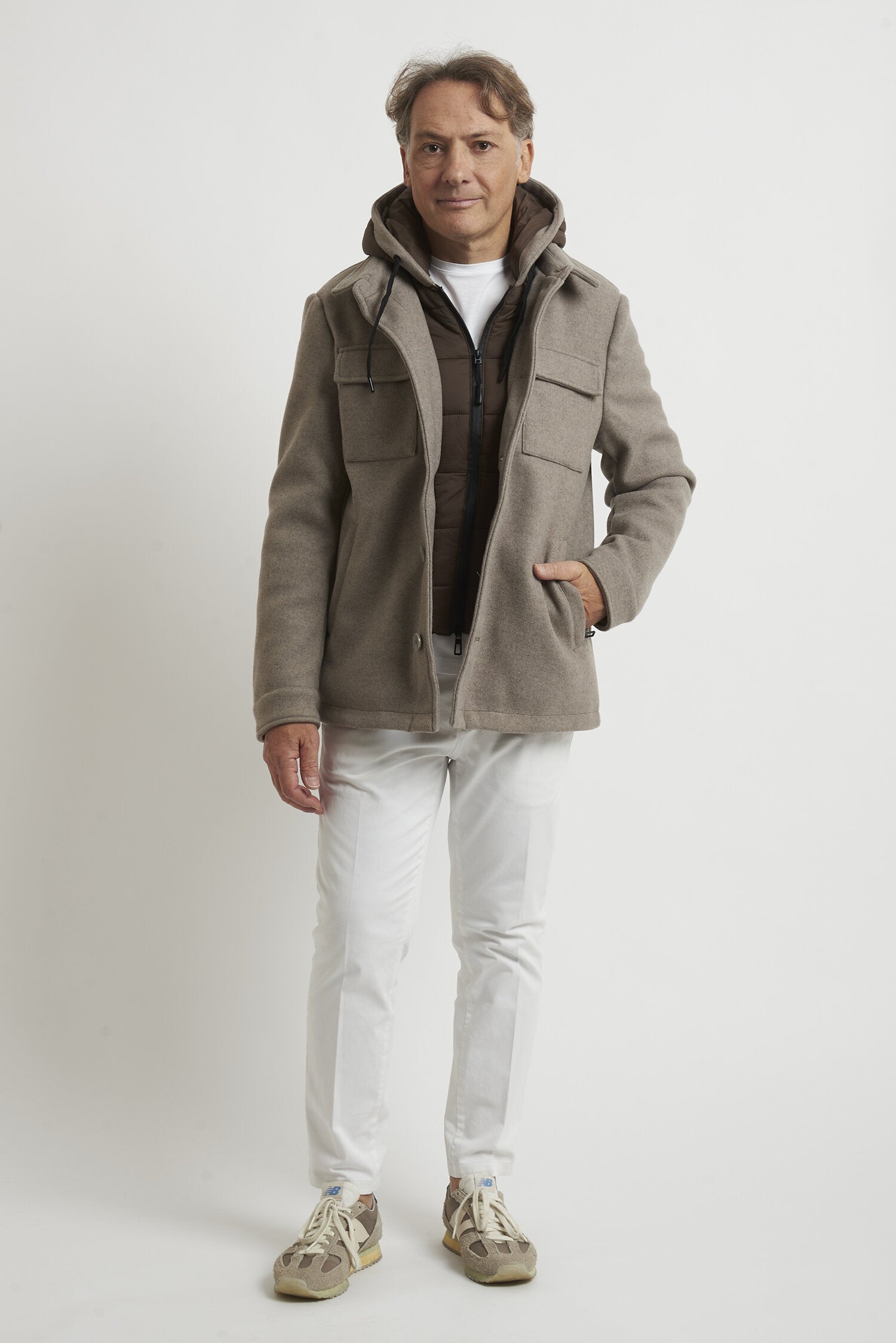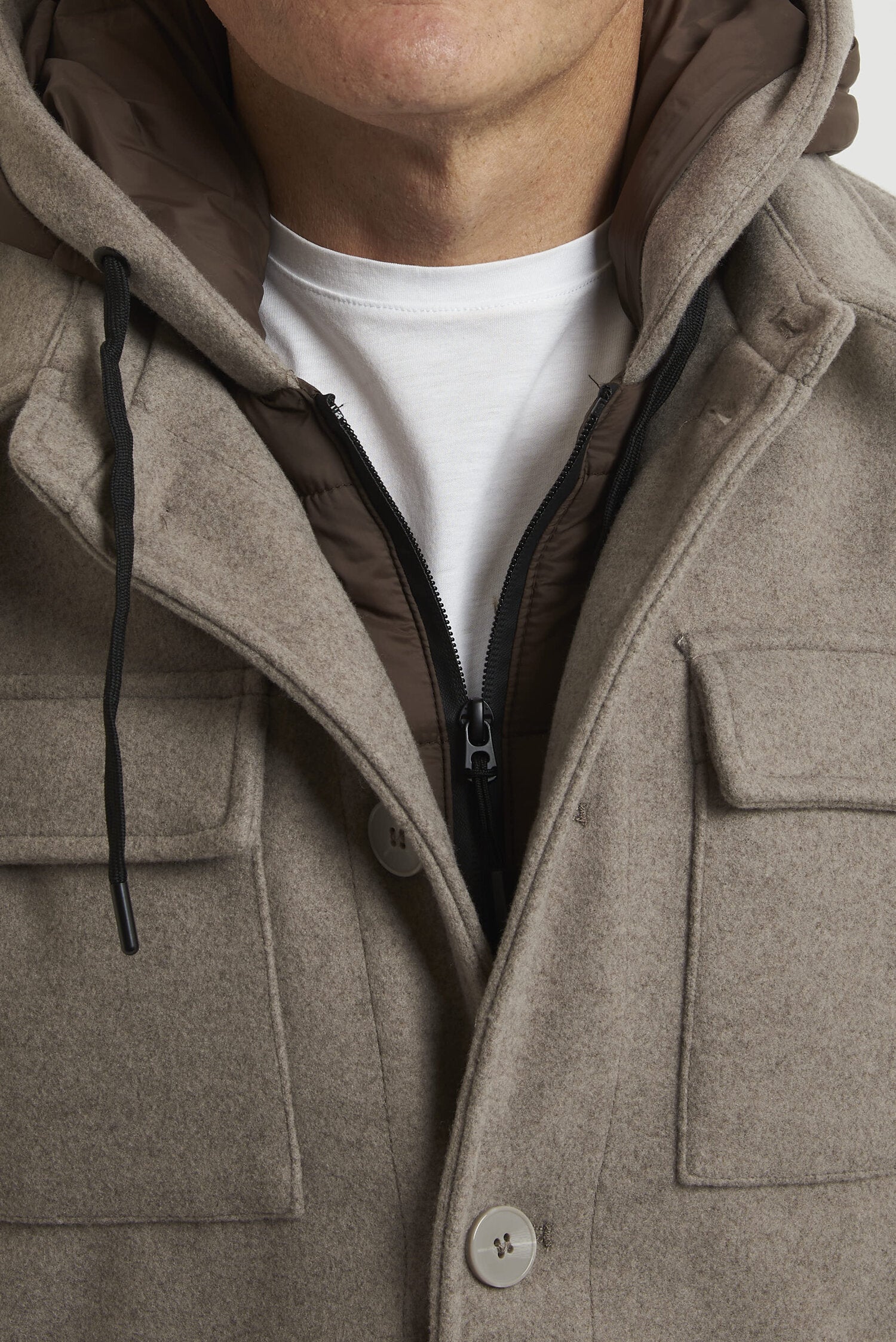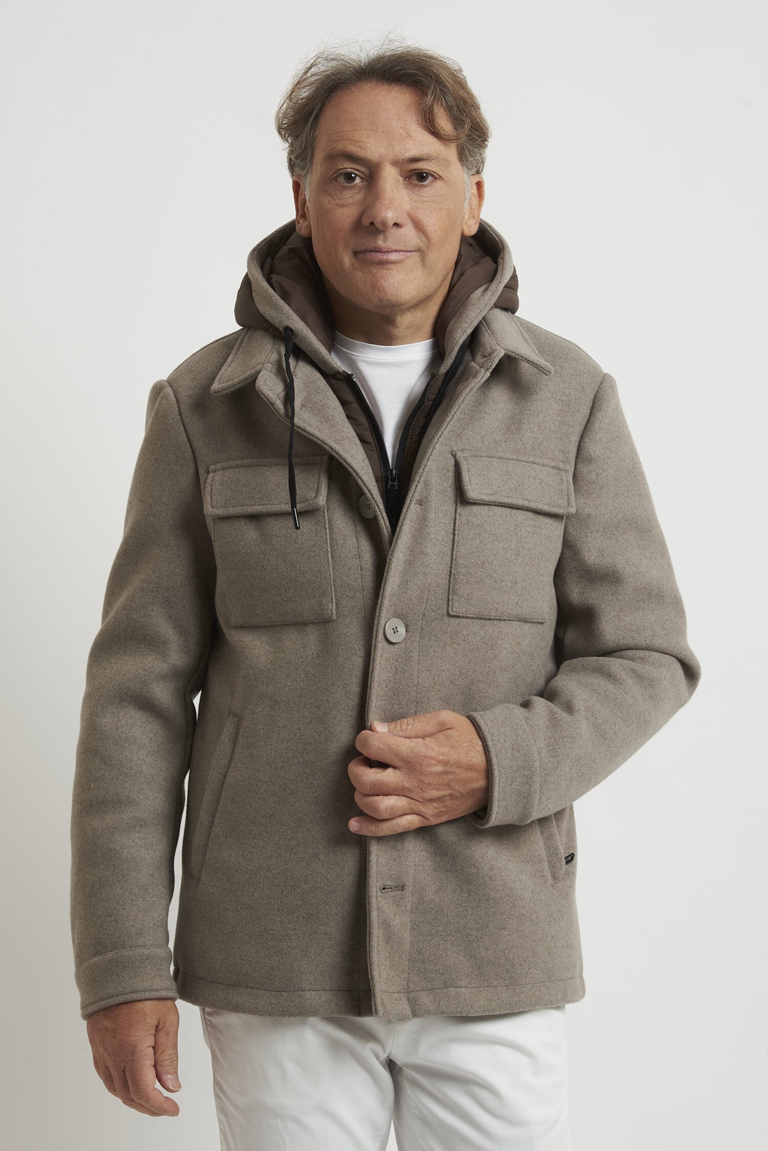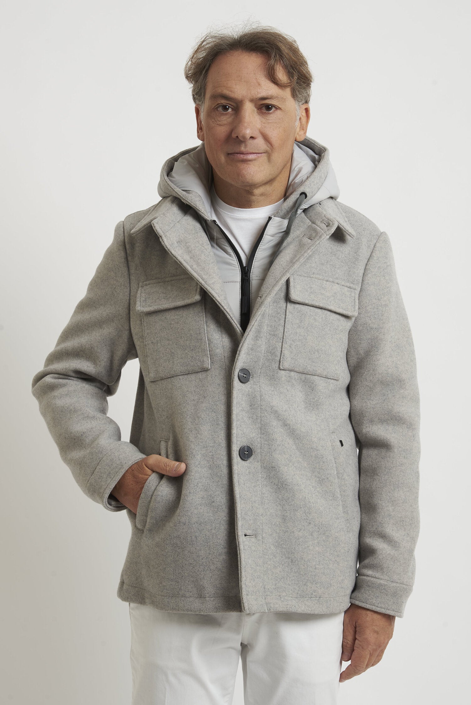 Field jacket WILLIAM di media lunghezza, realizzato in morbido tessuto tipo panno. L'imbottitura in ecopiuma ne conferisce il calore, la leggerezza e la traspirabilità. La chiusura avviene mediante bottoni. Il modello è completato dalla presenza di una pettorina antivento con cappuccio, staccabile e che chiude fino alla gola. Esternamente il capo si presenta come una giacca, arricchita dalla presenza di due tasche esterne superiori con pattina e due laterali, a filo con cerniera ricoperta. All'interno si trovano due pratiche tasche con cerniera. La vestibilità è regolare. Composizione: 92% poliestere - 8% viscosa