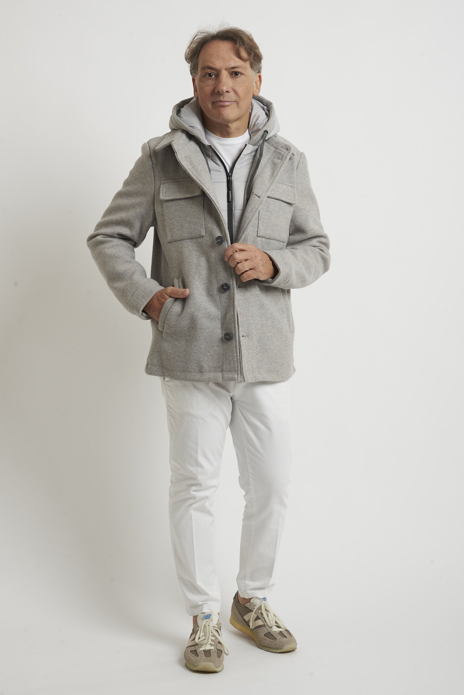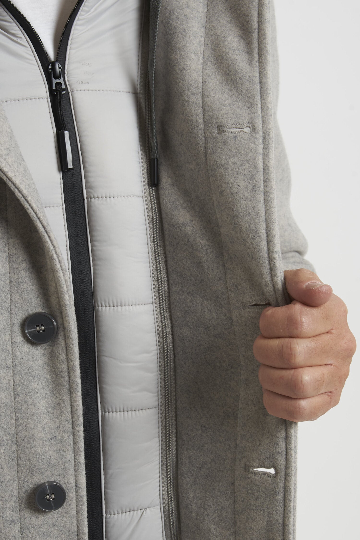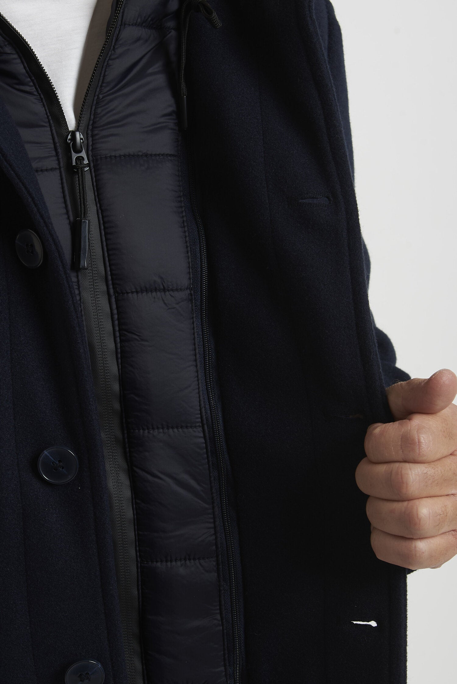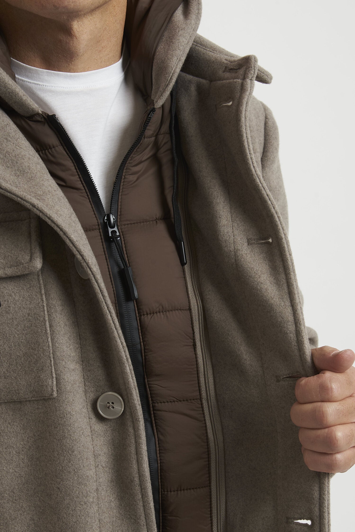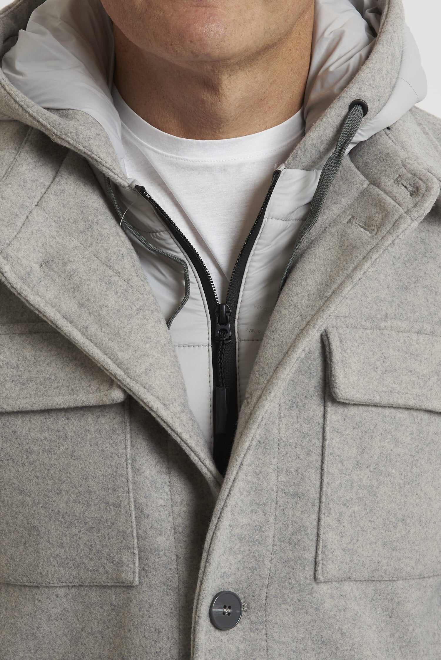 Field jacket WILLIAM di media lunghezza, realizzato in morbido tessuto tipo panno. L'imbottitura in ecopiuma ne conferisce il calore, la leggerezza e la traspirabilità. La chiusura avviene mediante bottoni. Il modello è completato dalla presenza di una pettorina antivento con cappuccio, staccabile e che chiude fino alla gola. Esternamente il capo si presenta come una giacca, arricchita dalla presenza di due tasche esterne superiori con pattina e due laterali, a filo con cerniera ricoperta. All'interno si trovano due pratiche tasche con cerniera. La vestibilità è regolare. Composizione: 92% poliestere - 8% viscosa