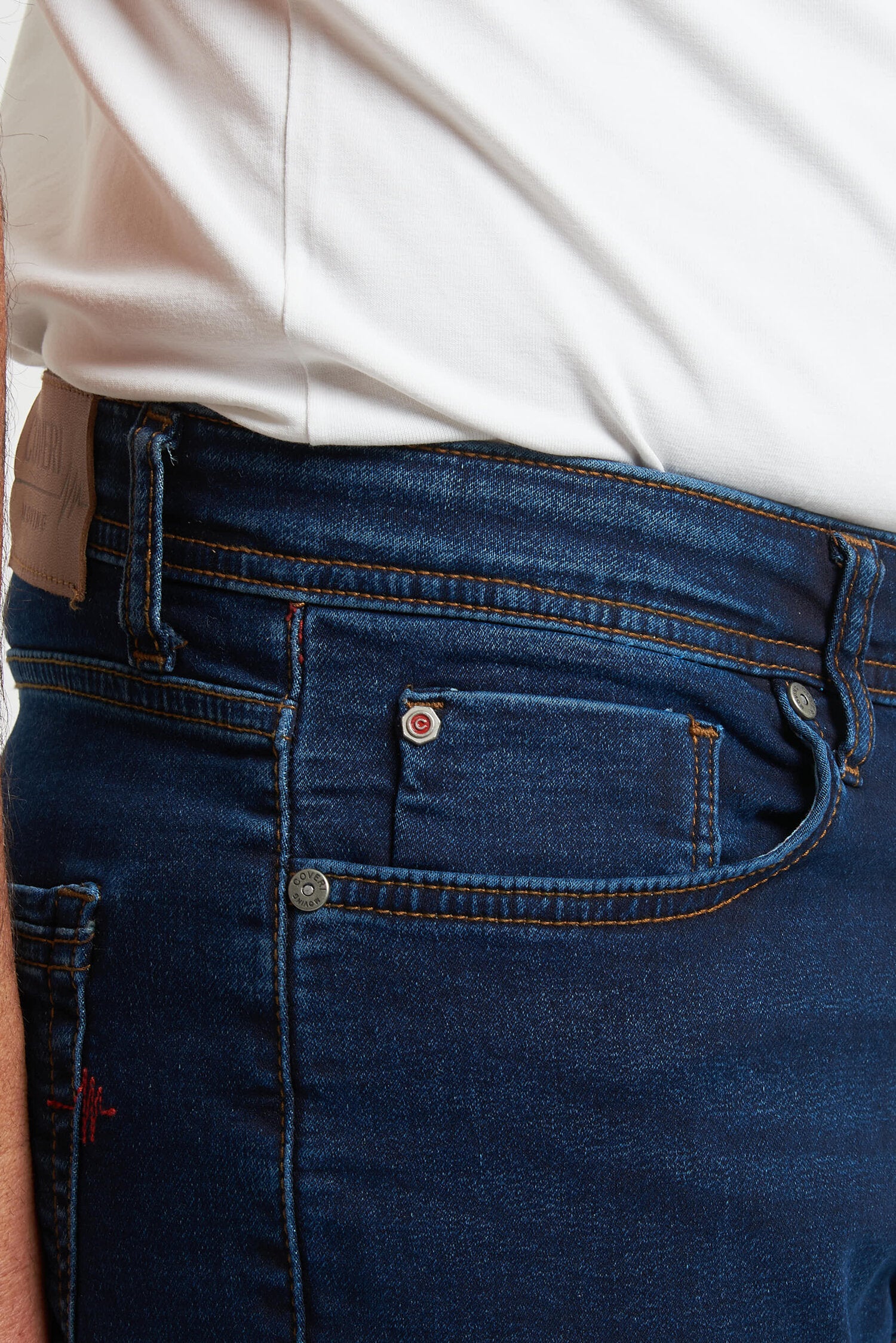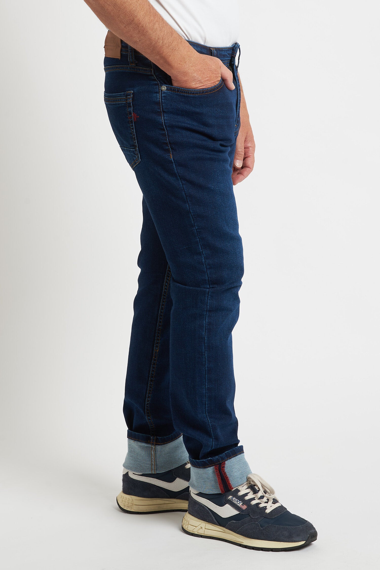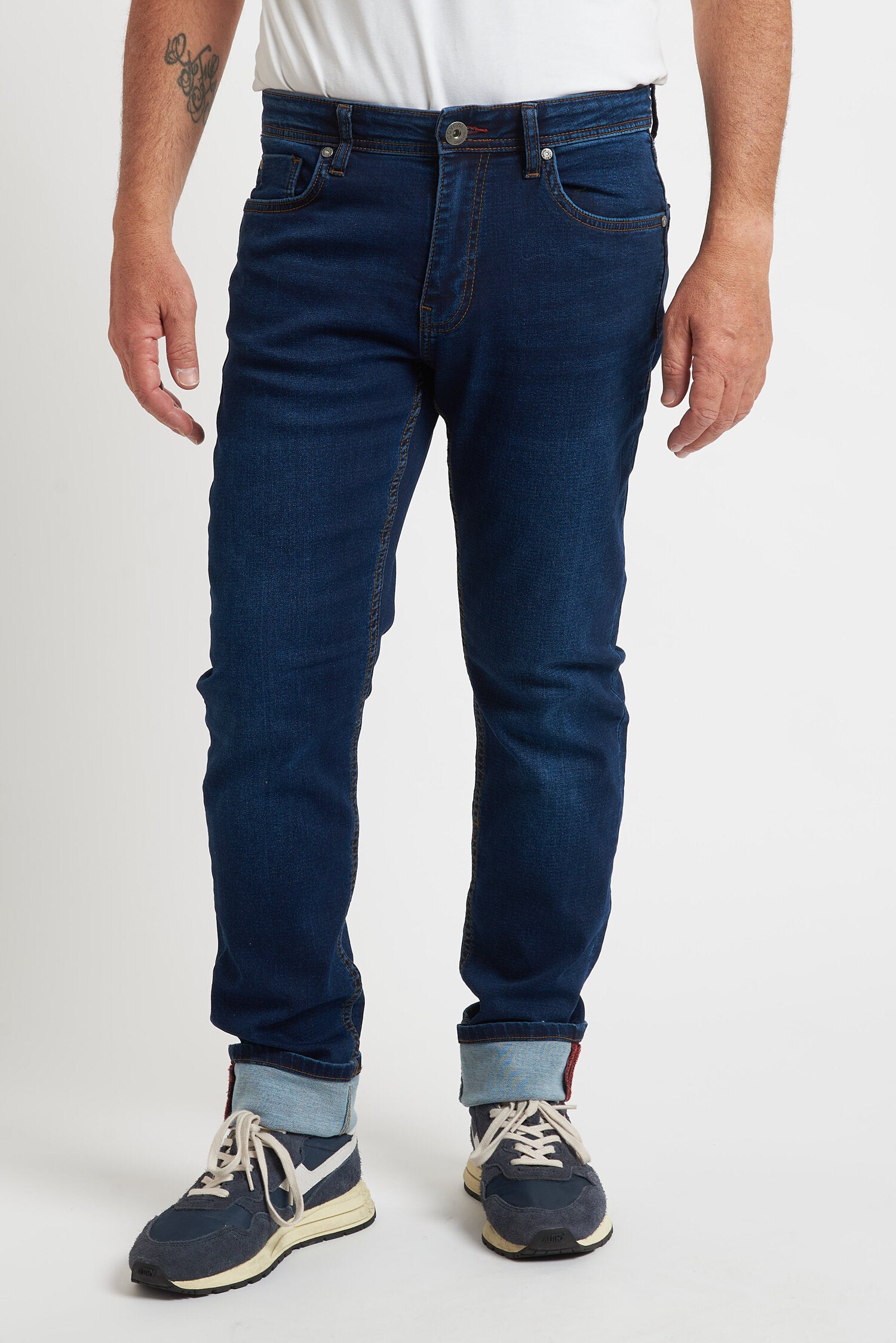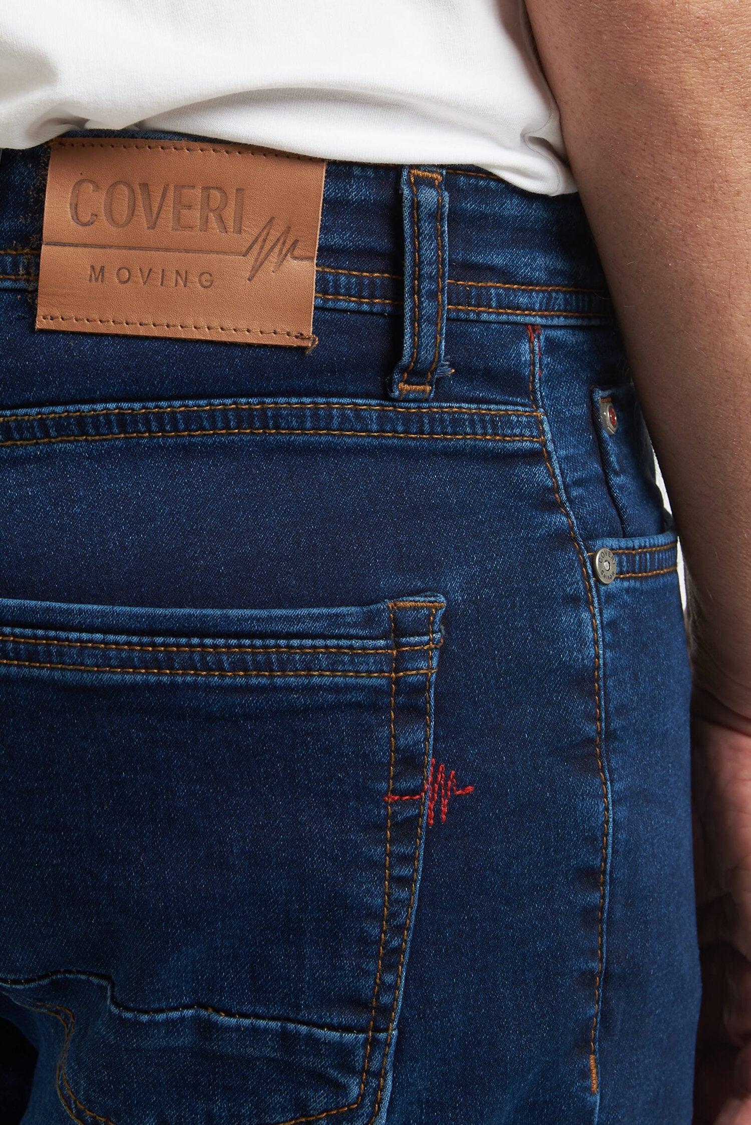 Jeans Coveri Moving, realizzato in denim ed elastan per garantire un fit comodo e con garzatura in felpa all'interno per conferirgi un piacevole effetto calore. Classico modello cinque tasche, con cuciture a contrasto. Disponibile in lavaggio dark blue con leggera sabbiatura presente sulla parte frontale delle cosce. Altezza vita normale. La vestibilità è regolare. Composizione: 87% cotone - 11% poliestere - 2% elastan
