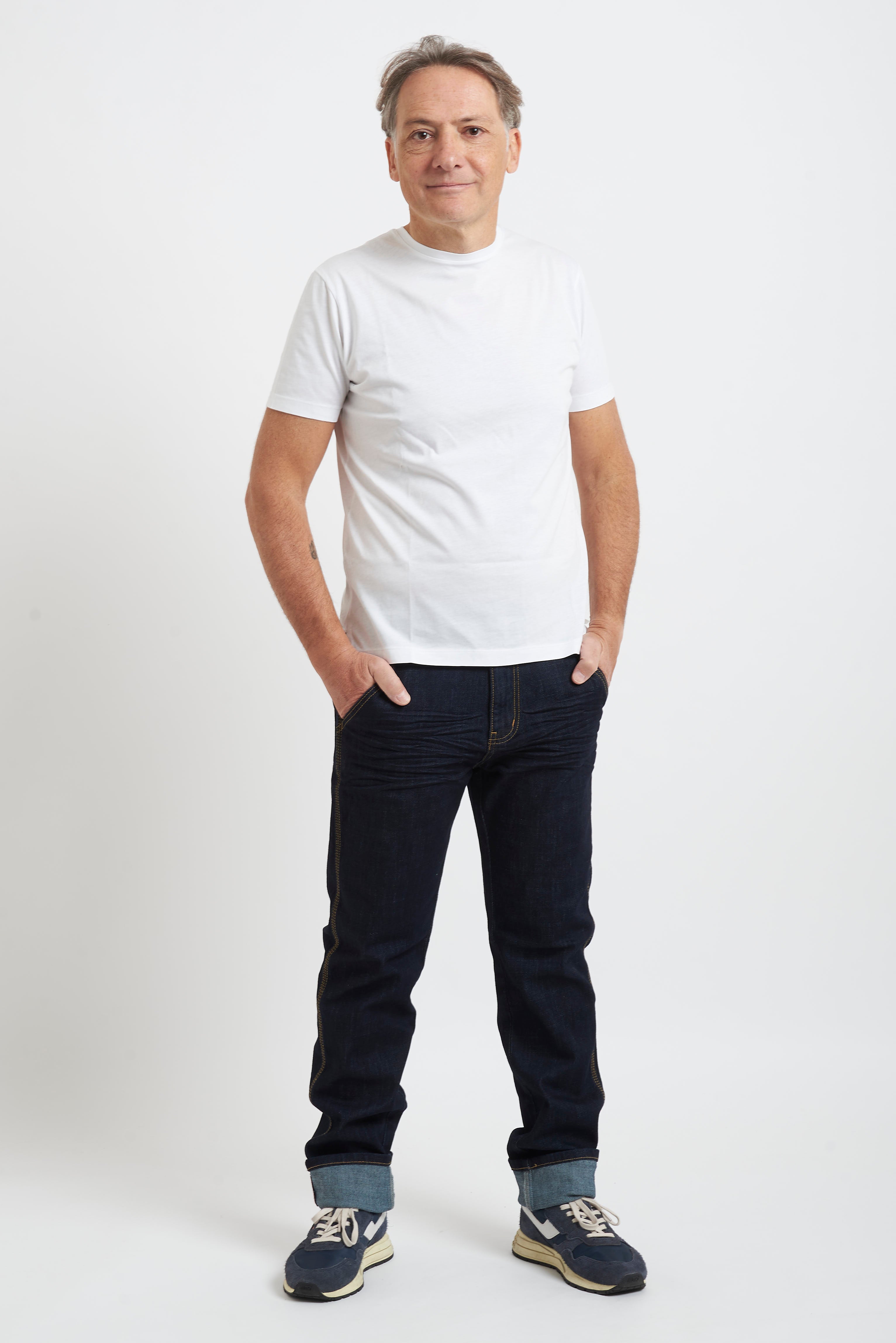 Jeans RIFLE, realizzato in denim ed elastan per garantire un fit comodo. Modello tasca america, con cuciture in contrasto. Disponibile in lavaggio zero, non trattato, colore dark blue e baffatura a rilievo sulle tasche anteriori. I dettagli che contraddistinguono questo modello lo arricchiscono di un'eleganza senza eguali. Altezza vita normale. La vestibilità è asciutta. Composizione: 73% cotone - 26% poliestere - 1% elastan