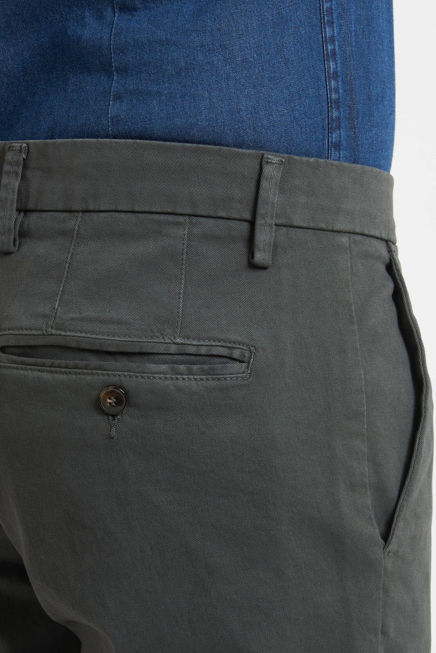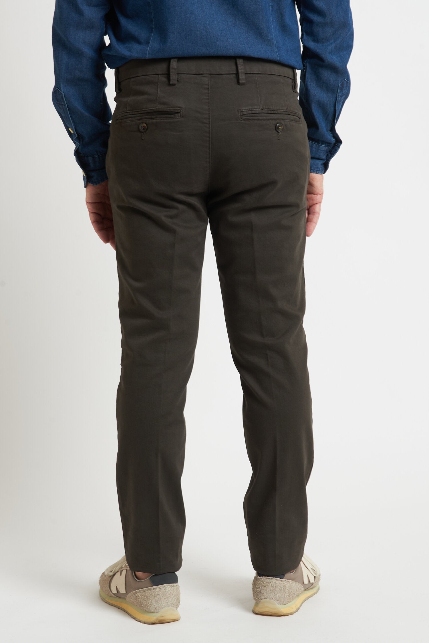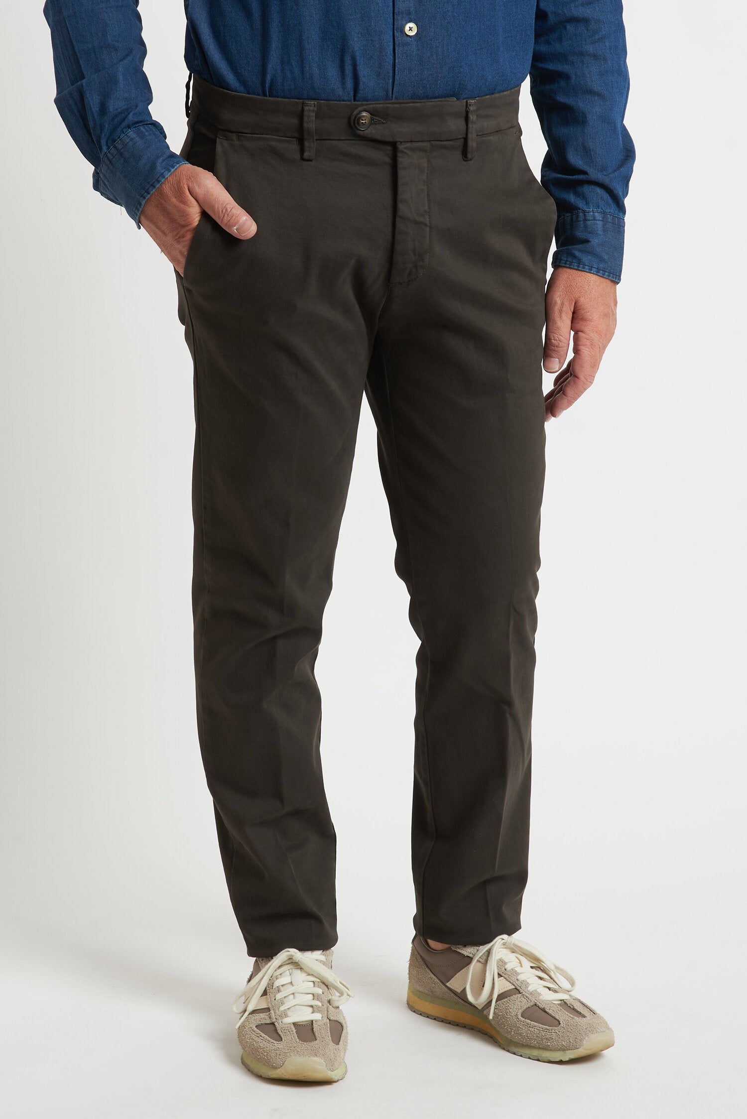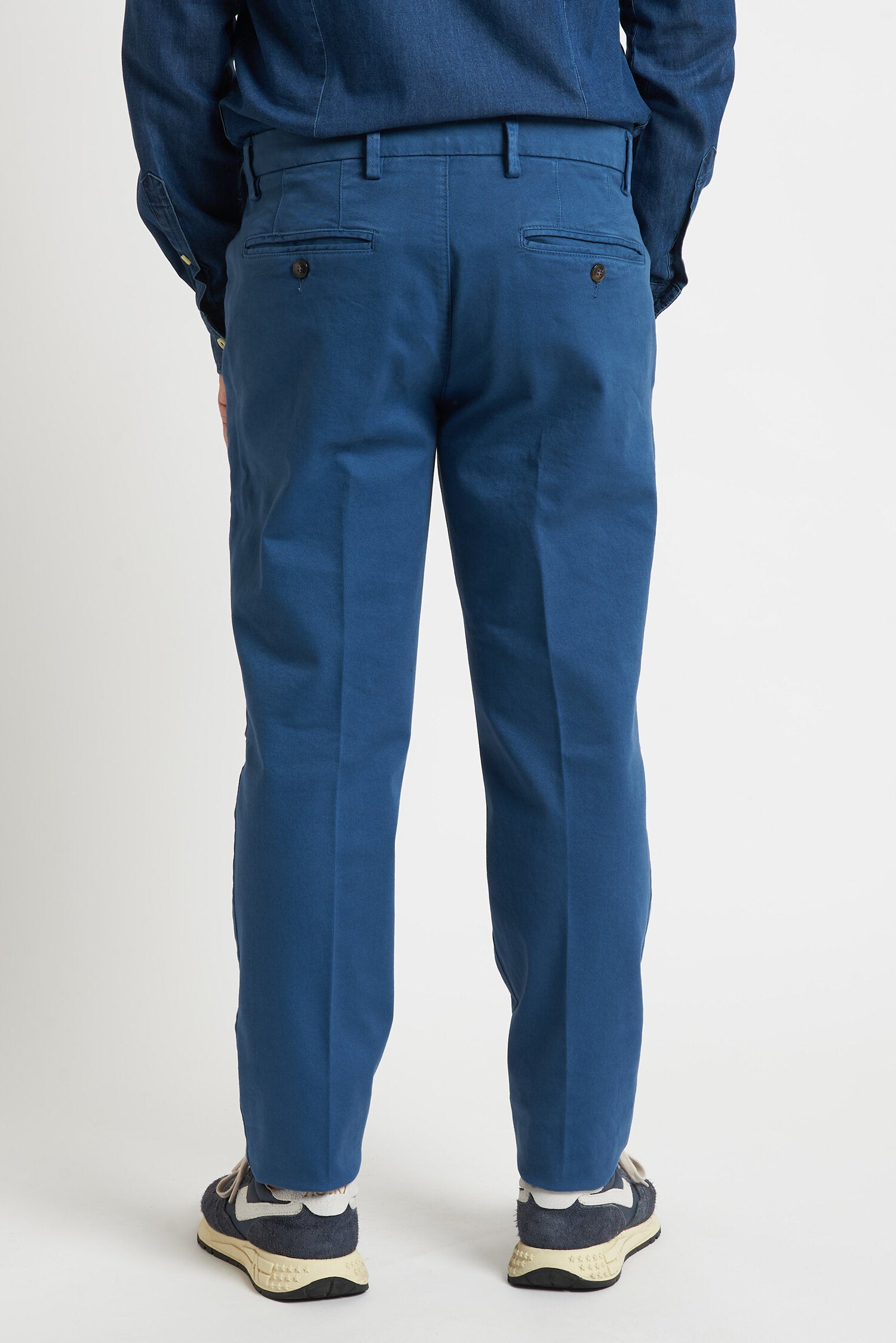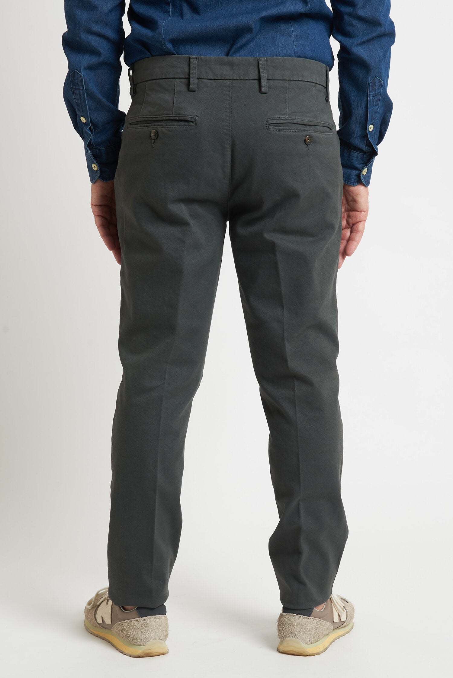 Pantaloni tinti in capo, realizzati in gabardine invernale. Hanno un fit comodo perchè composti da cotone e una piccola percentuale di elastan. Ai lati realizzati con tasca all'americana e dietro con tasca con profilo a soffietto e bottone. La vestibilità è semi slim. Composizione:98% cotone - 2% elastan.