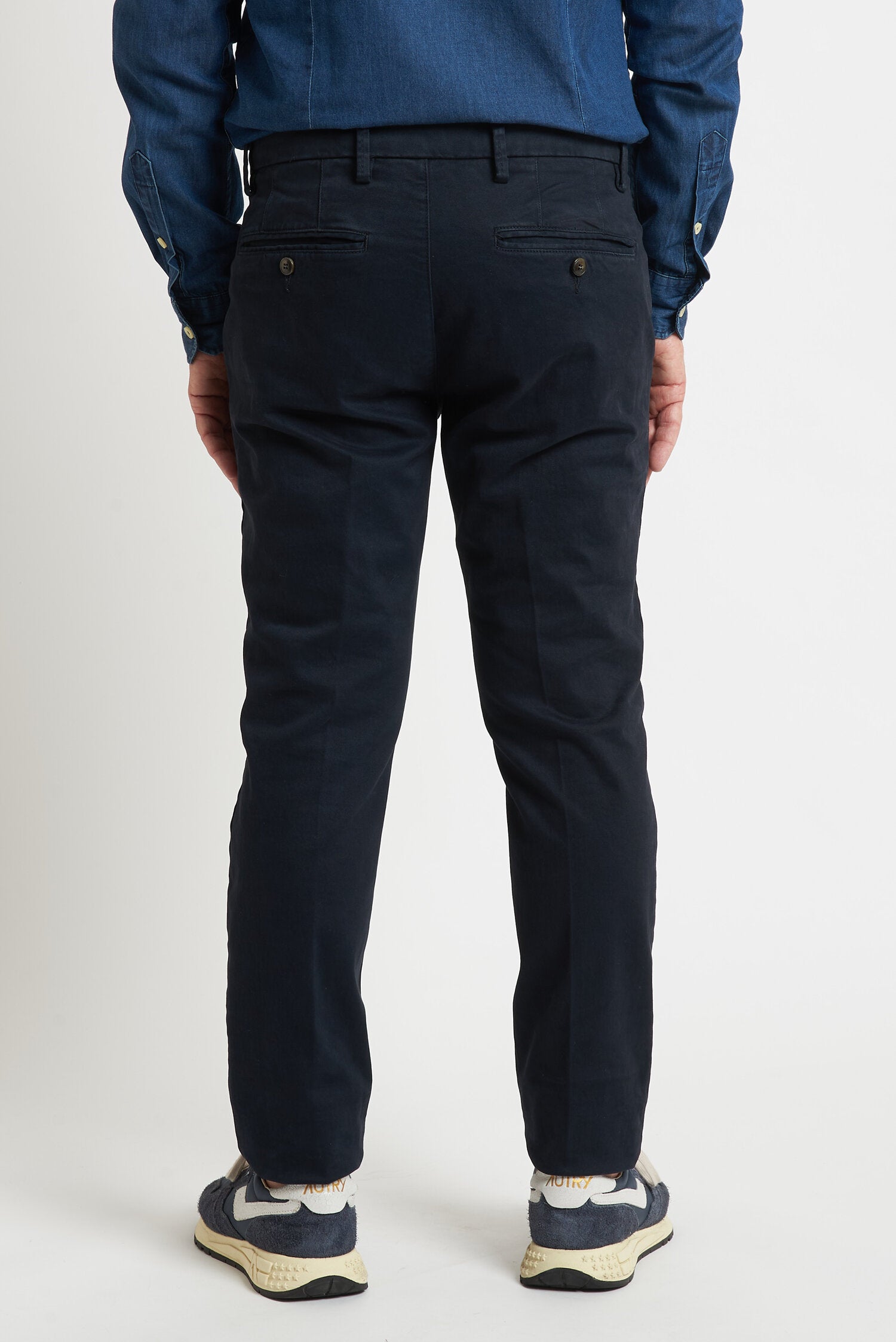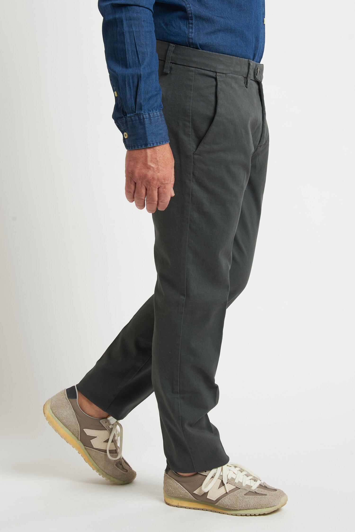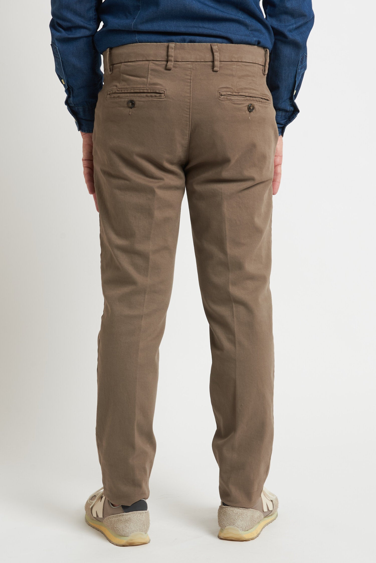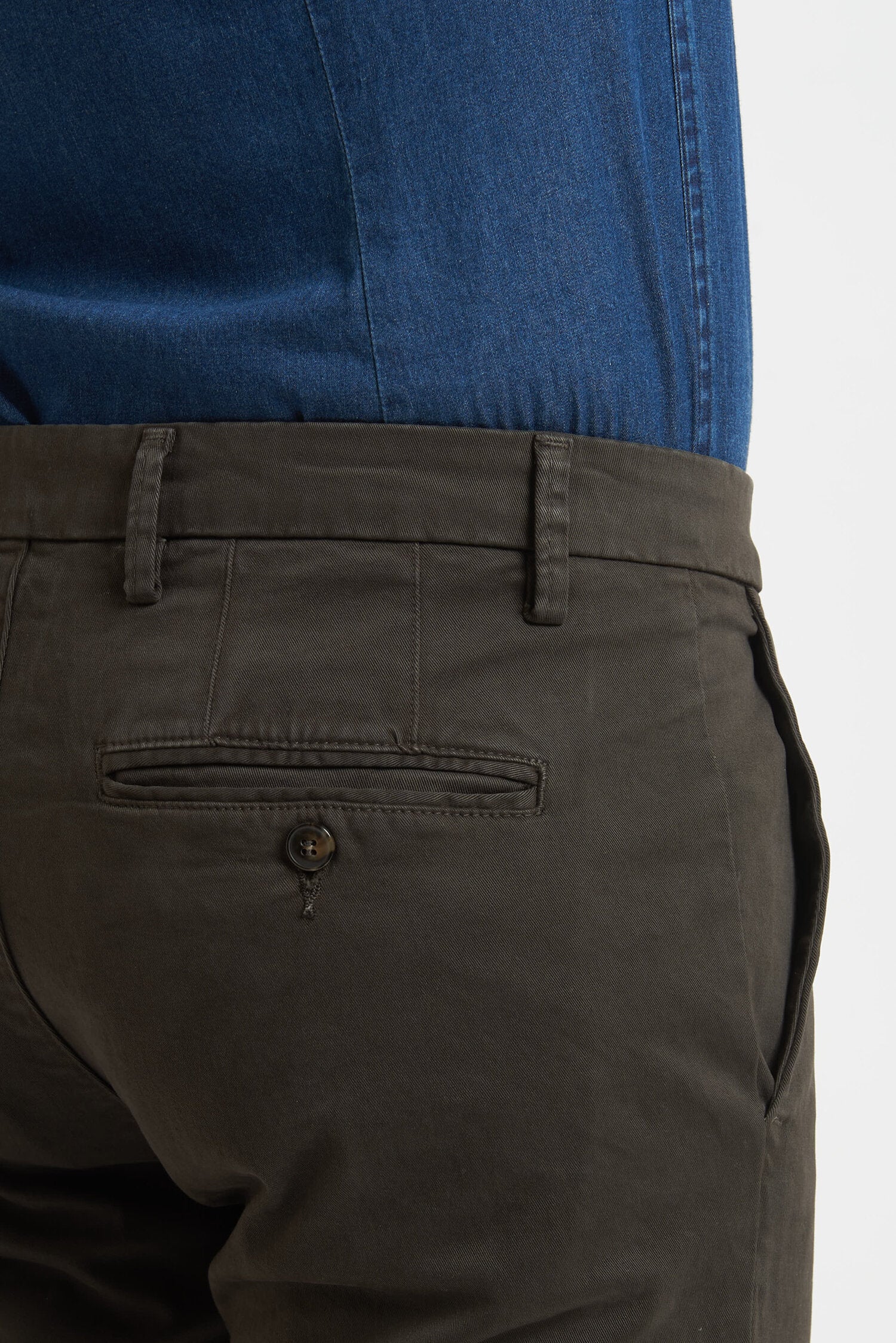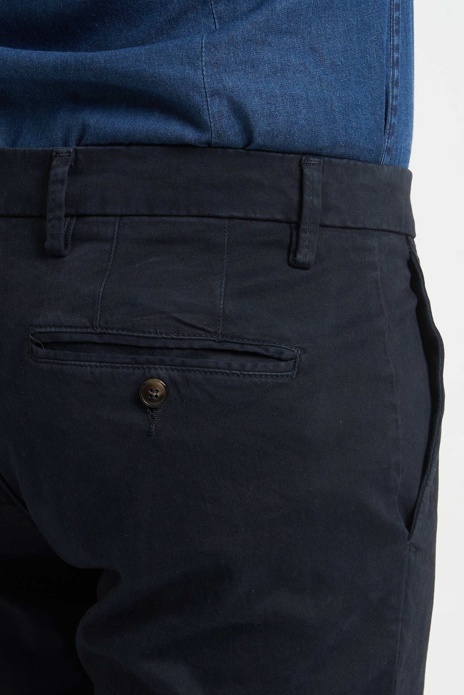 Pantaloni tinti in capo, realizzati in gabardine invernale. Hanno un fit comodo perchè composti da cotone e una piccola percentuale di elastan. Ai lati realizzati con tasca all'americana e dietro con tasca con profilo a soffietto e bottone. La vestibilità è semi slim. Composizione:98% cotone - 2% elastan.