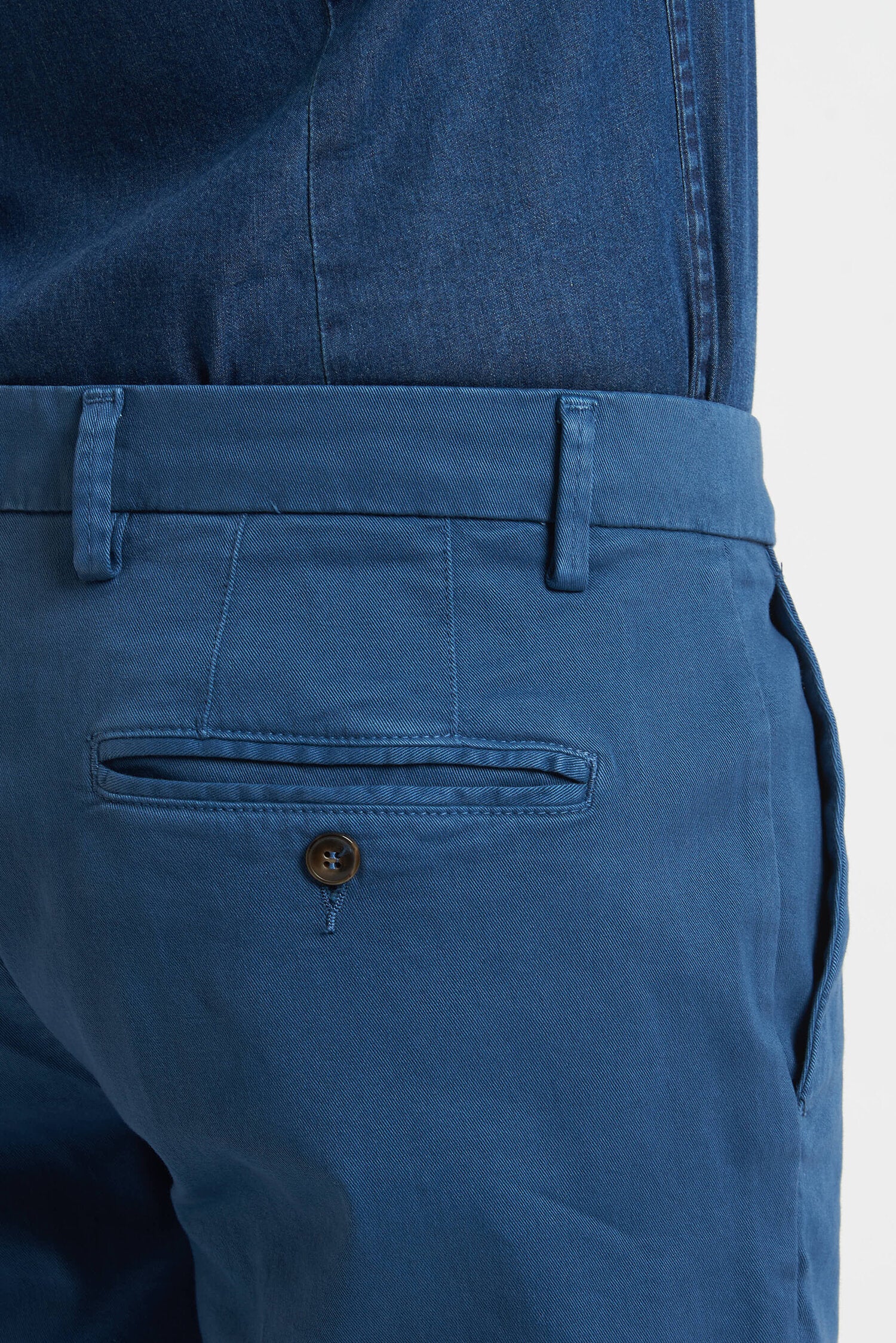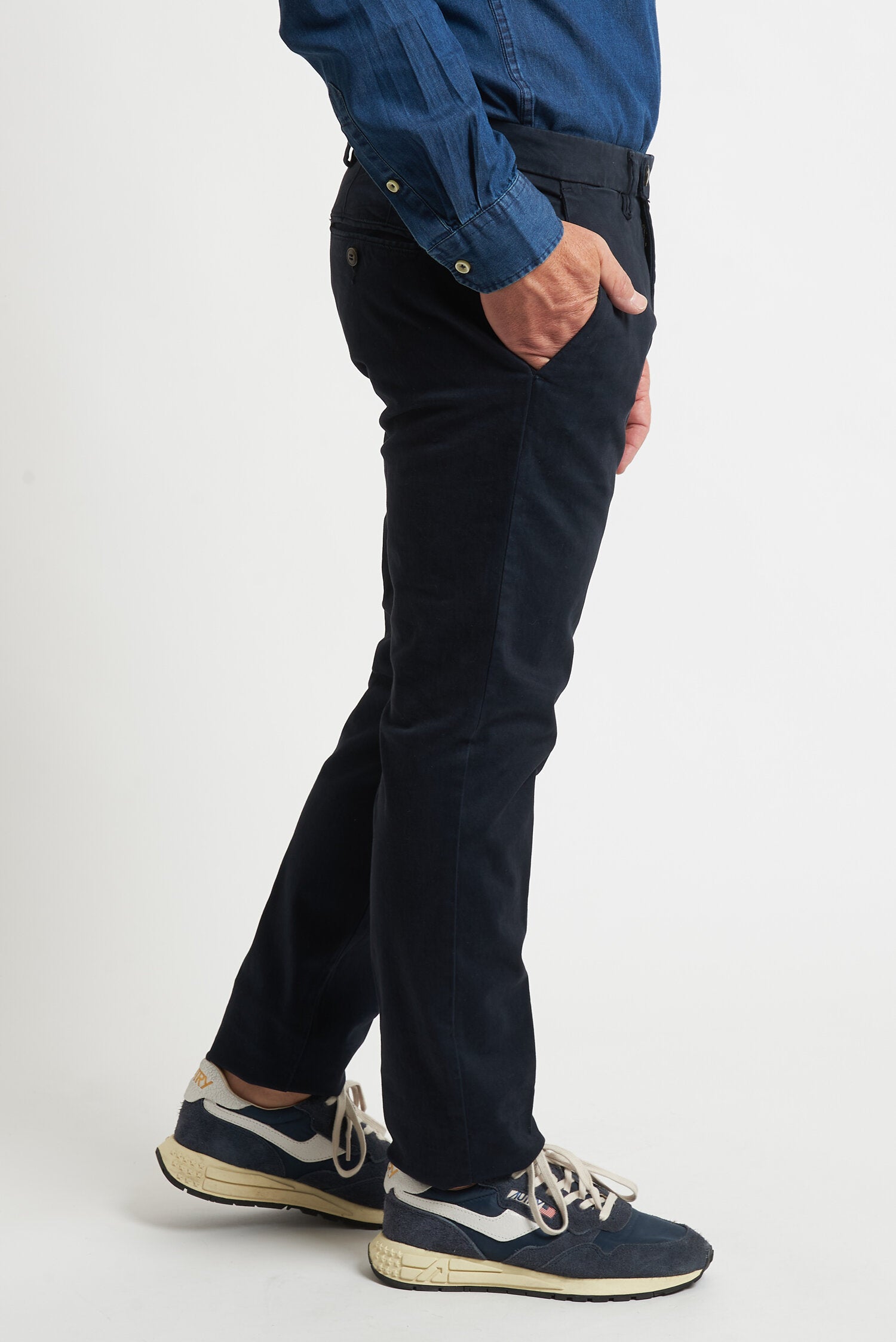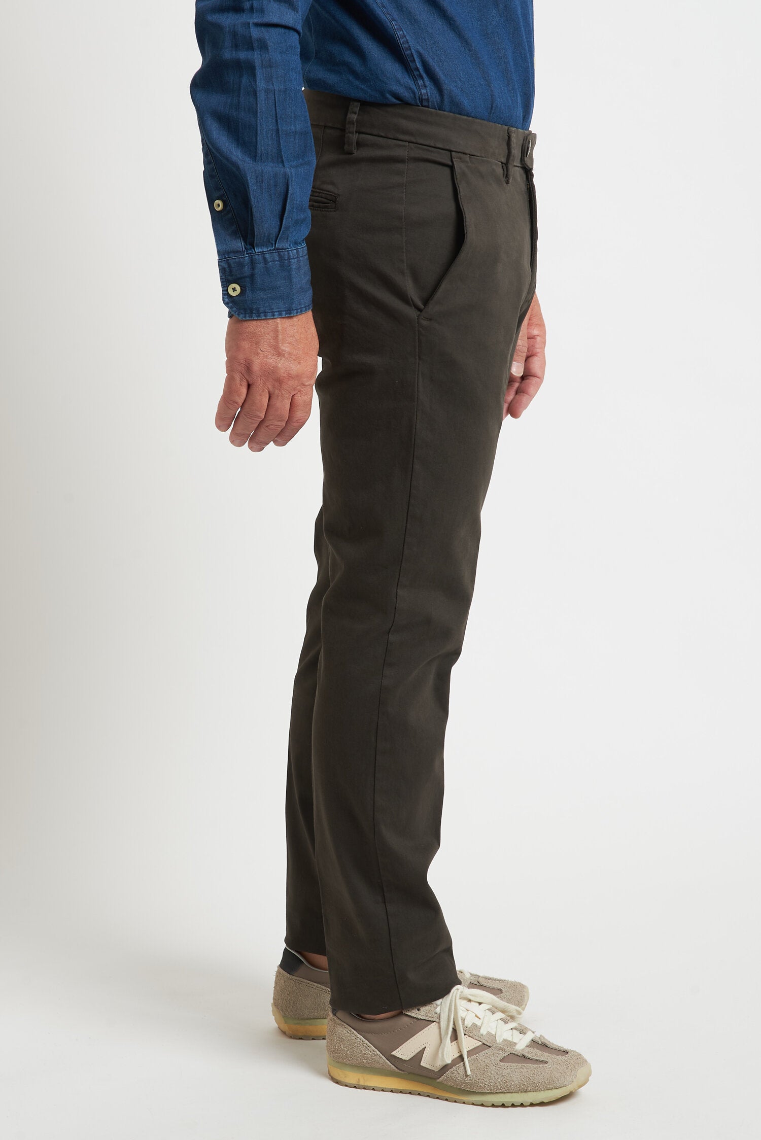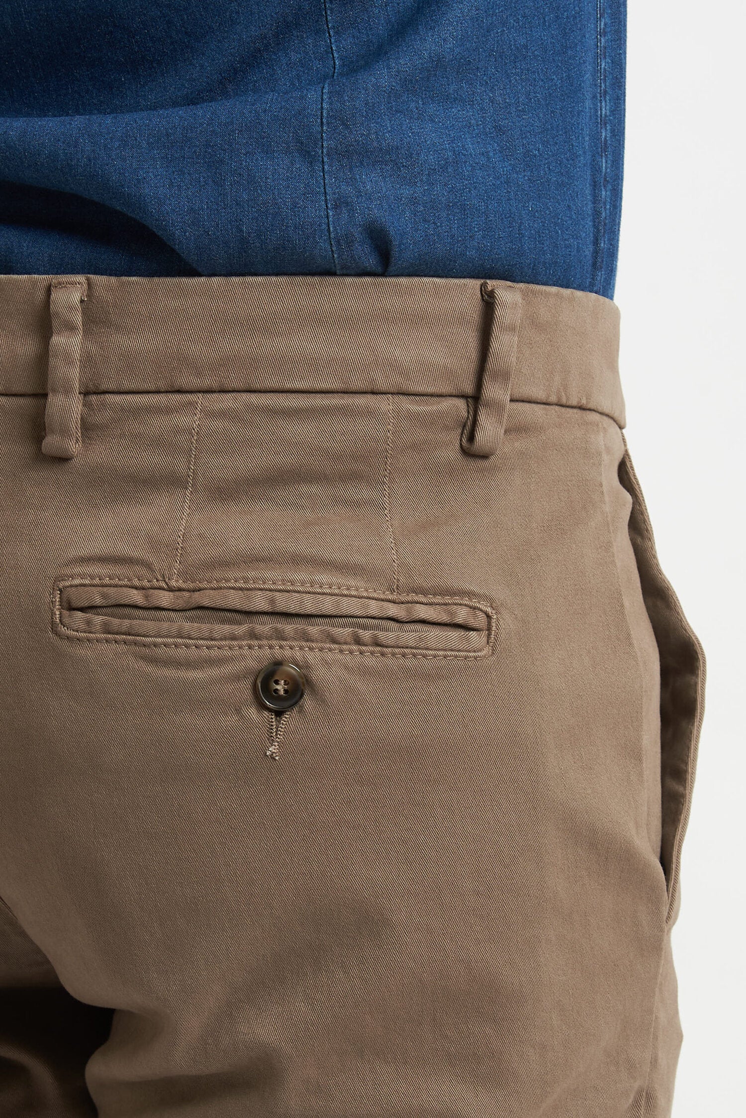Pantaloni tinti in capo, realizzati in gabardine invernale. Hanno un fit comodo perchè composti da cotone e una piccola percentuale di elastan. Ai lati realizzati con tasca all'americana e dietro con tasca con profilo a soffietto e bottone. La vestibilità è semi slim. Composizione:98% cotone - 2% elastan.