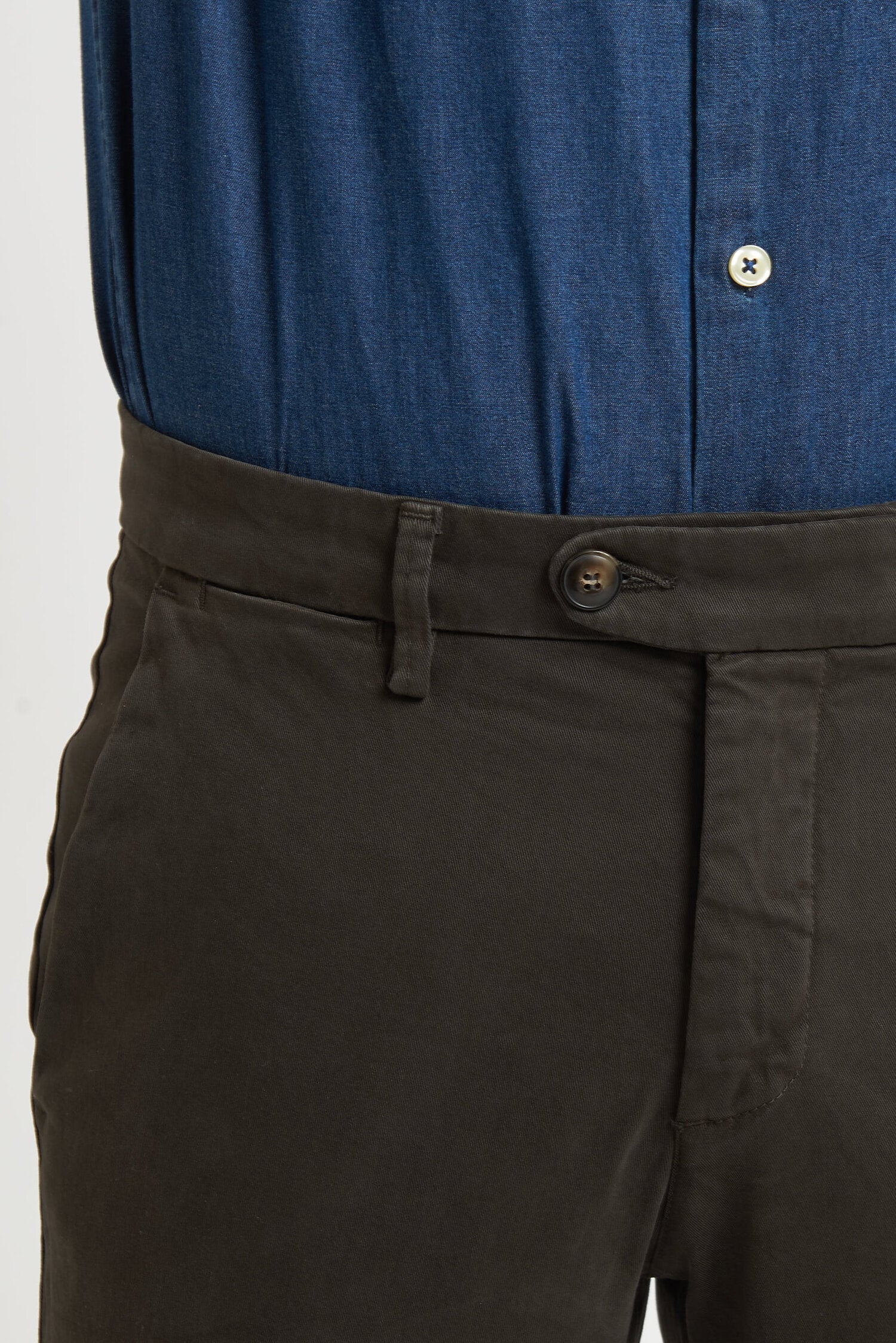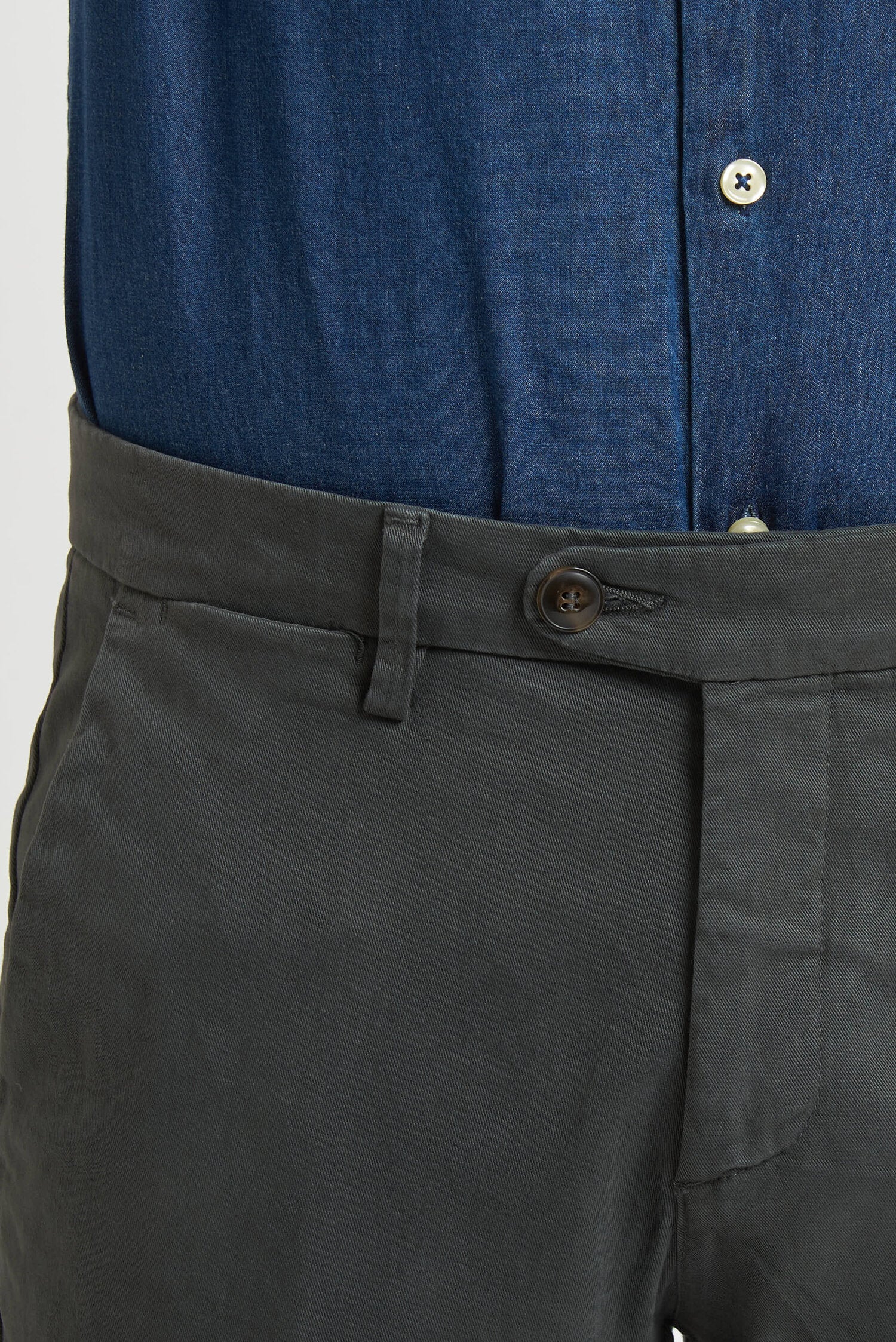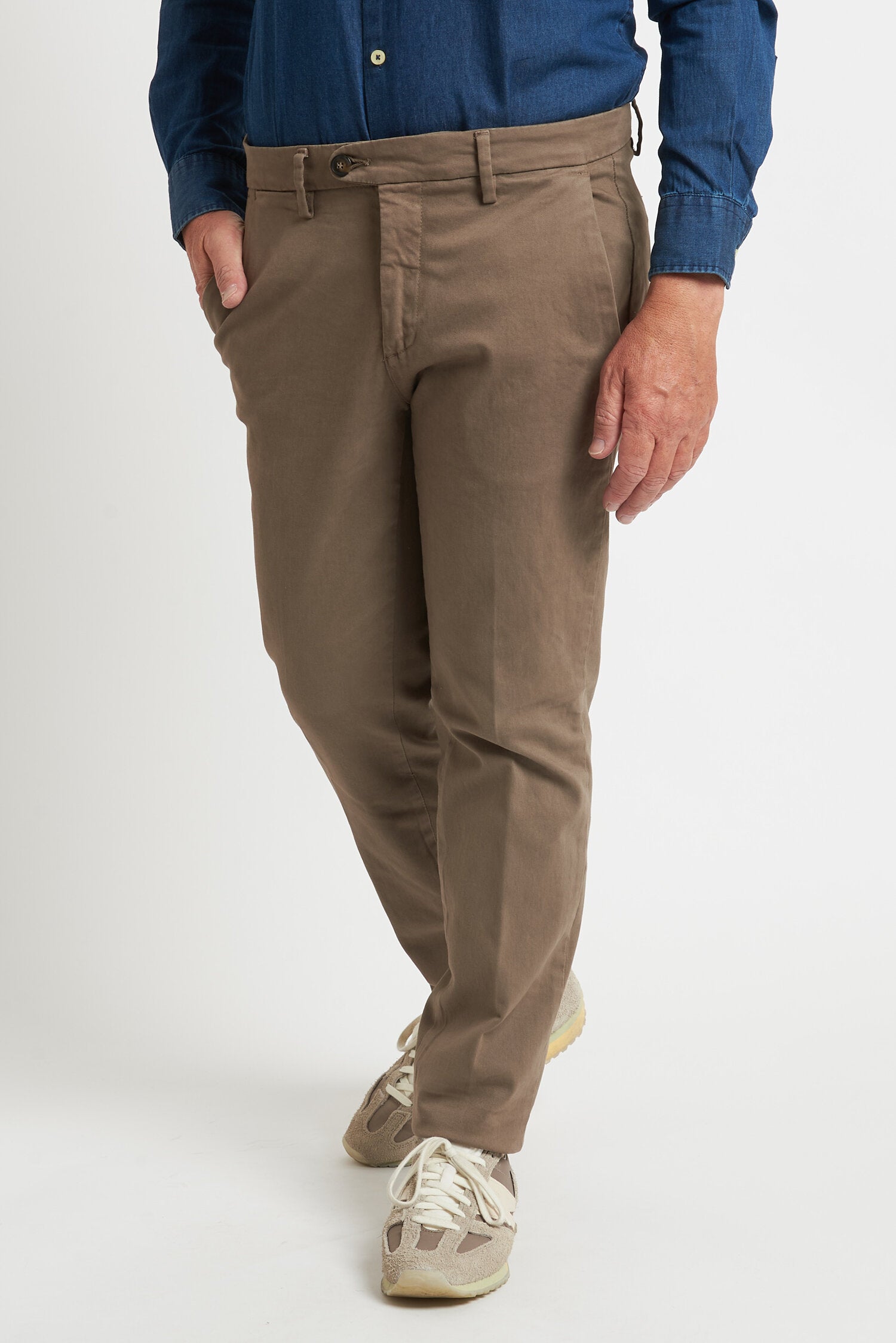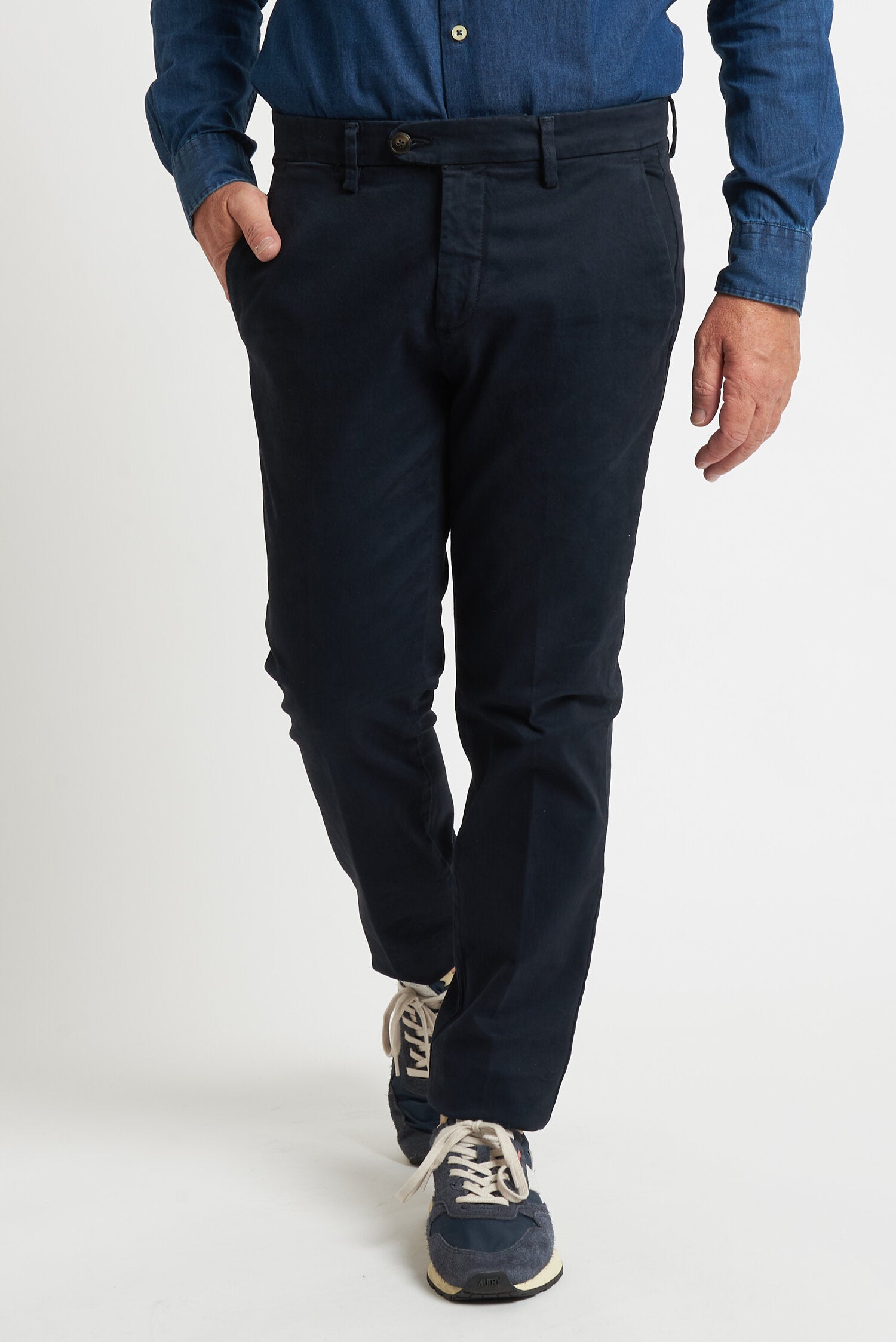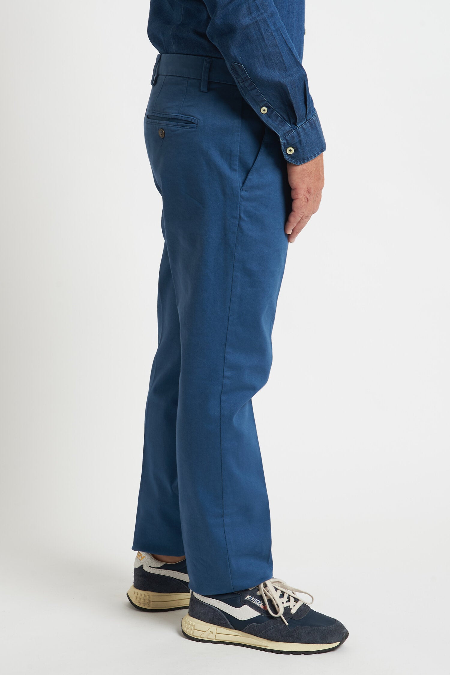 Pantaloni tinti in capo, realizzati in gabardine invernale. Hanno un fit comodo perchè composti da cotone e una piccola percentuale di elastan. Ai lati realizzati con tasca all'americana e dietro con tasca con profilo a soffietto e bottone. La vestibilità è semi slim. Composizione:98% cotone - 2% elastan.