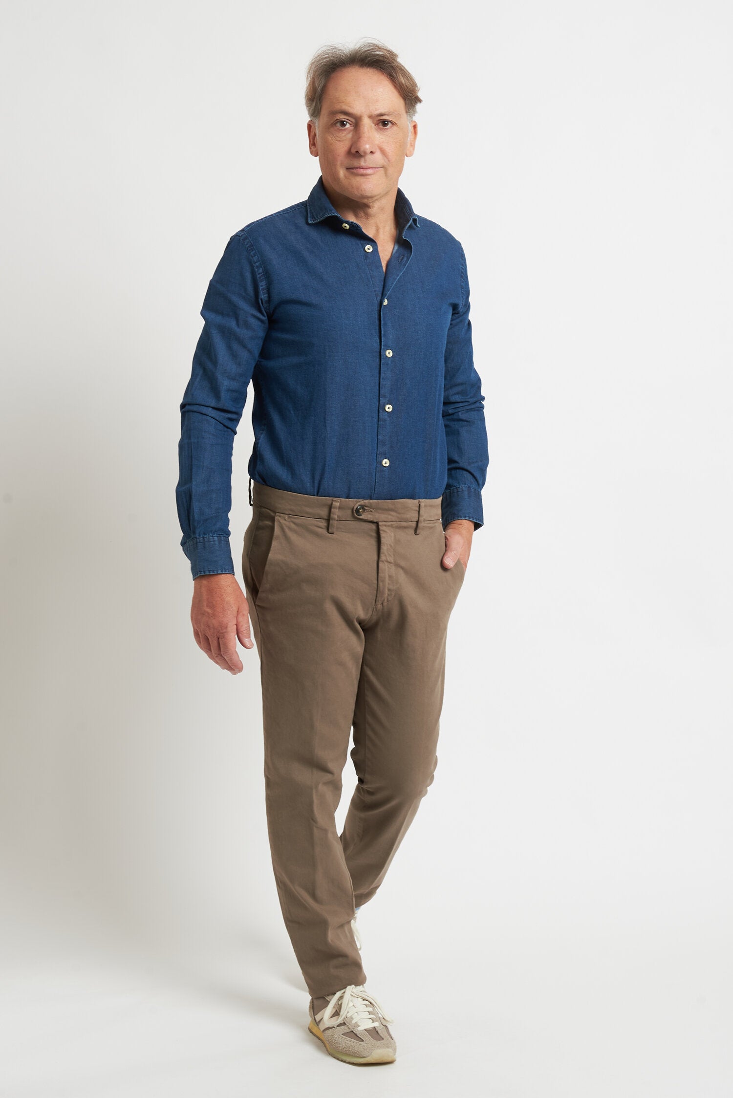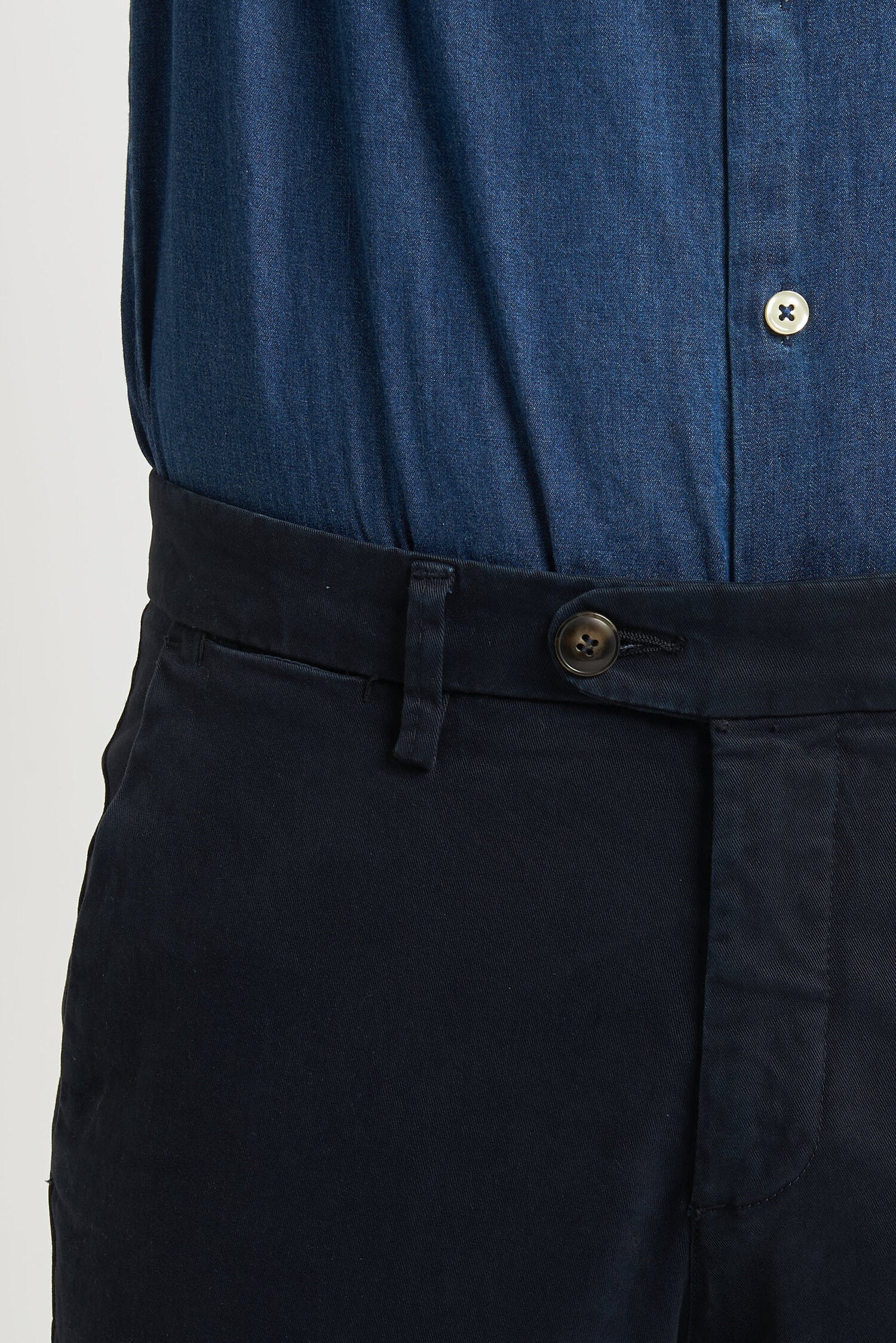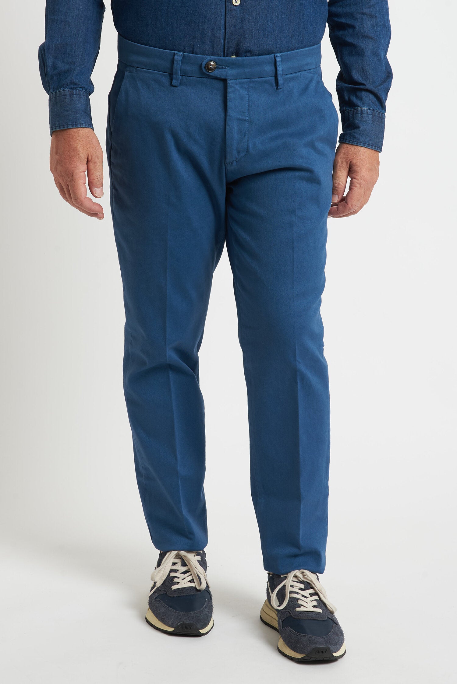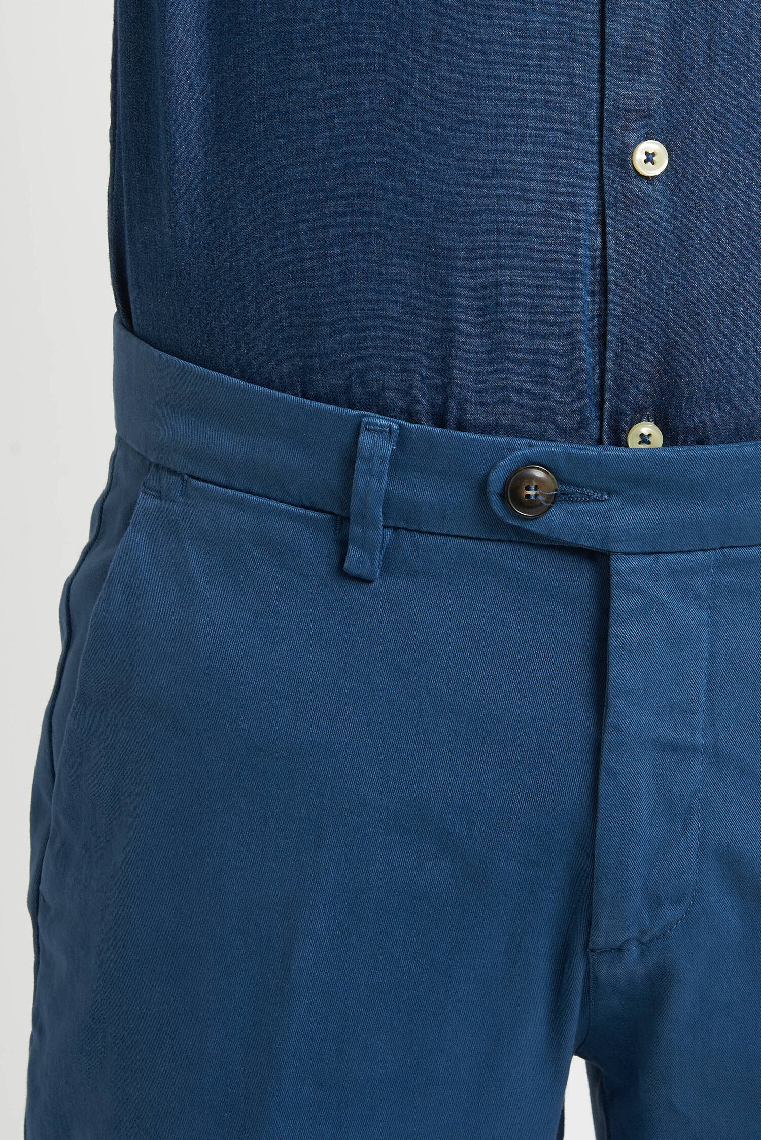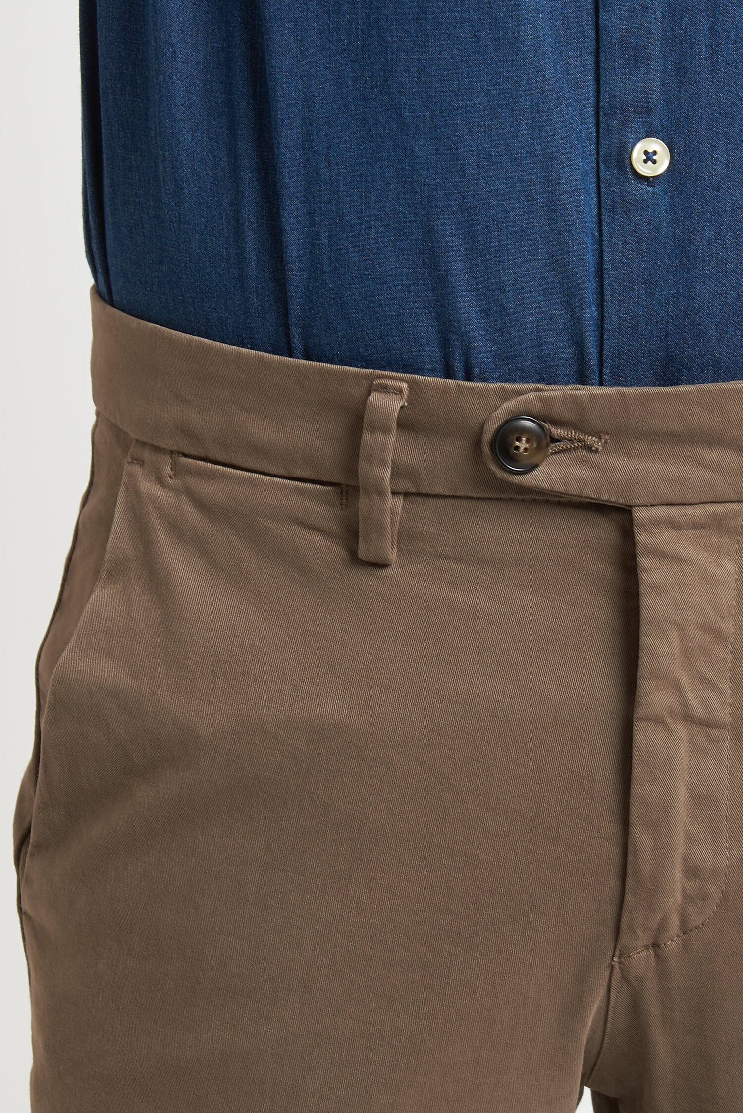 Pantaloni tinti in capo, realizzati in gabardine invernale. Hanno un fit comodo perchè composti da cotone e una piccola percentuale di elastan. Ai lati realizzati con tasca all'americana e dietro con tasca con profilo a soffietto e bottone. La vestibilità è semi slim. Composizione:98% cotone - 2% elastan.
