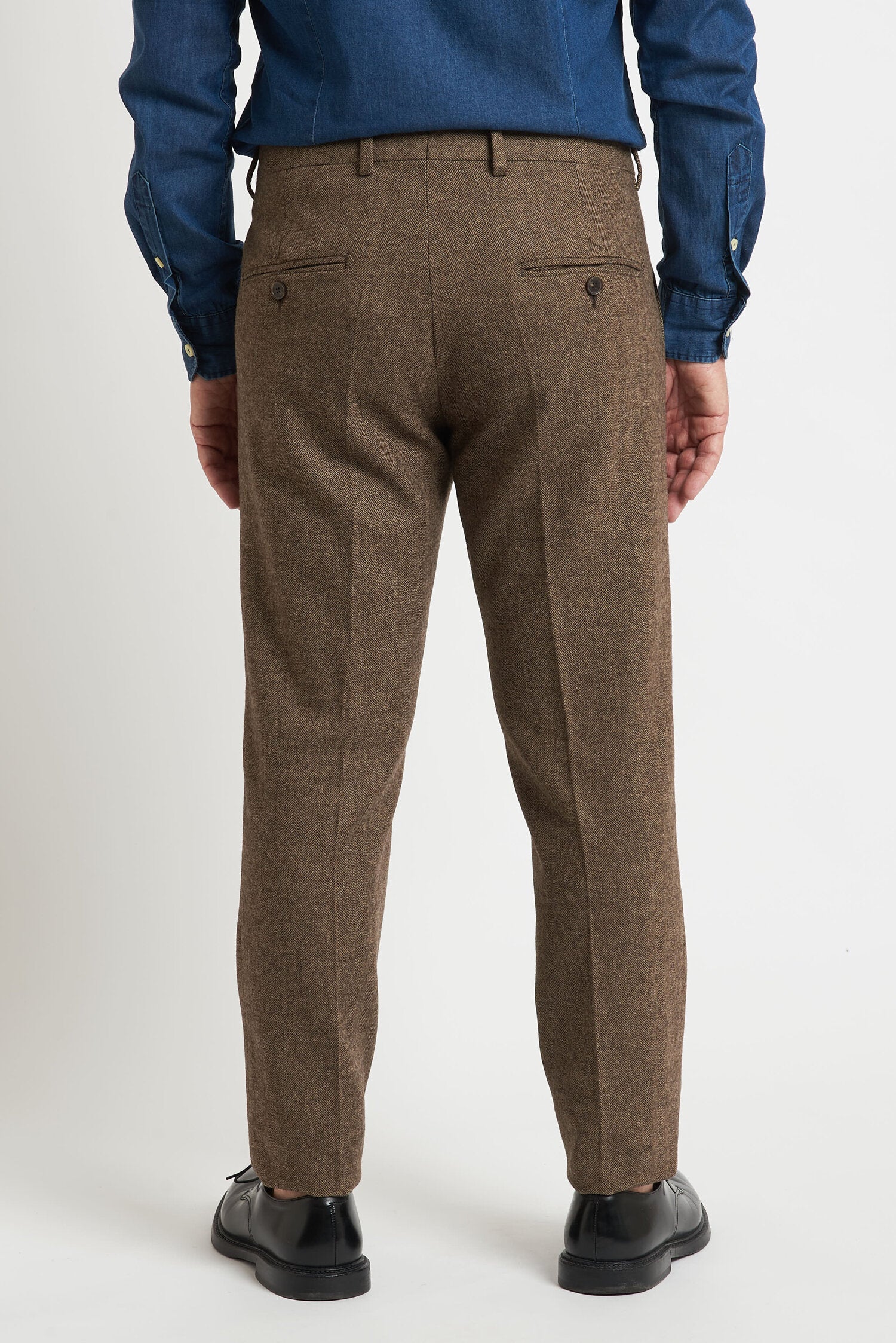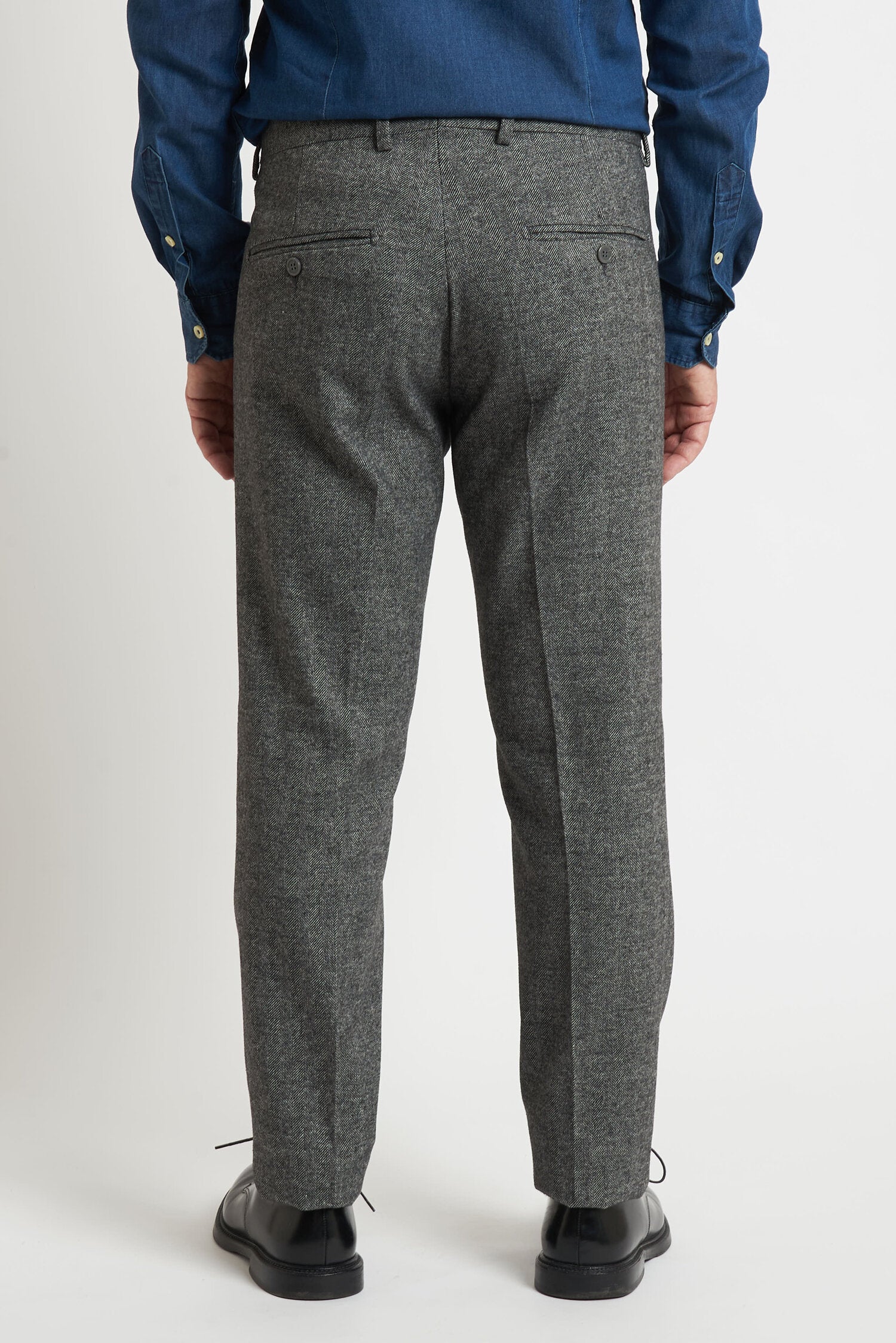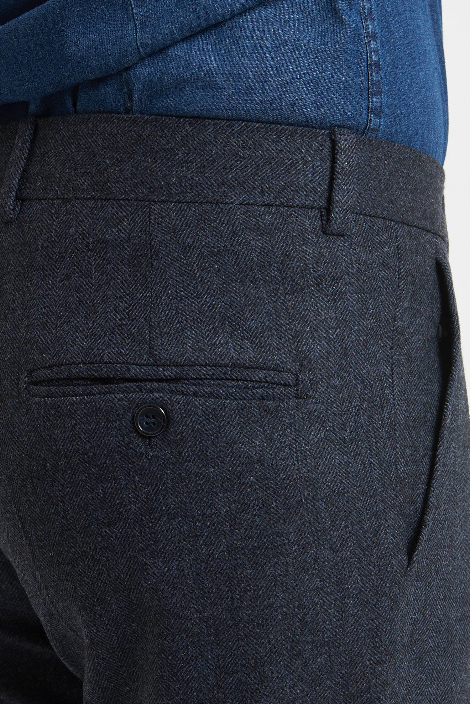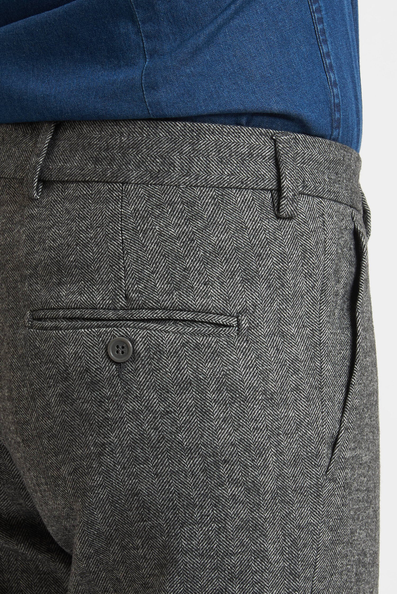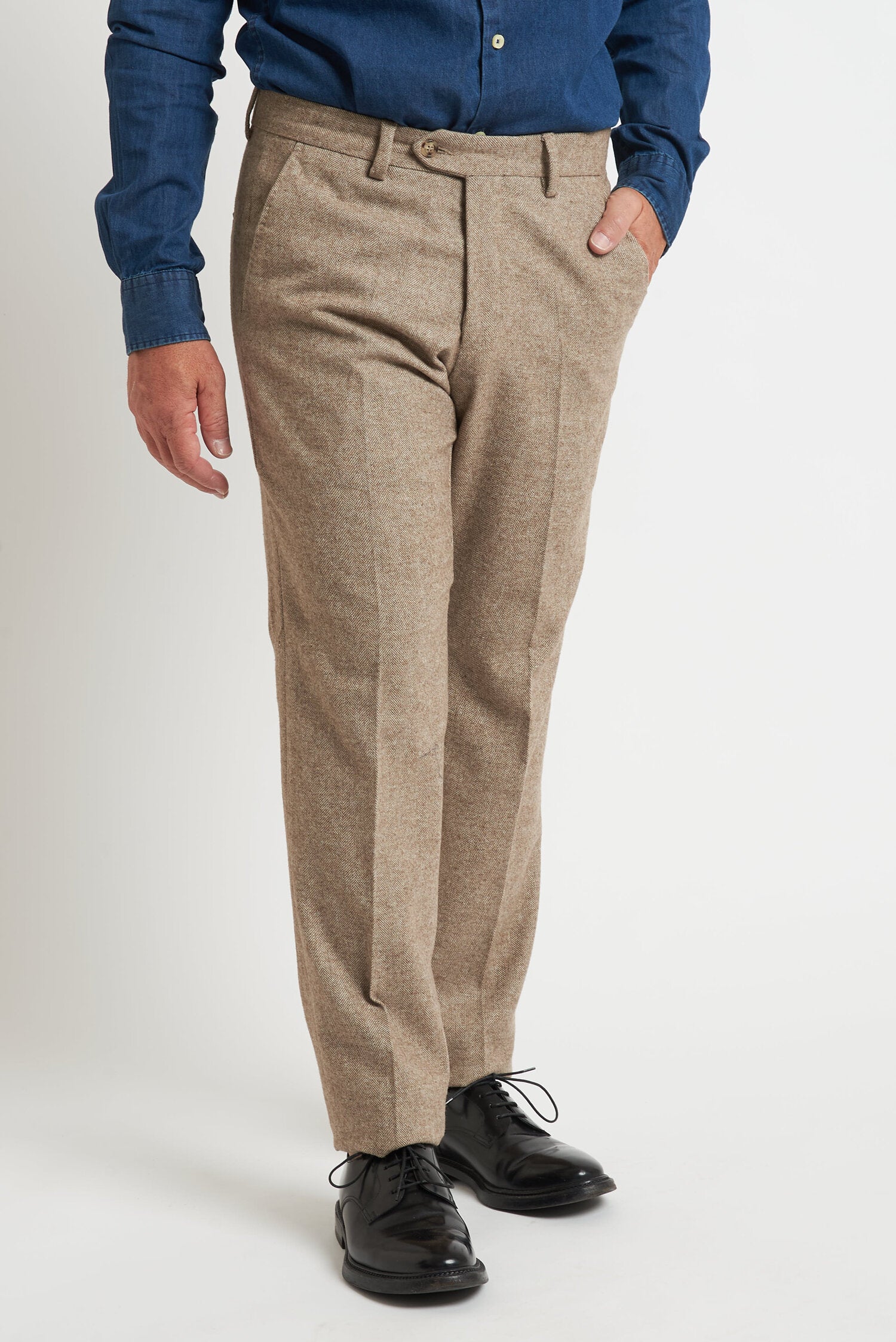 Pantaloni Consorti Milano modello chino in trama spigata, realizzati in pregiata lana. Hanno un fit comodo perchè il tessuto è composto anche da una piccola percentuale di elastan. Ai lati realizzati con tasca all'americana e dietro con tasca con profilo a soffietto e bottone. La vestibilità è asciutta. Composizione: lana - viscosa - elastan.
