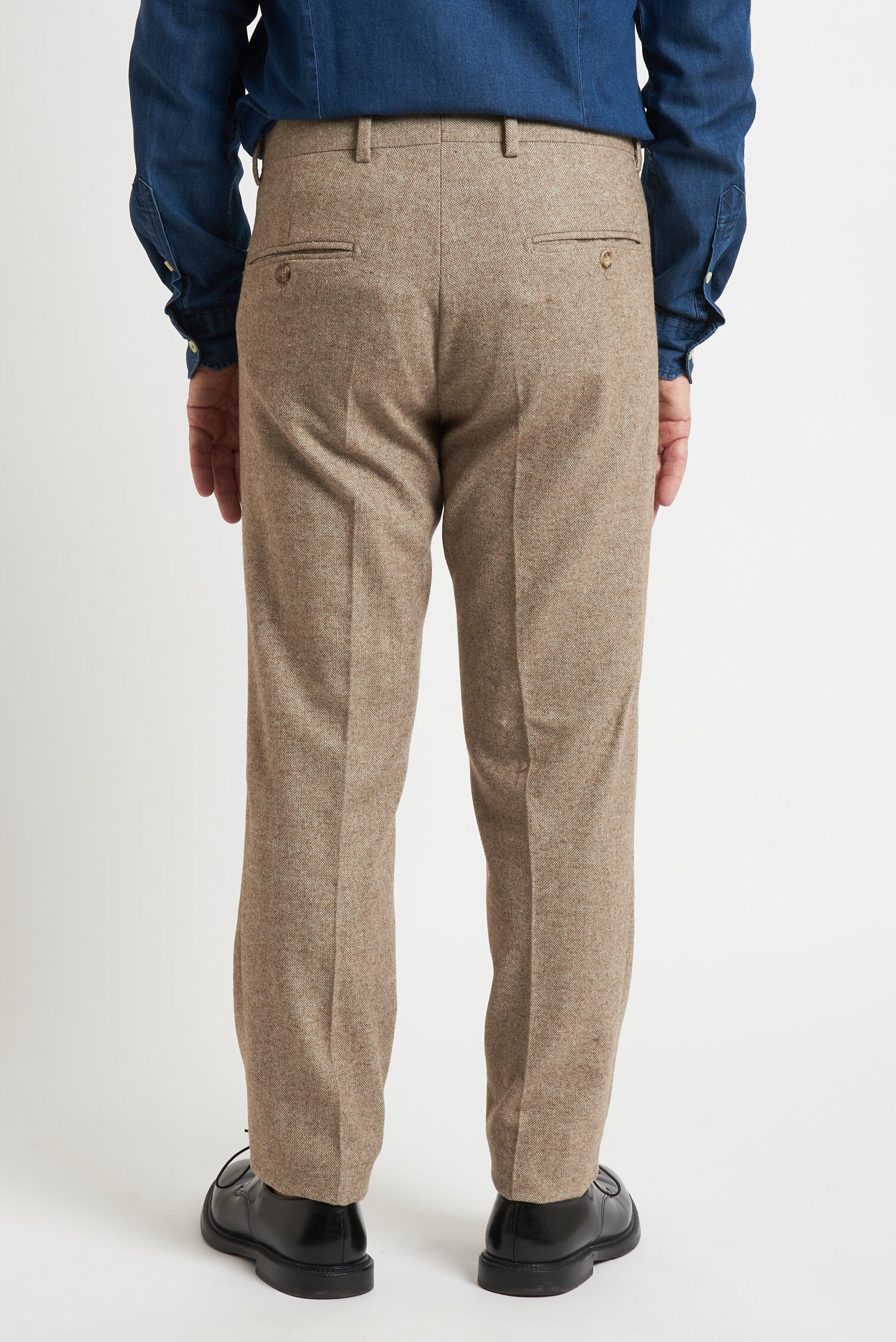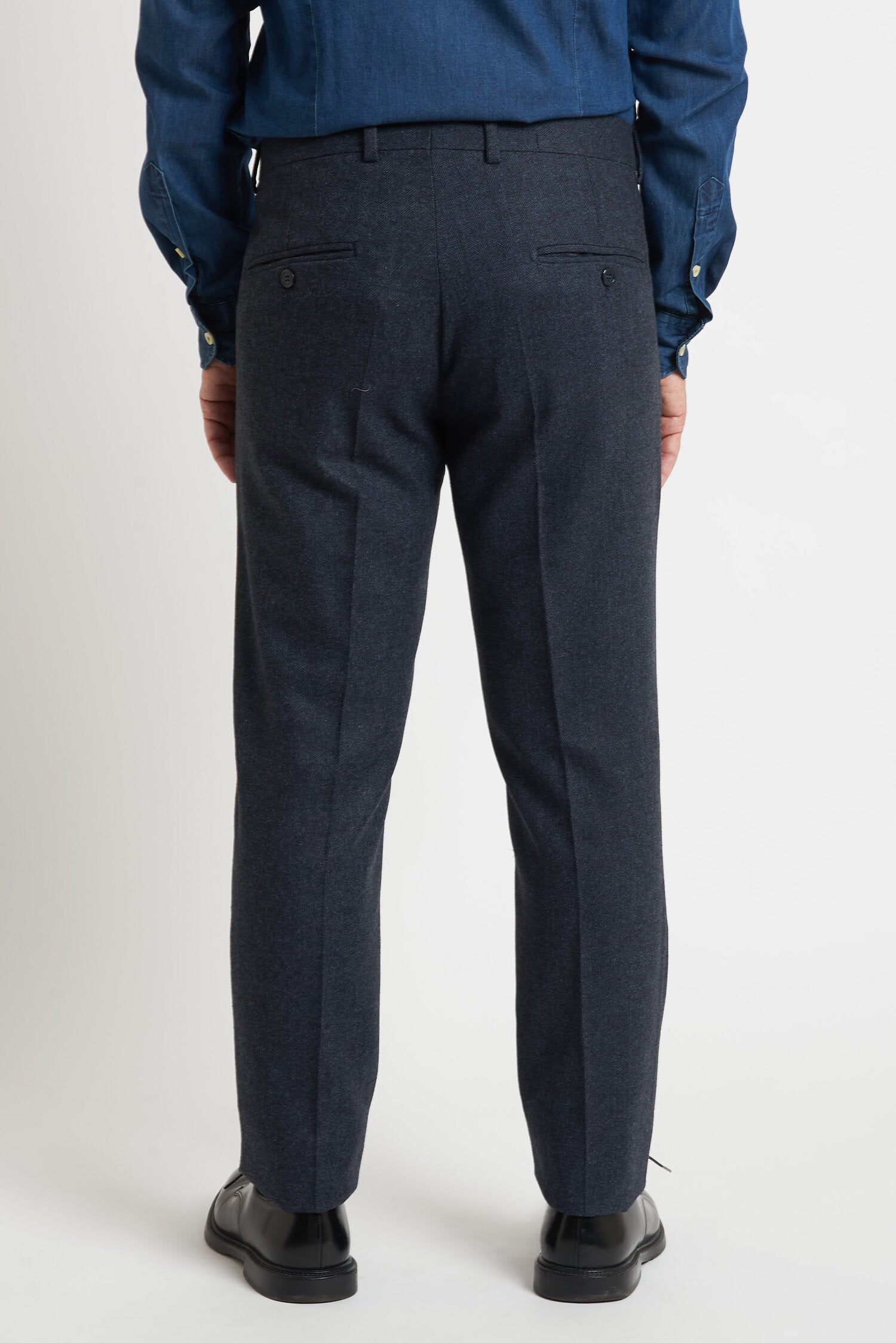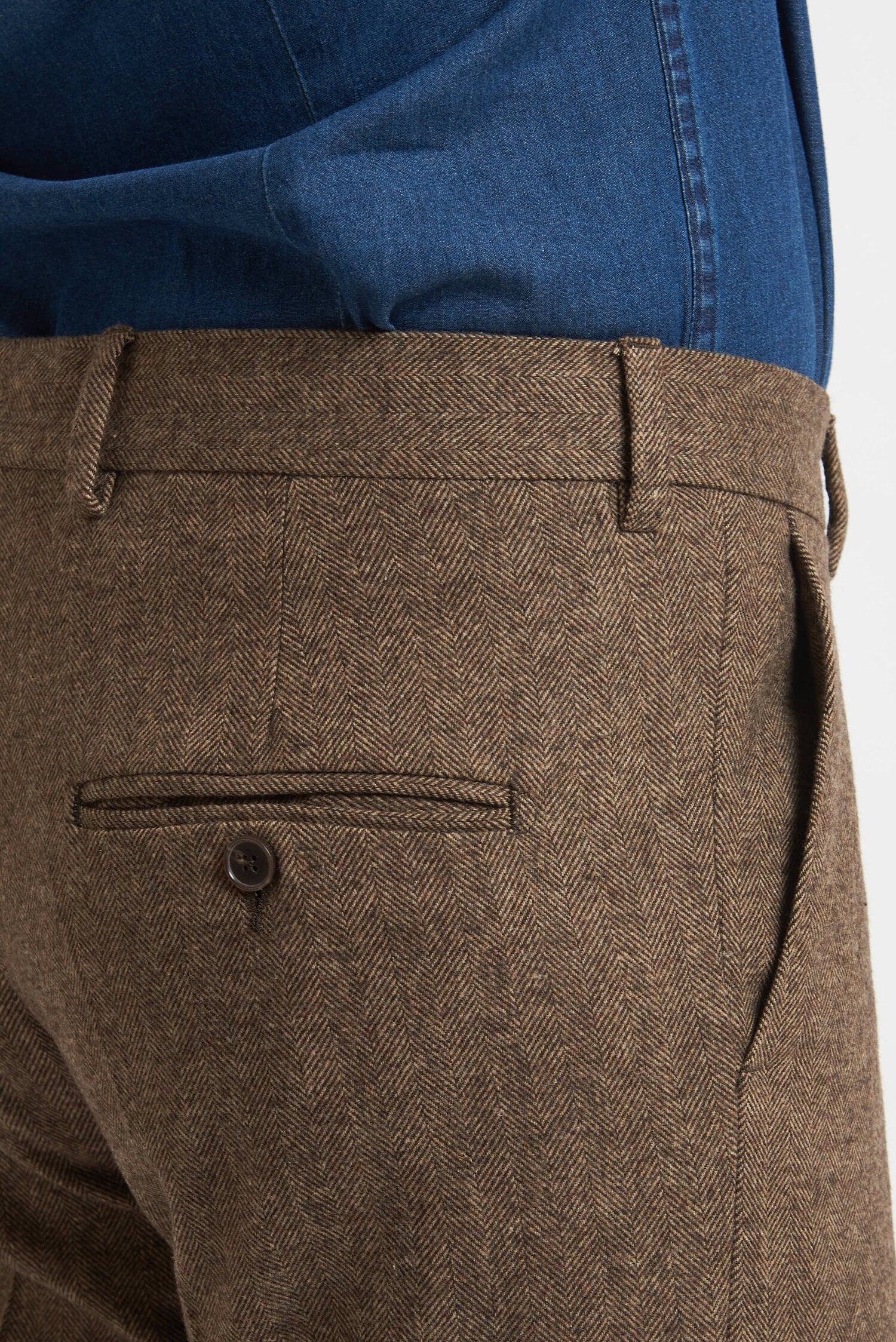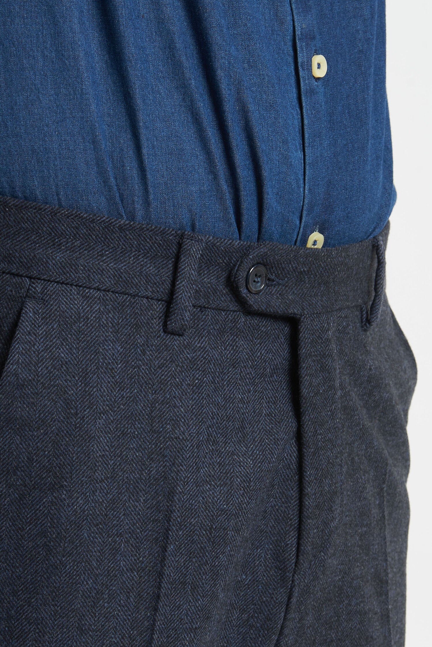 Pantaloni Consorti Milano modello chino in trama spigata, realizzati in pregiata lana. Hanno un fit comodo perchè il tessuto è composto anche da una piccola percentuale di elastan. Ai lati realizzati con tasca all'americana e dietro con tasca con profilo a soffietto e bottone. La vestibilità è asciutta. Composizione: lana - viscosa - elastan.
