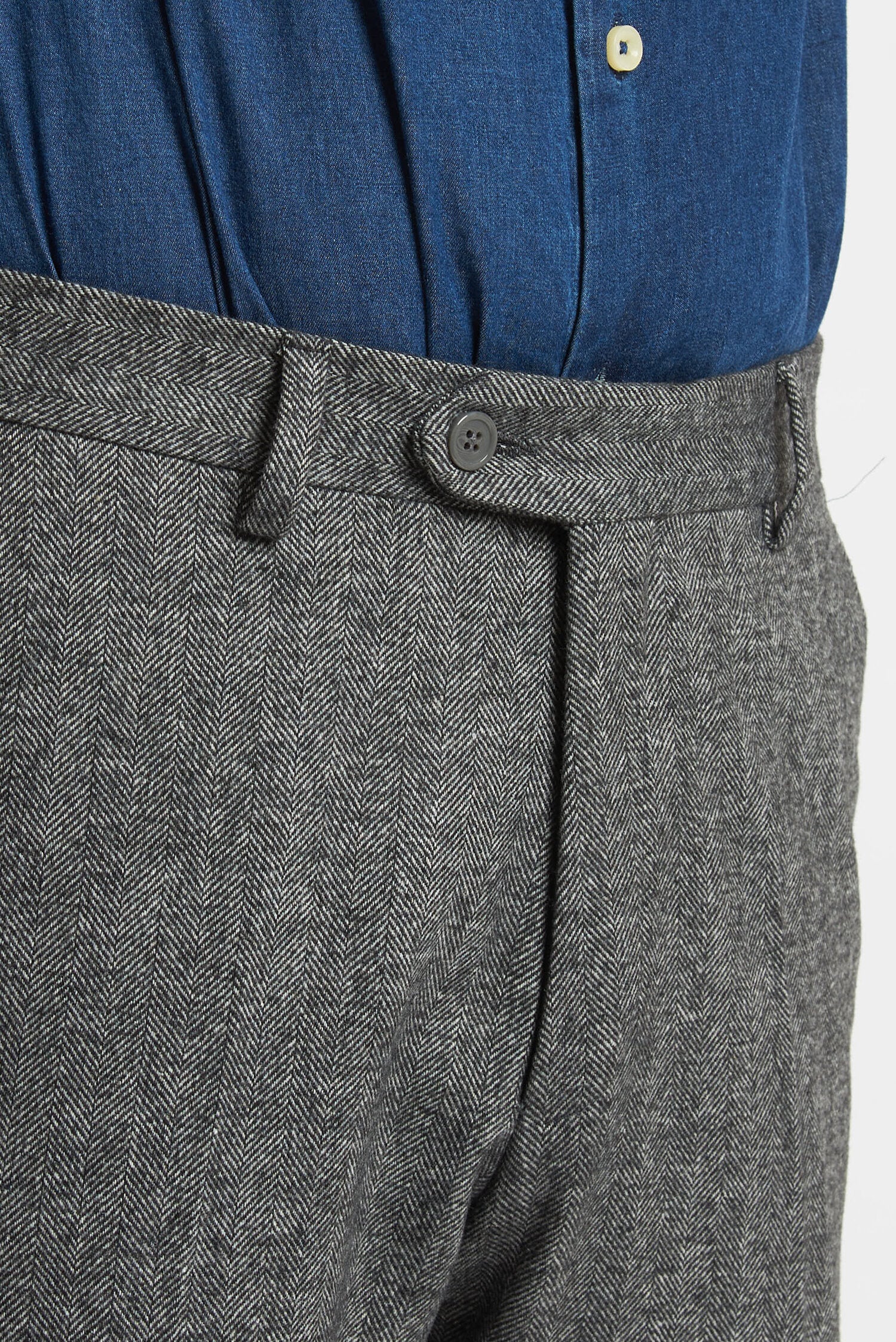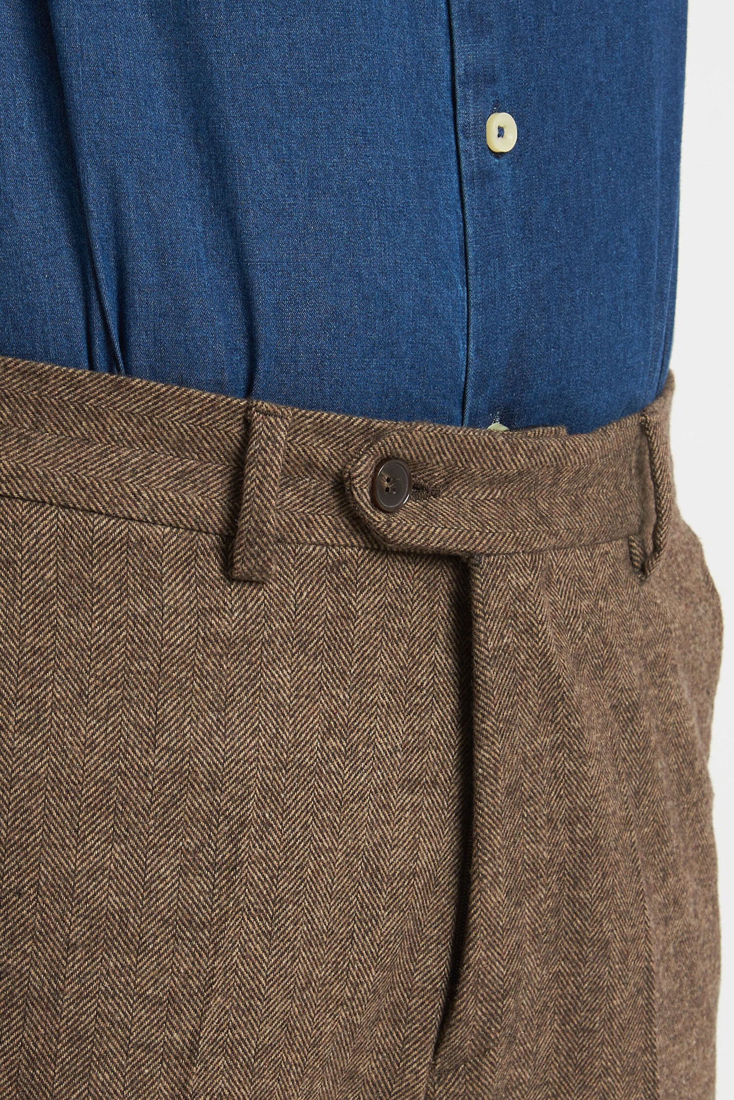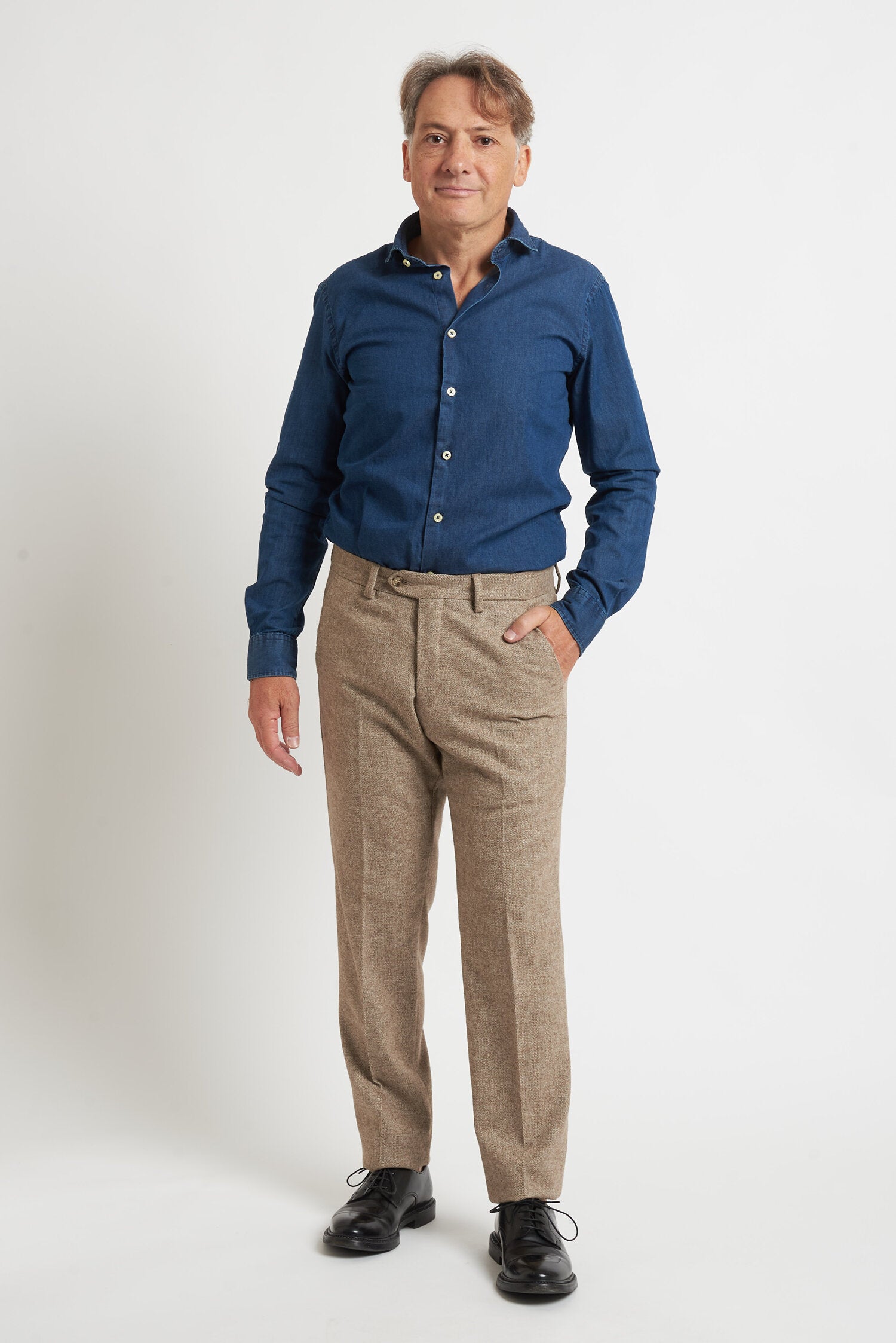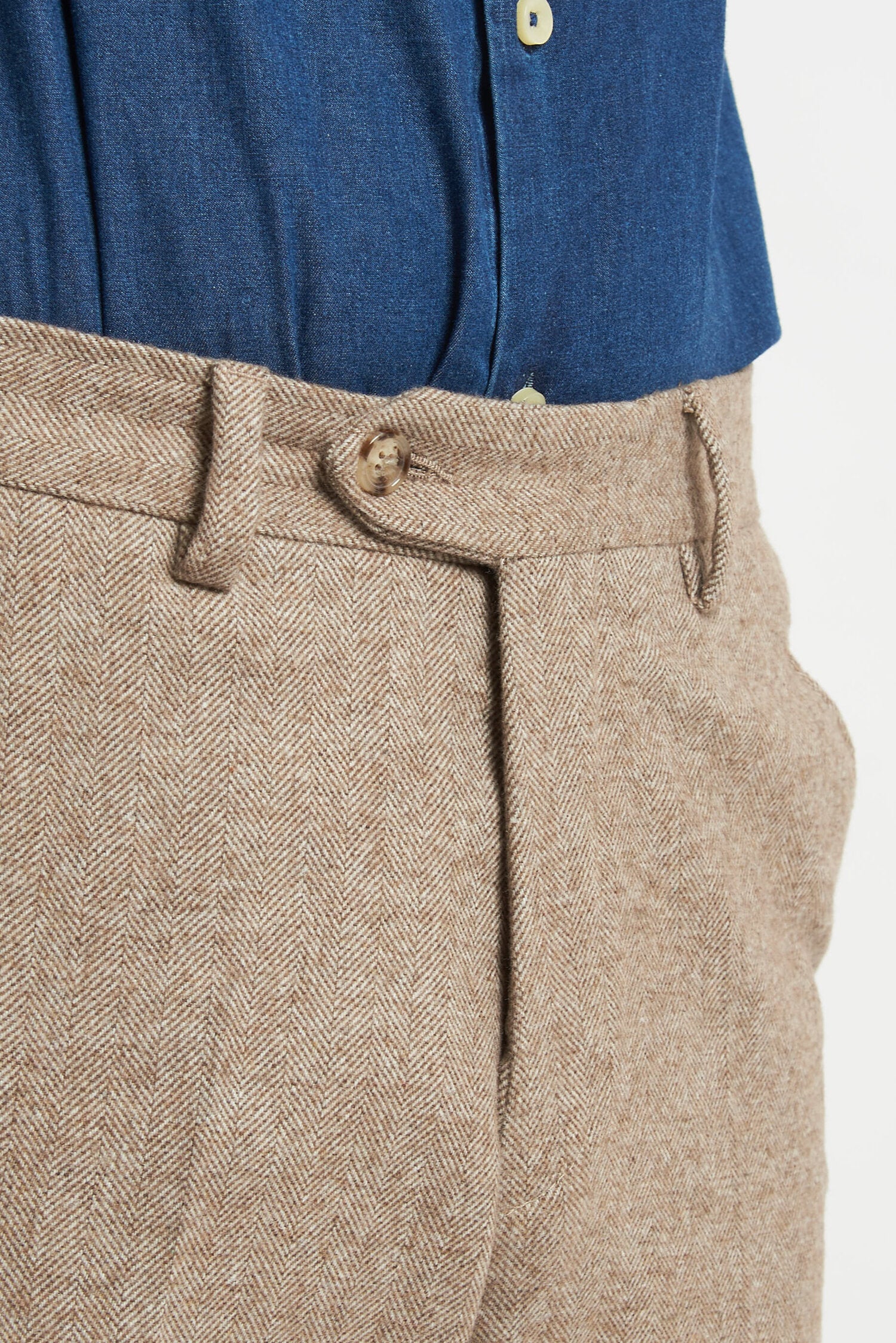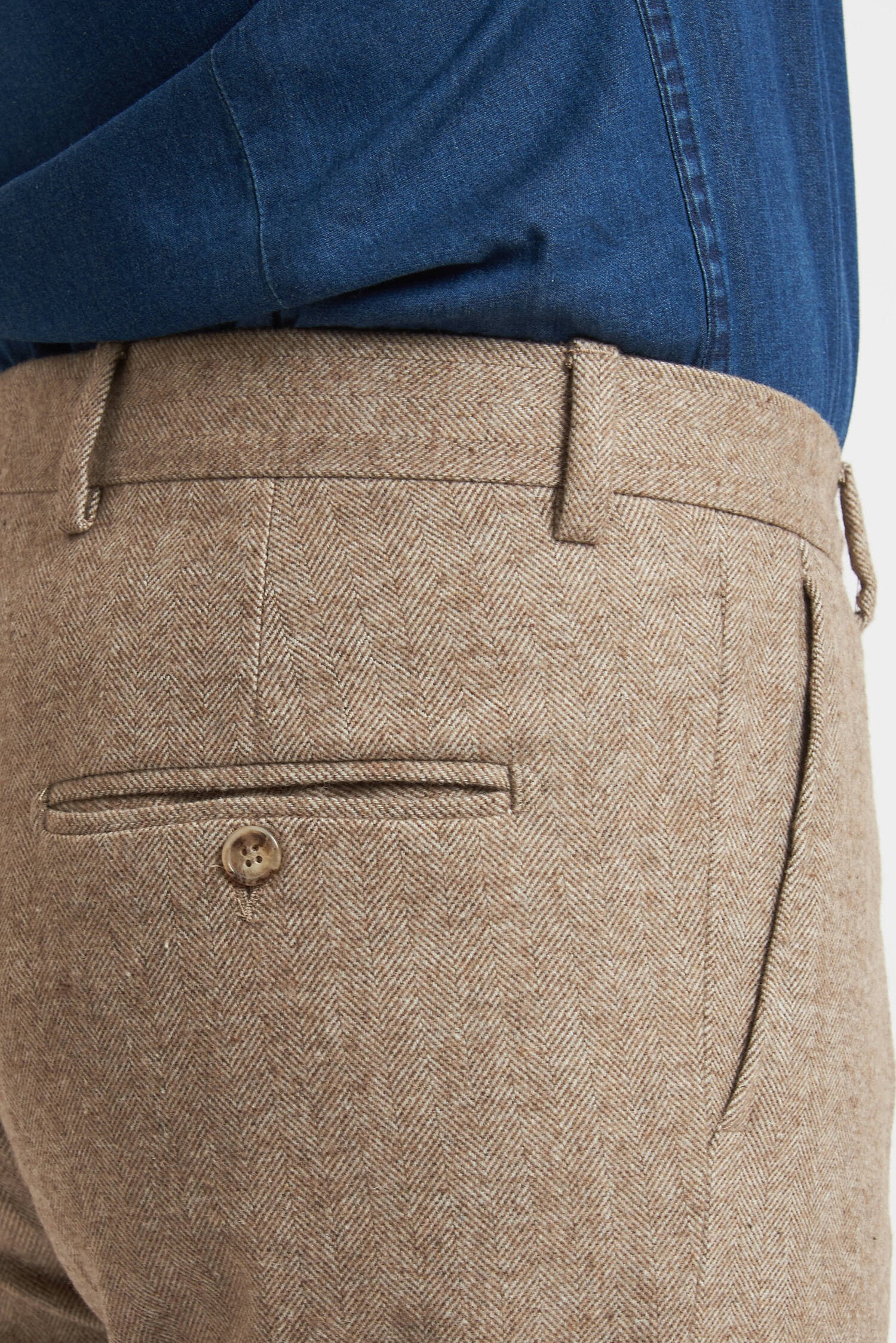 Pantaloni Consorti Milano modello chino in trama spigata, realizzati in pregiata lana. Hanno un fit comodo perchè il tessuto è composto anche da una piccola percentuale di elastan. Ai lati realizzati con tasca all'americana e dietro con tasca con profilo a soffietto e bottone. La vestibilità è asciutta. Composizione: lana - viscosa - elastan.