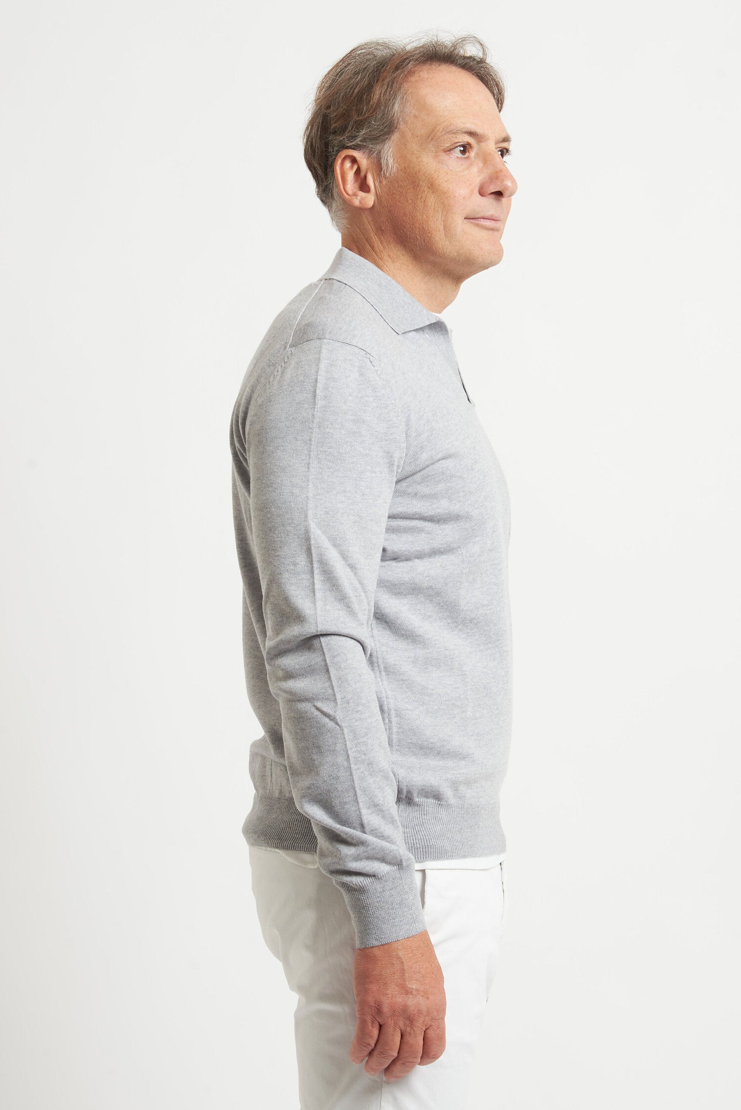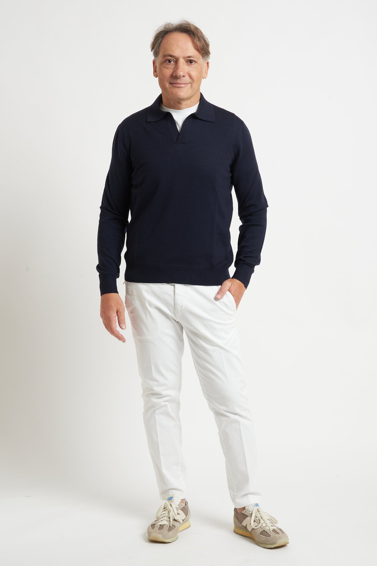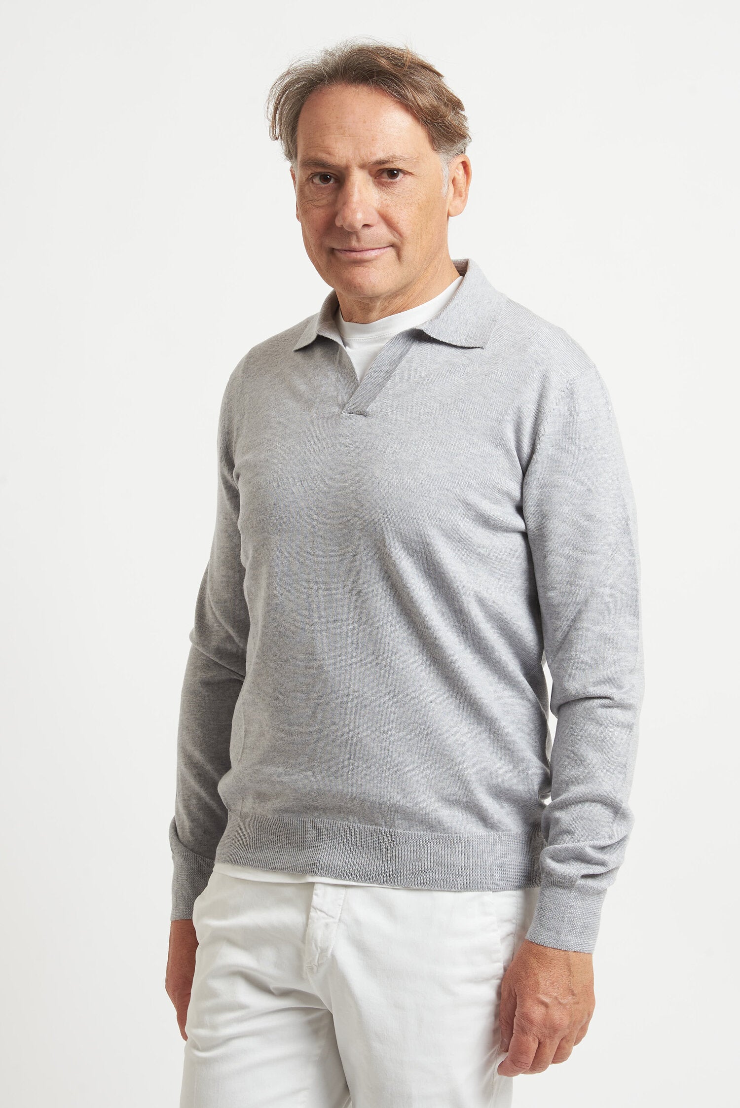 Polo con collo derby, senza bottoni, della GRAN SASSO, realizzato in soffice e preziosissimo filato di lana merino extrafine, che gli conferisce un effetto setoso. Un capo raffinato da risultare casual ed elegante allo stesso tempo, e che può essere indossato anche come sottogiacca. Spessore di consistenza media lavorato in finezza 12. Vestibilità regolare. Composizione: 1000% lana merinos extrafine.