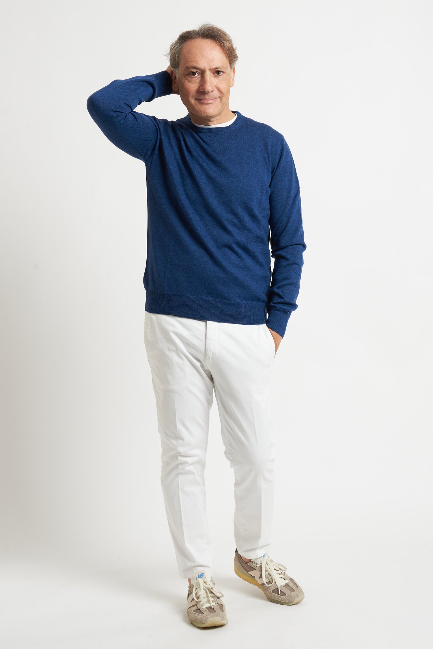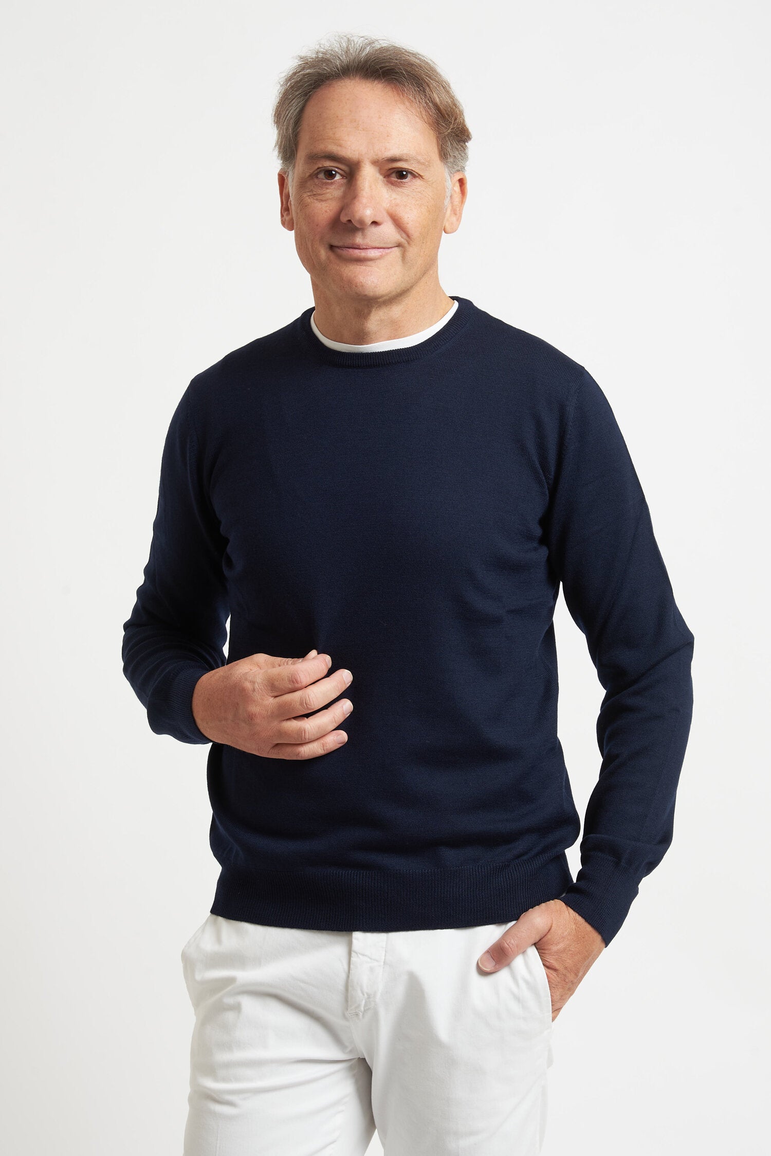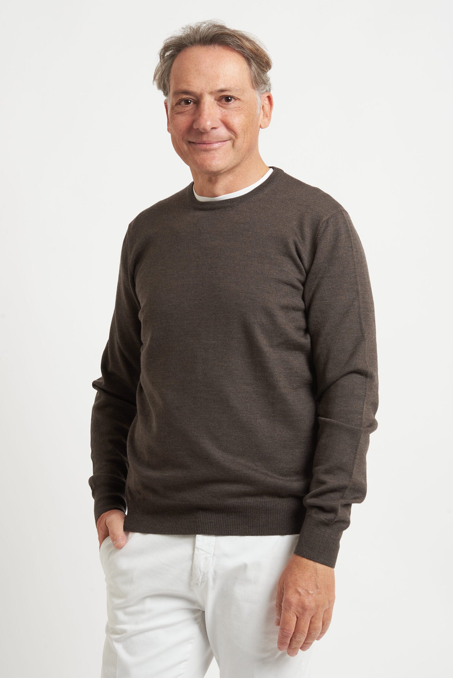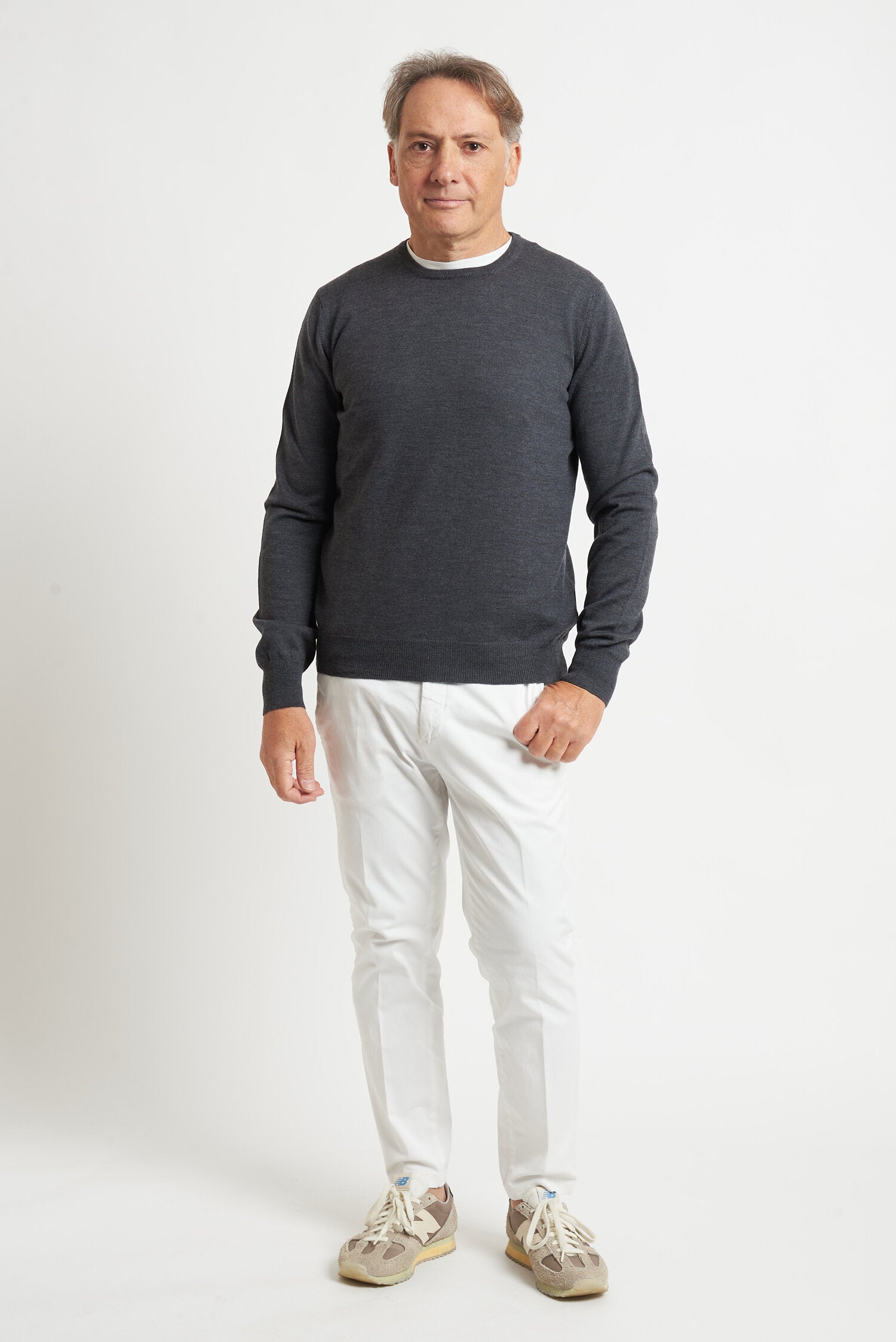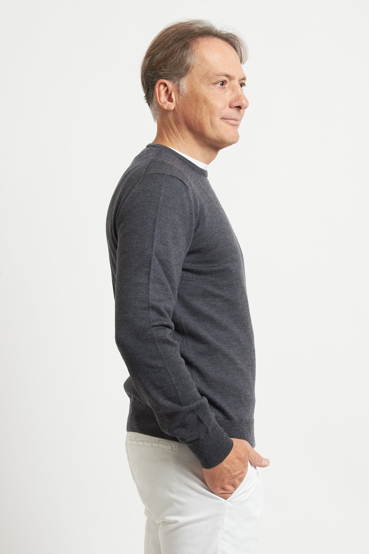 Pullover girocollo GRAN SASSO, realizzato in soffice e preziosissimo filato di lana merino extrafine, che gli conferisce un effetto setoso. Un capo raffinato da risultare casual ed elegante allo stesso tempo, e che può essere indossato anche come sottogiacca. Spessore di consistenza media lavorato in finezza 12. Vestibilità regolare. Composizione: 1000% lana merinos extrafine.