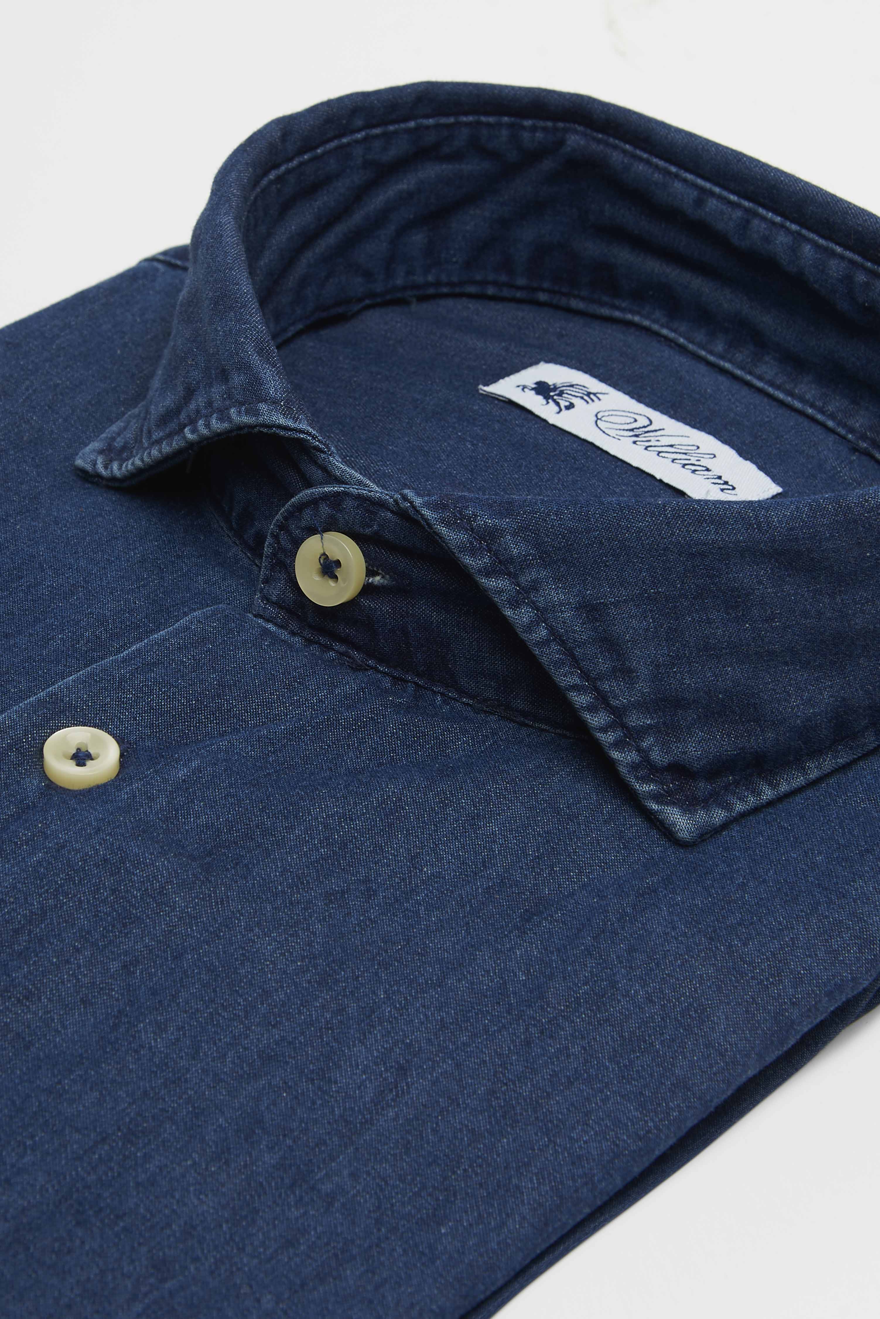 Camicia in denim WILLIAM realizzata in puro cotone di alta qualità. Il collo è modello francese con pistagna di 3,5 cm di altezza, morbido e con stecche interne. La vestibilità è semi slim. Composizione: 1000% cotone